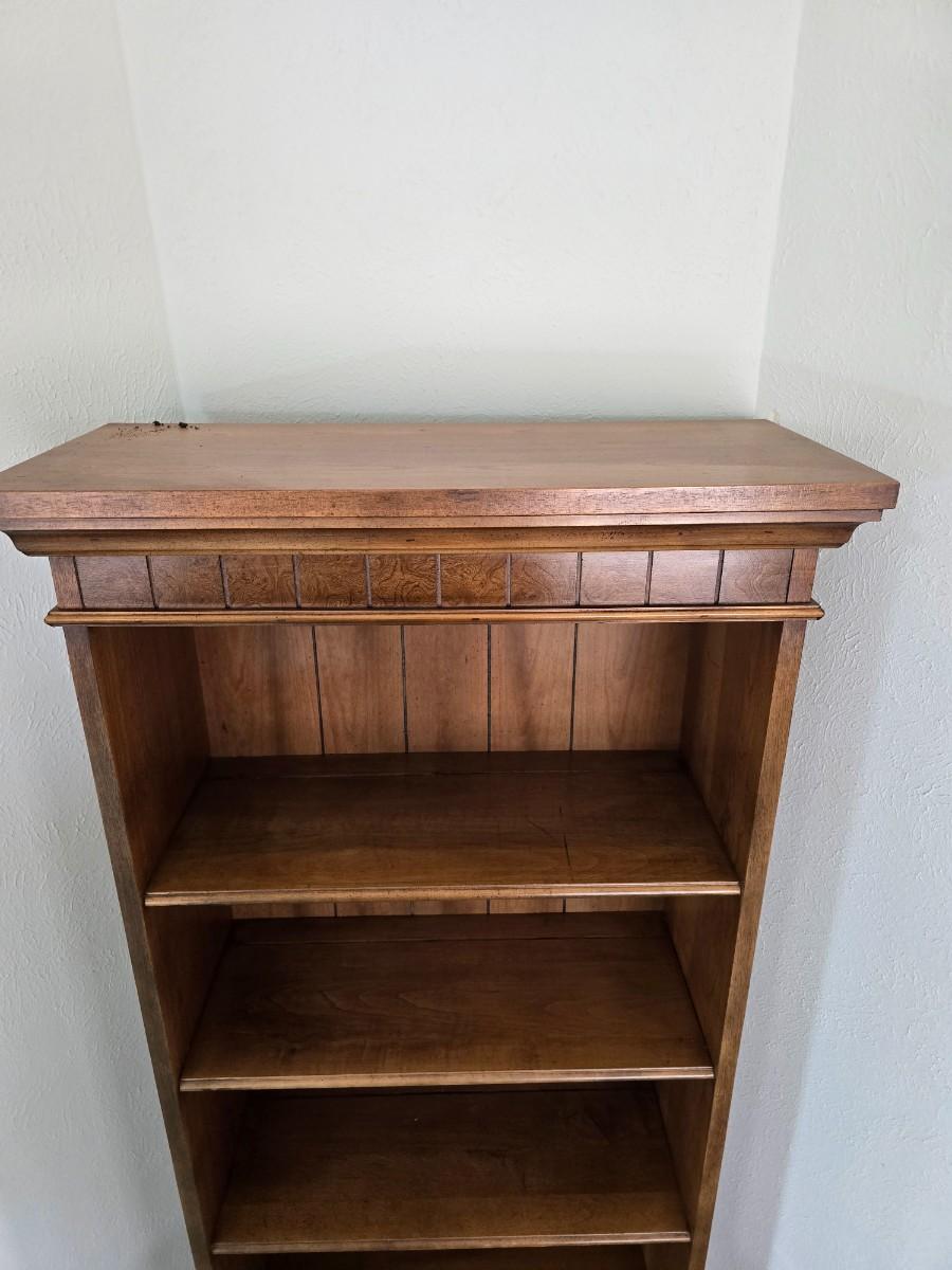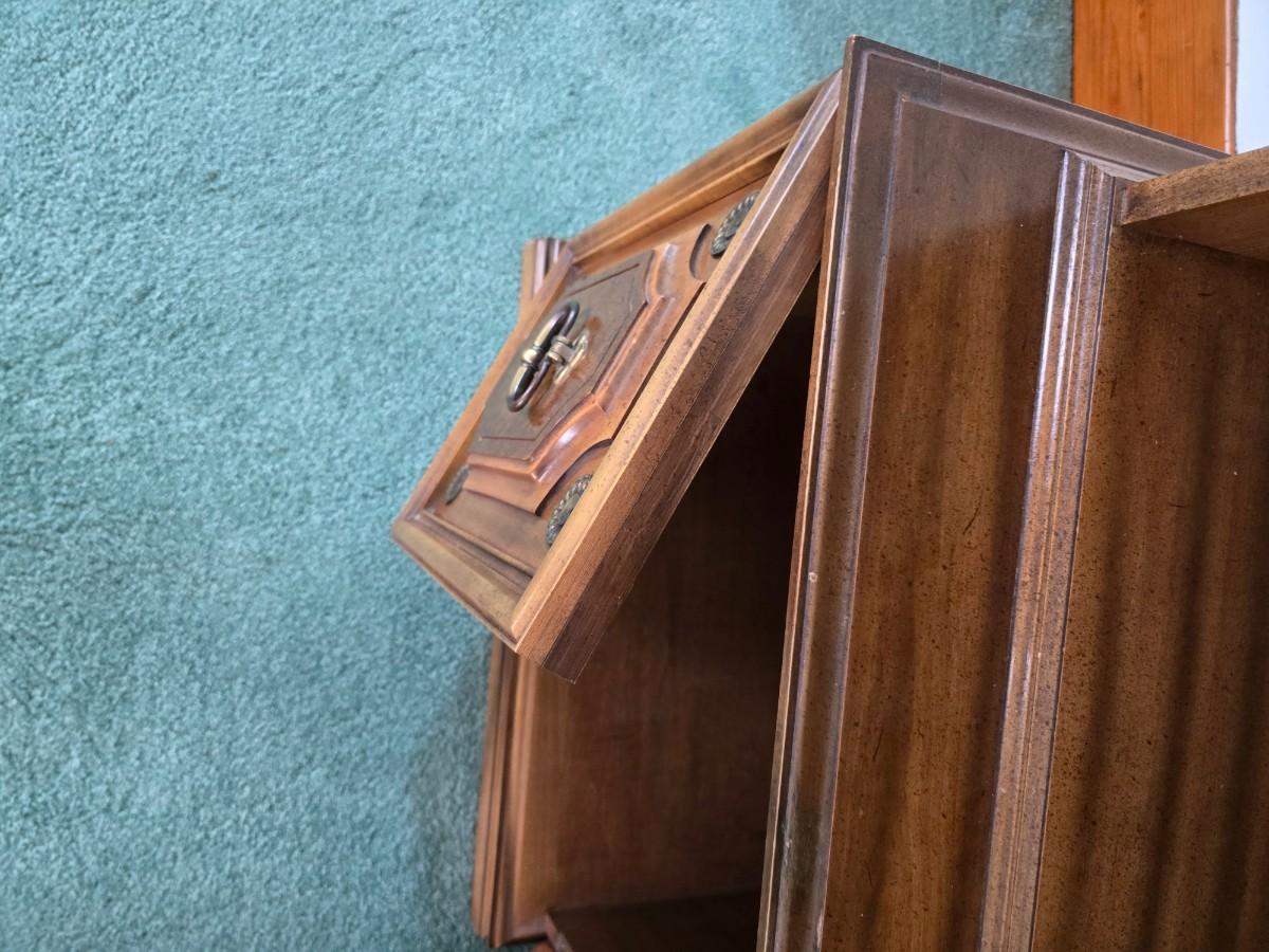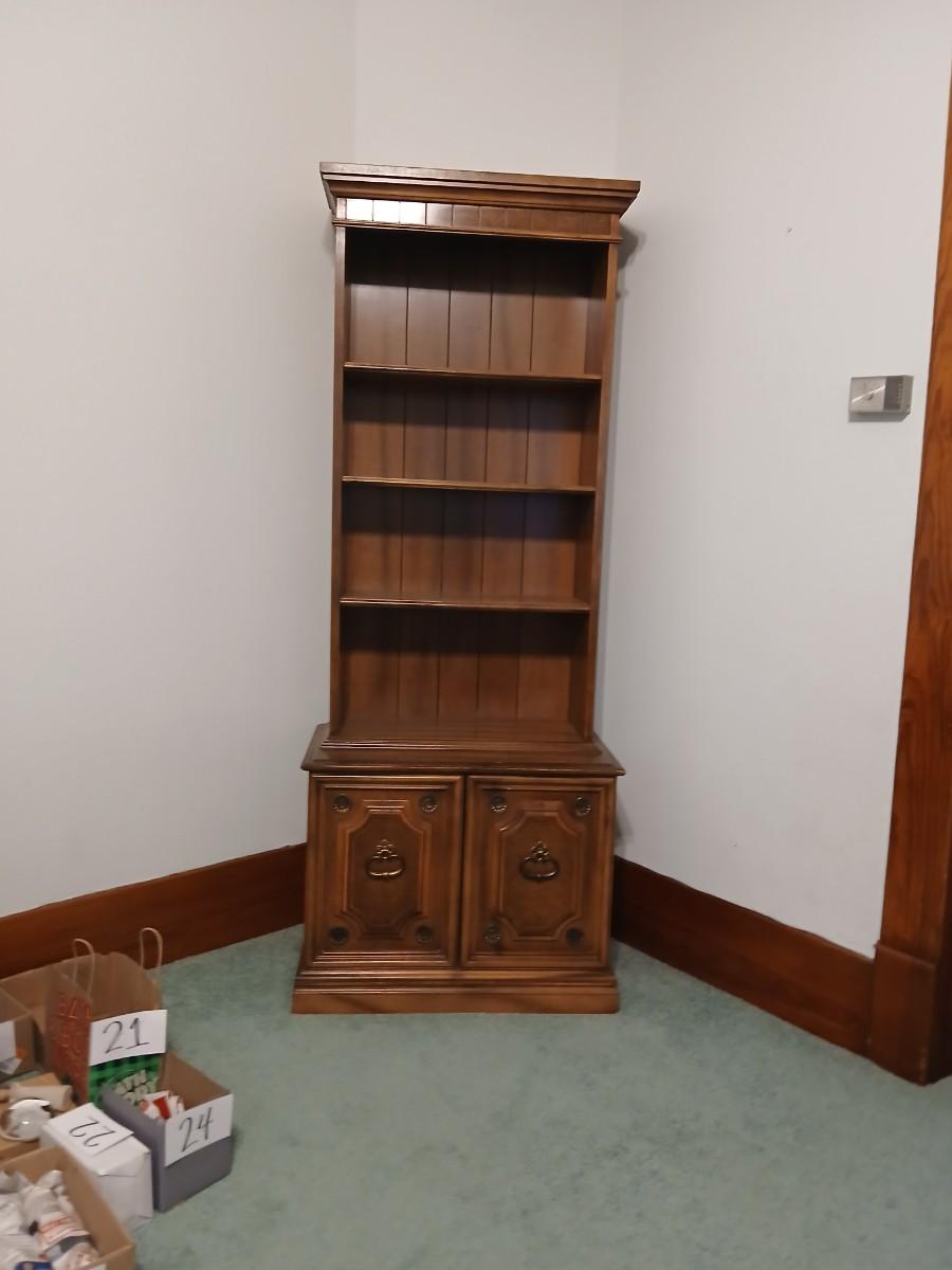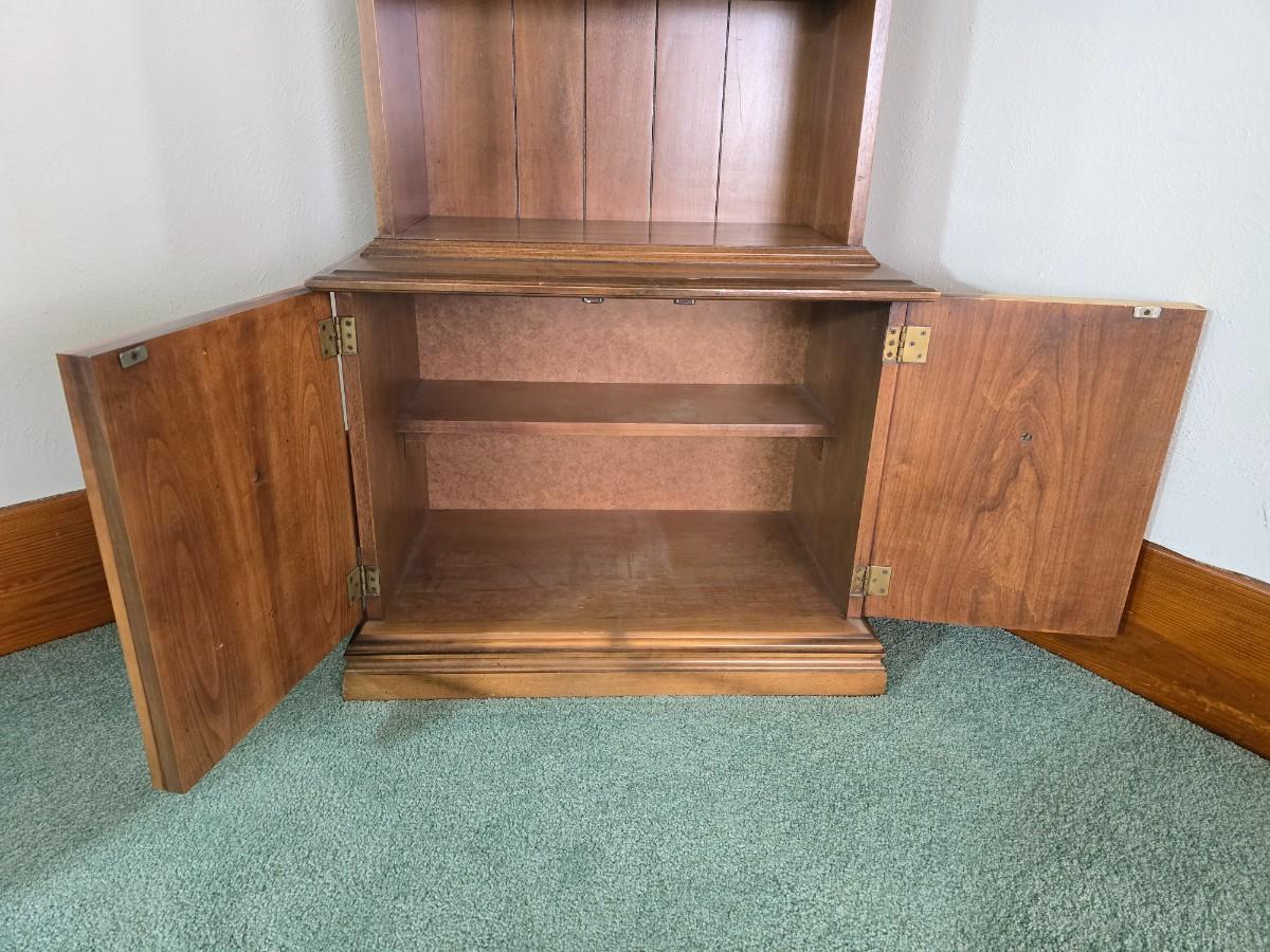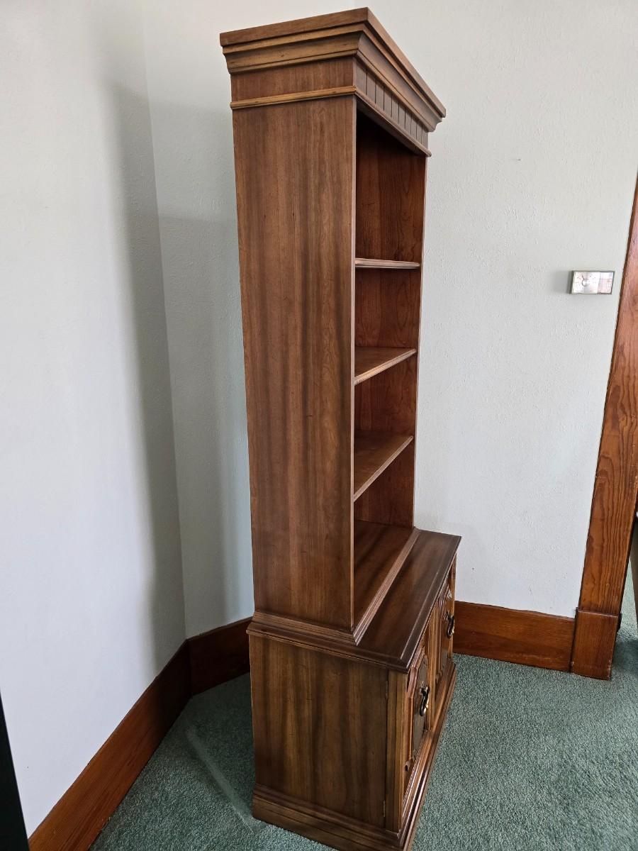 Vintage Chinoiserie library bookcase cabinet with upper shelves and a lower cabinet.