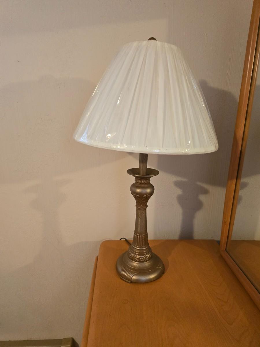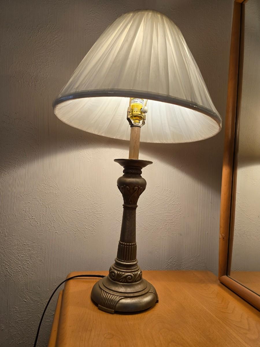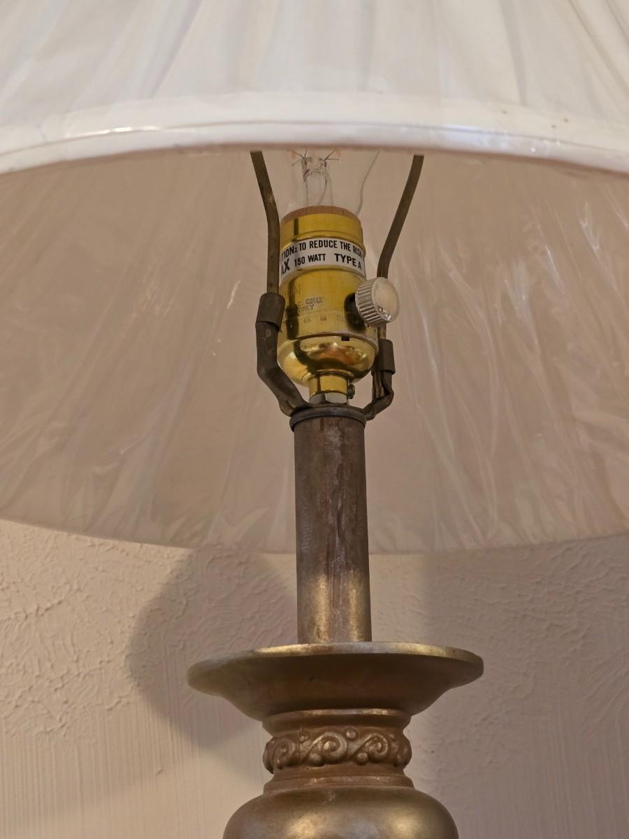 28" traditional-style brass table lamp with an ornate base and a white pleated shade