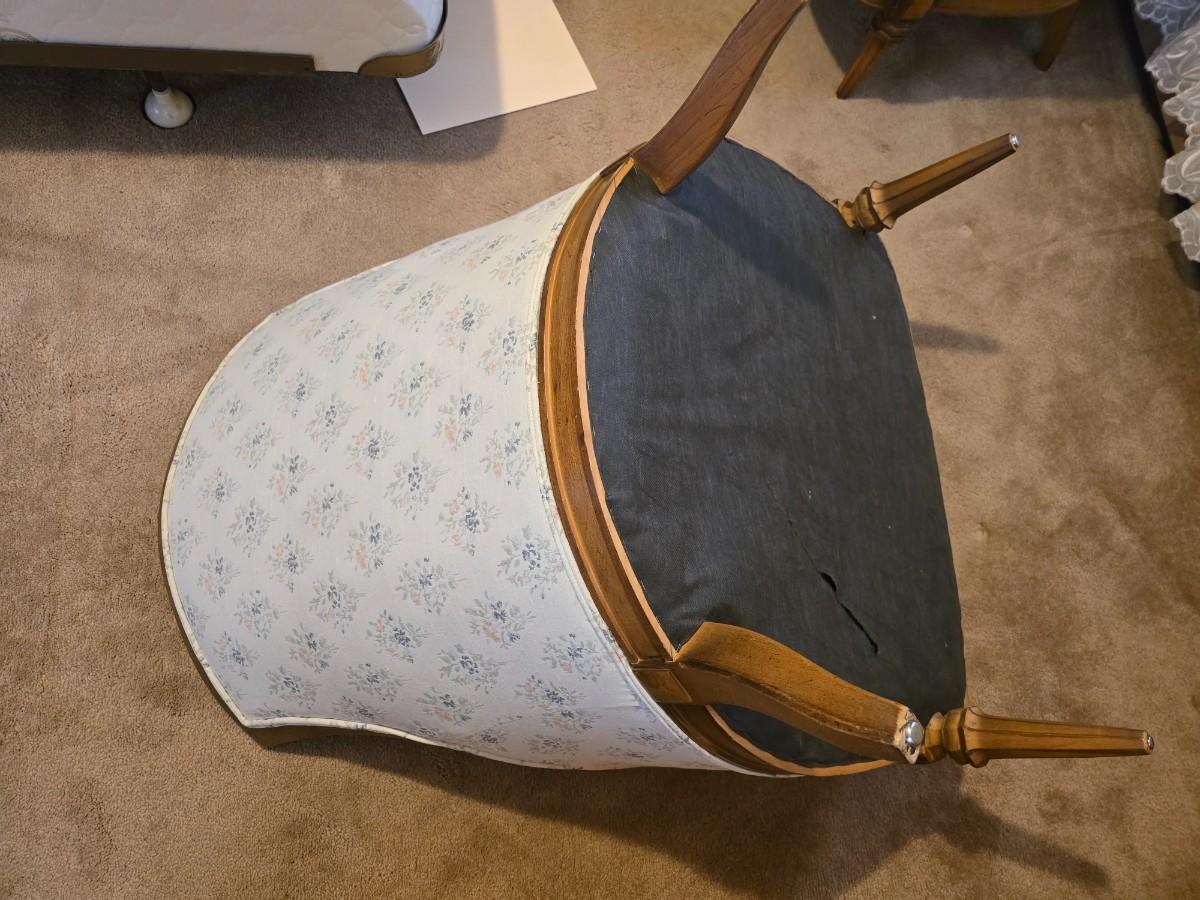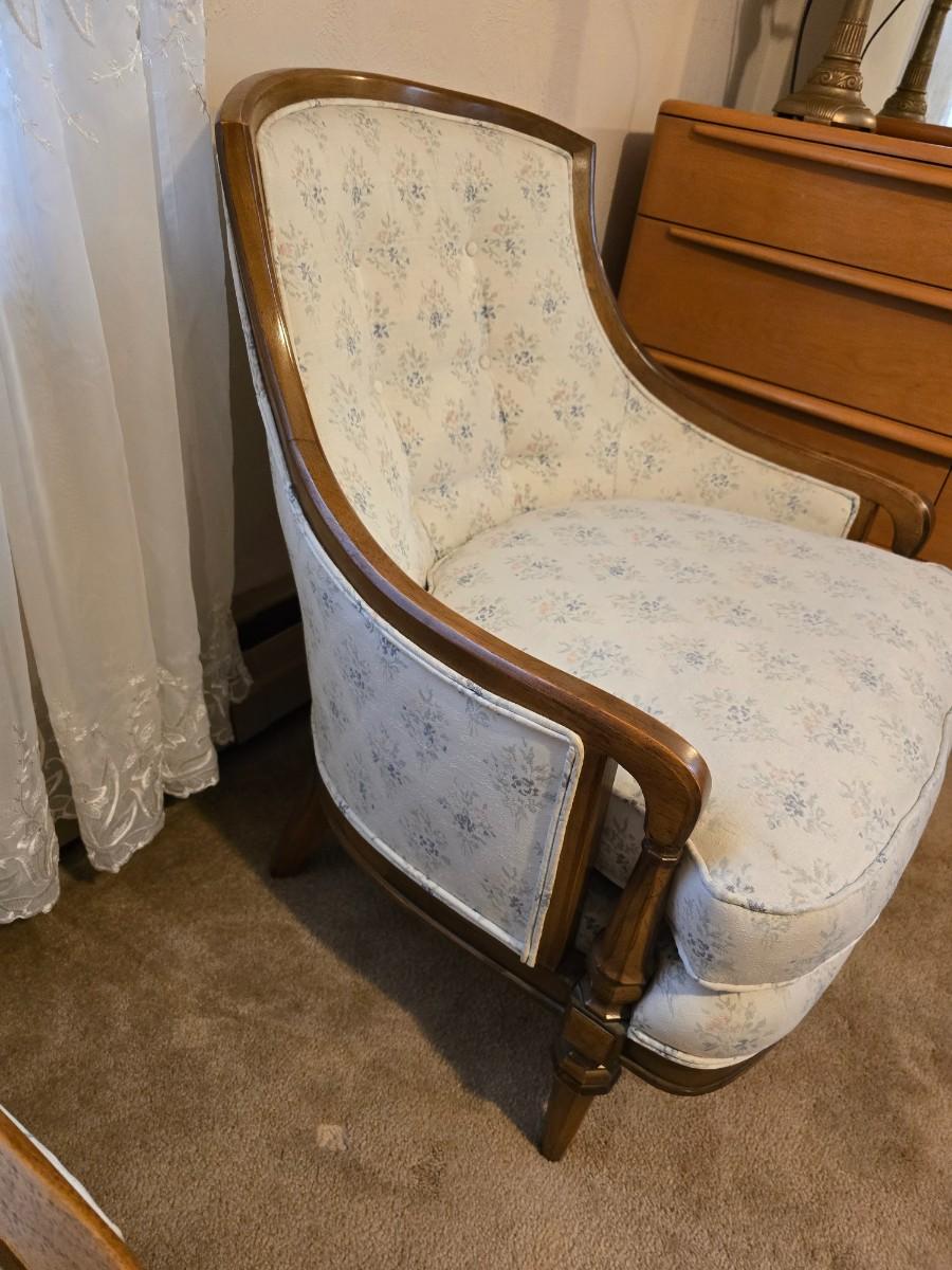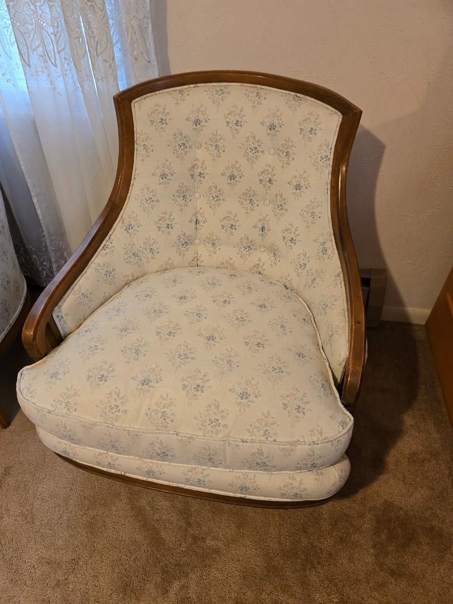 late 1960s armchair with a walnut frame and light-colored floral upholstery.
