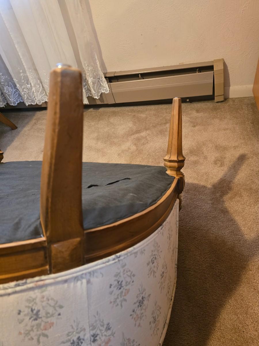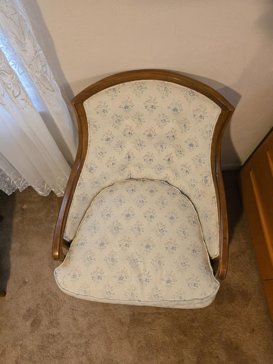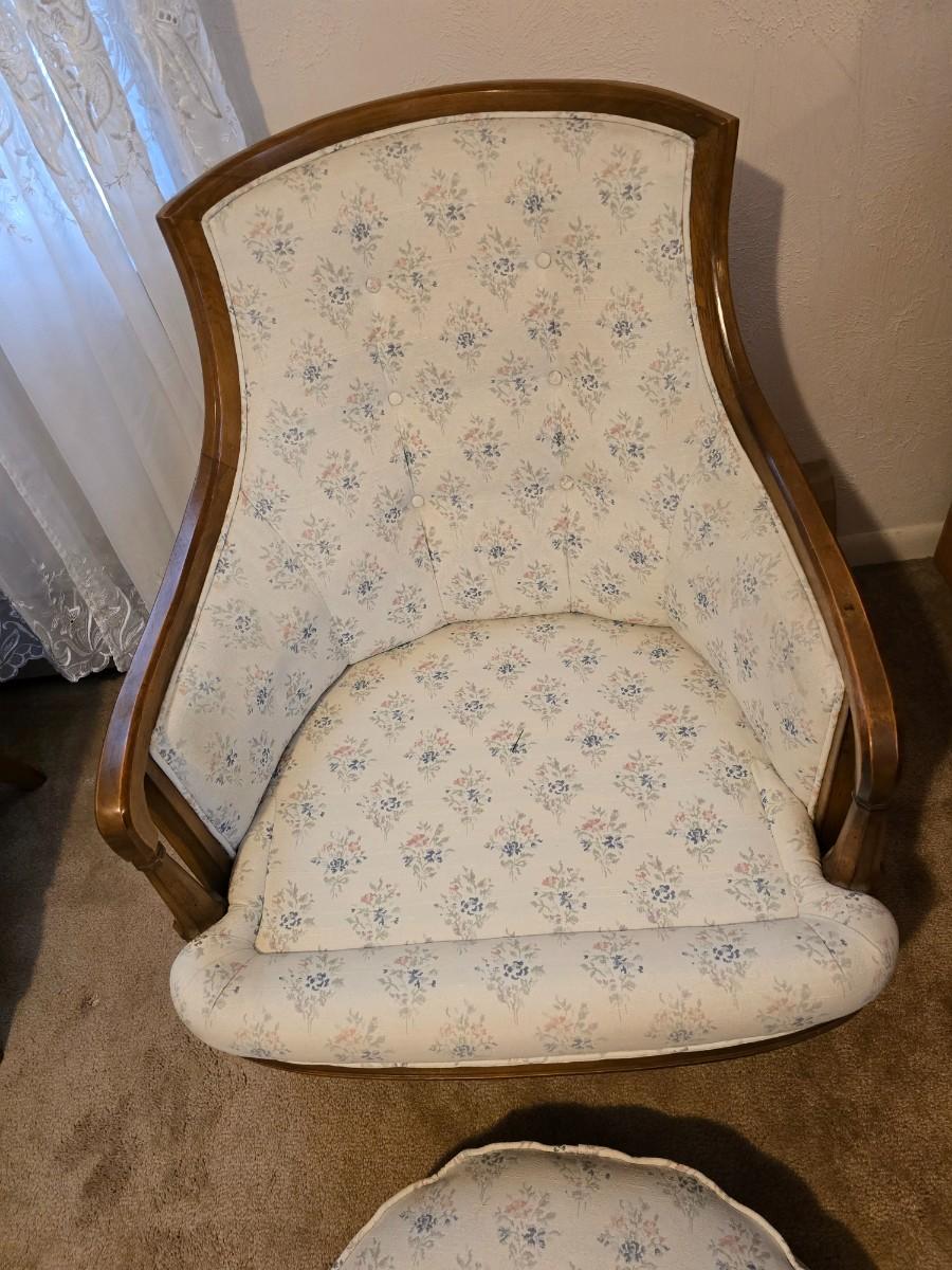 late 1960s armchair with a walnut frame and light-colored floral upholstery.