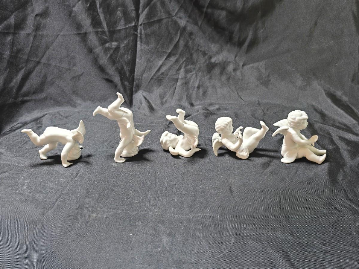 A set of five white glazed or bisque porcelain figurines depicting cherubs or angels in various tumbling and playing poses.