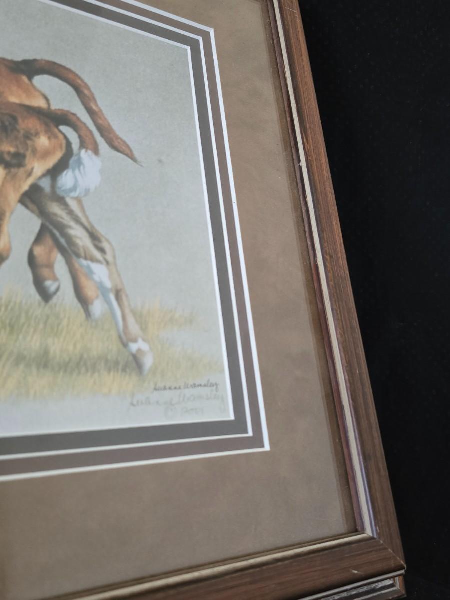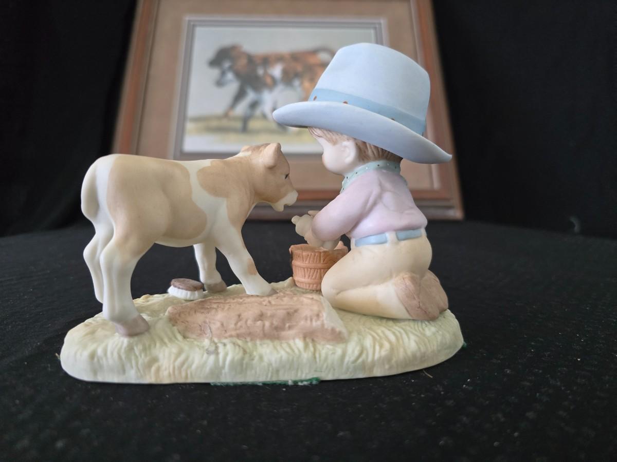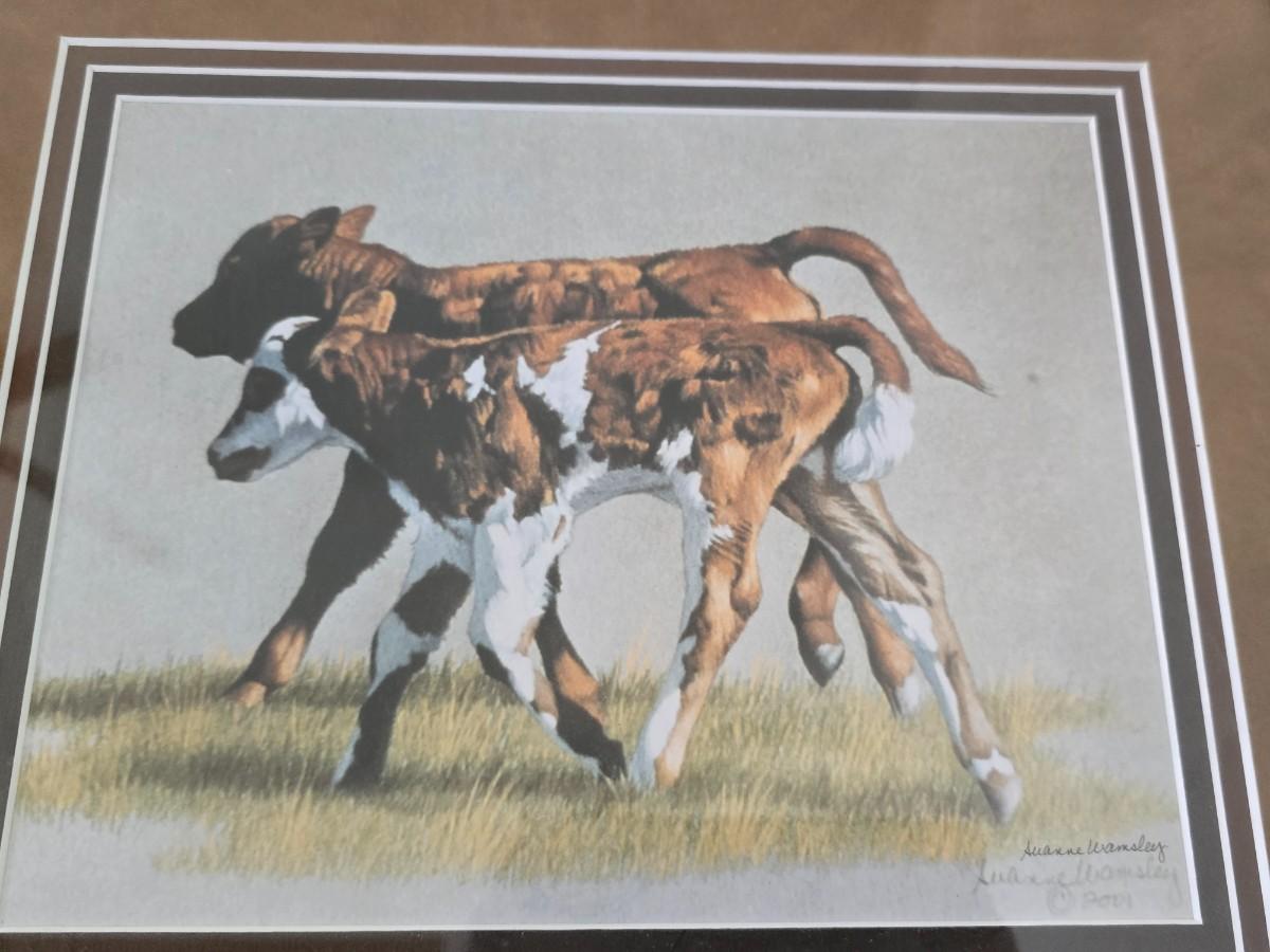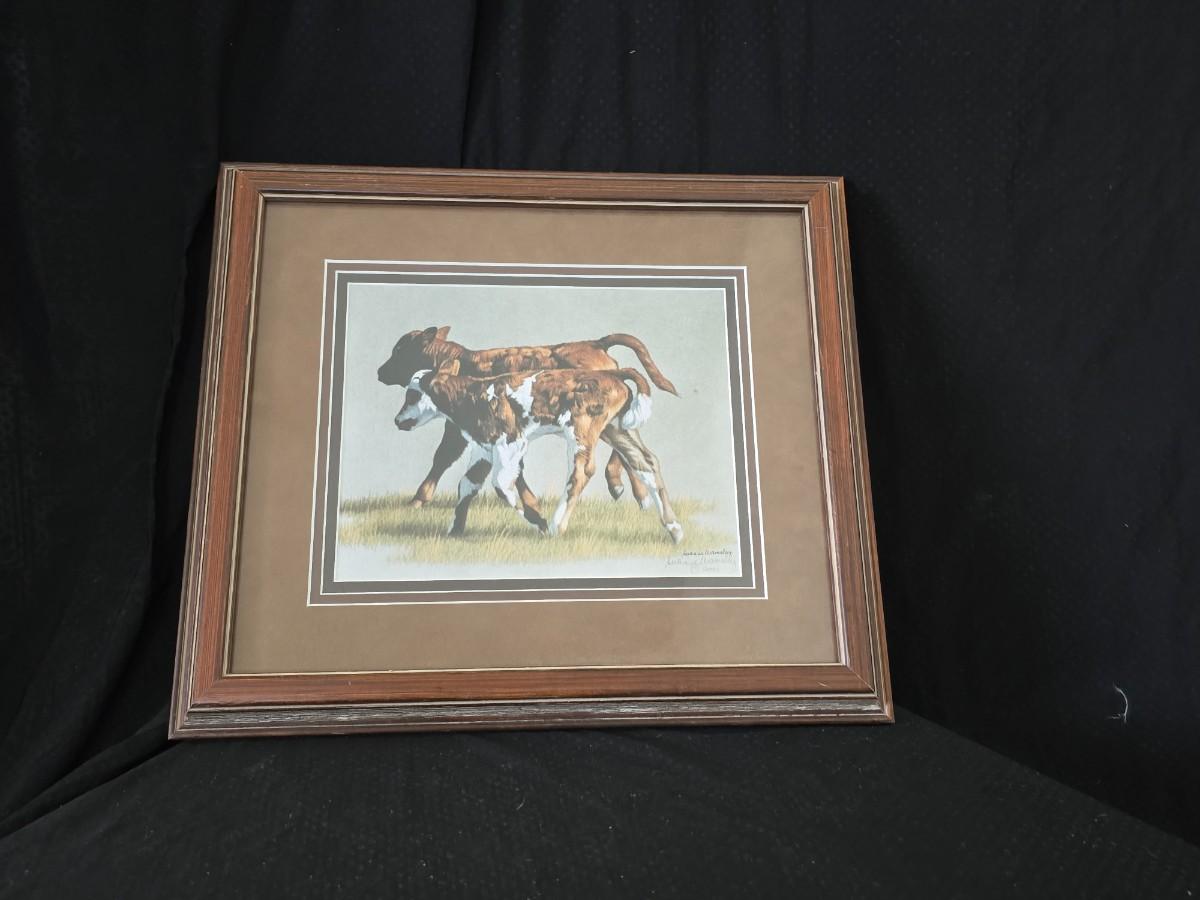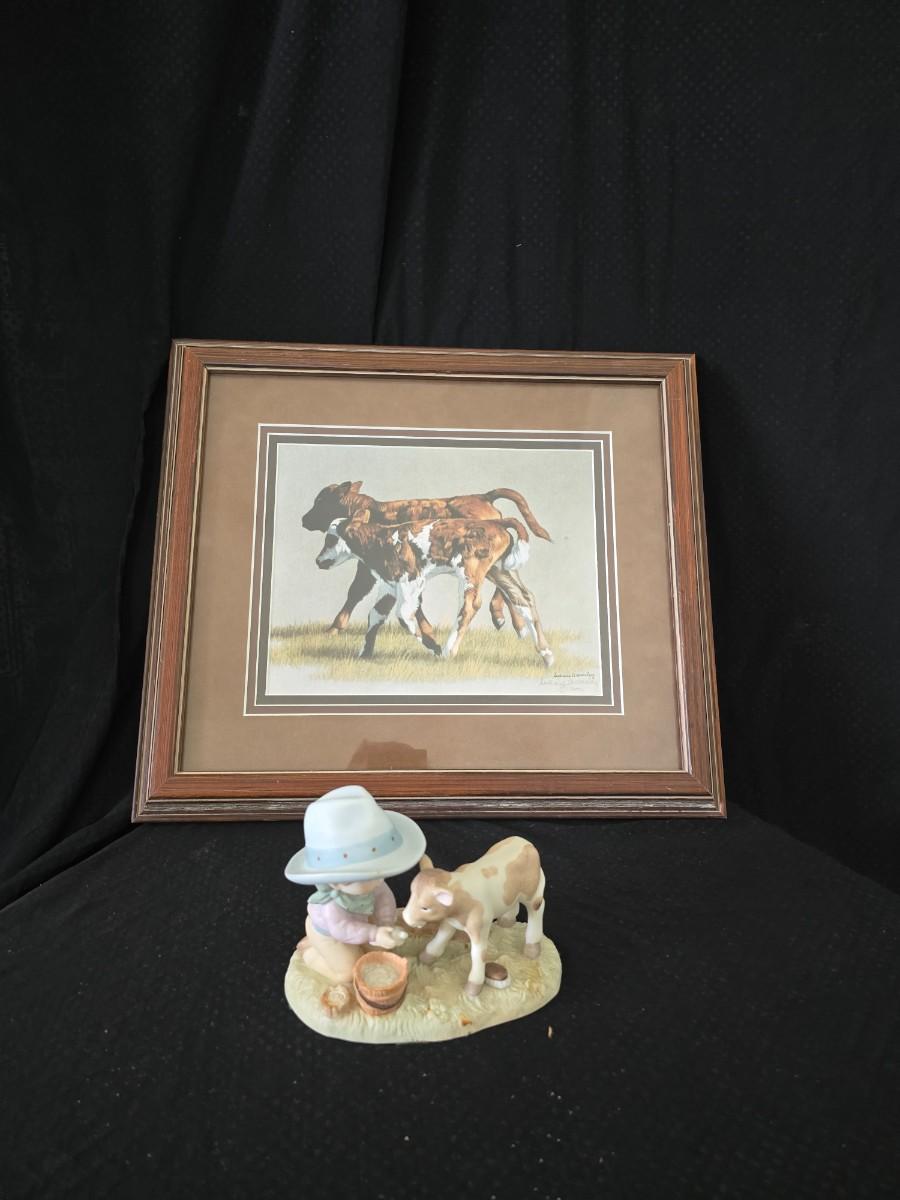 2001 Suanne Wamsley framed & signed calf artwork and 1982 Enesco "Kolby" porcelain figure