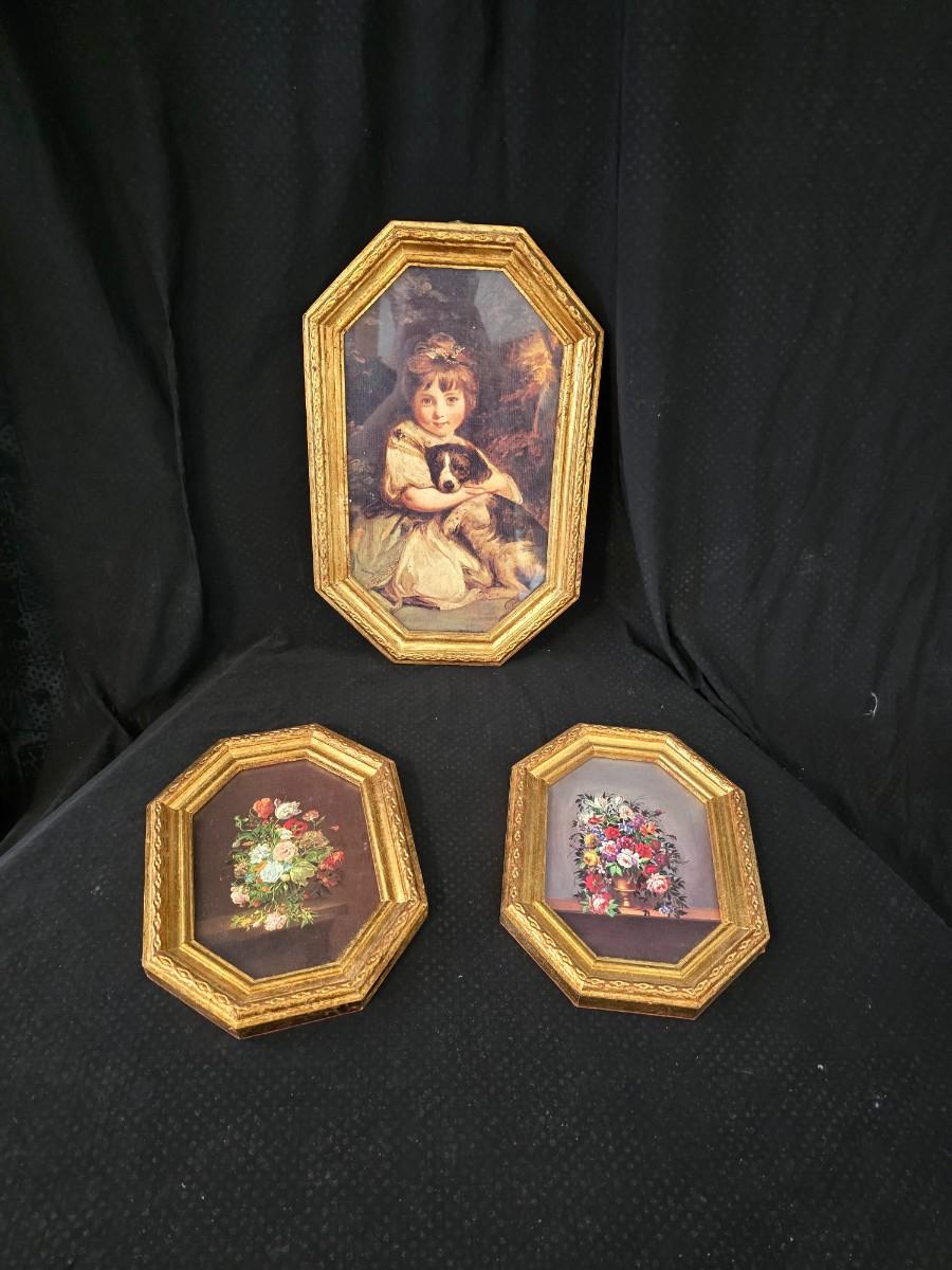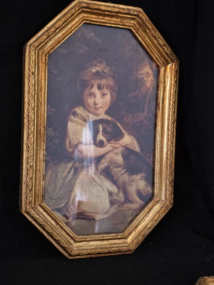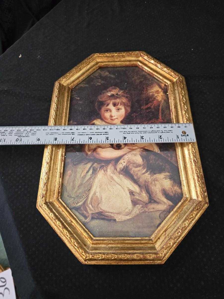 Gold framed Miss Jane Bowles, by the English artist Sir Joshua Reynolds and a pair of vintage Italian Florentine framed floral prints
