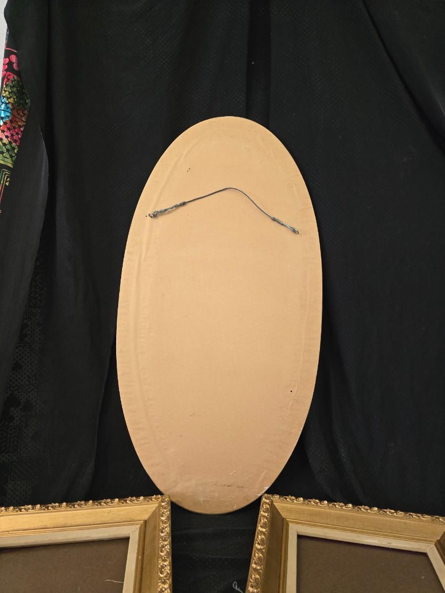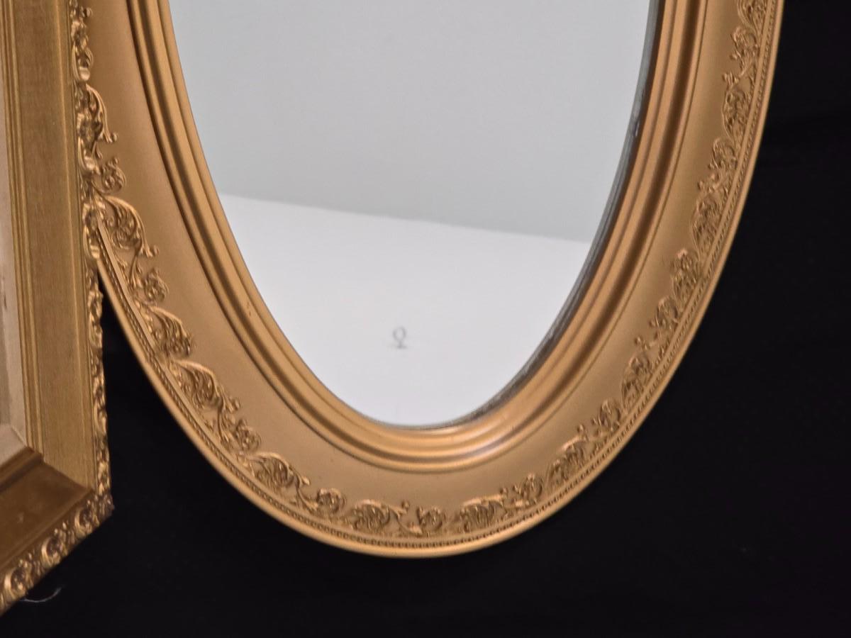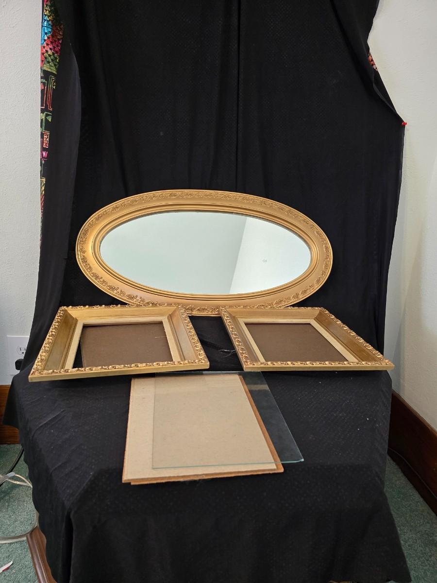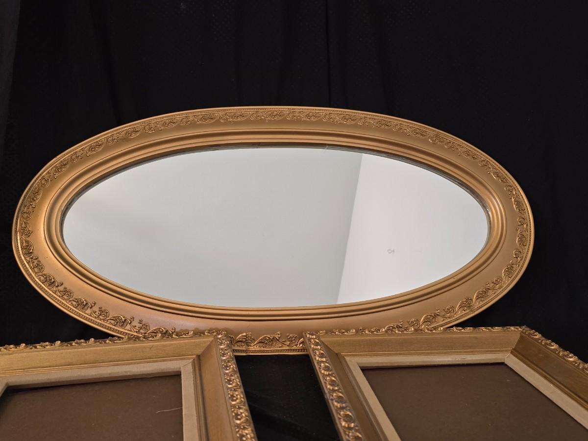 Large oval gold framed mirror with two matching /really close to matching gold decorative picture frames