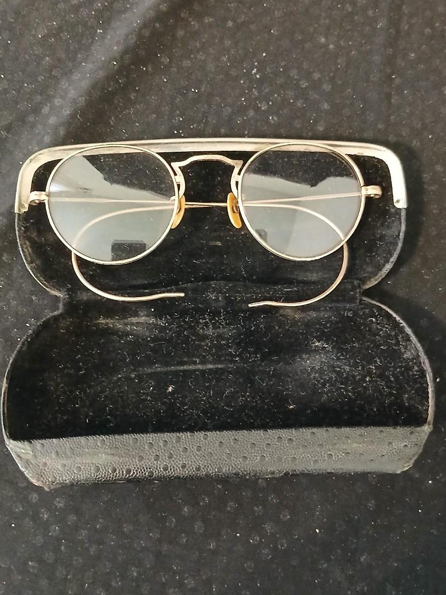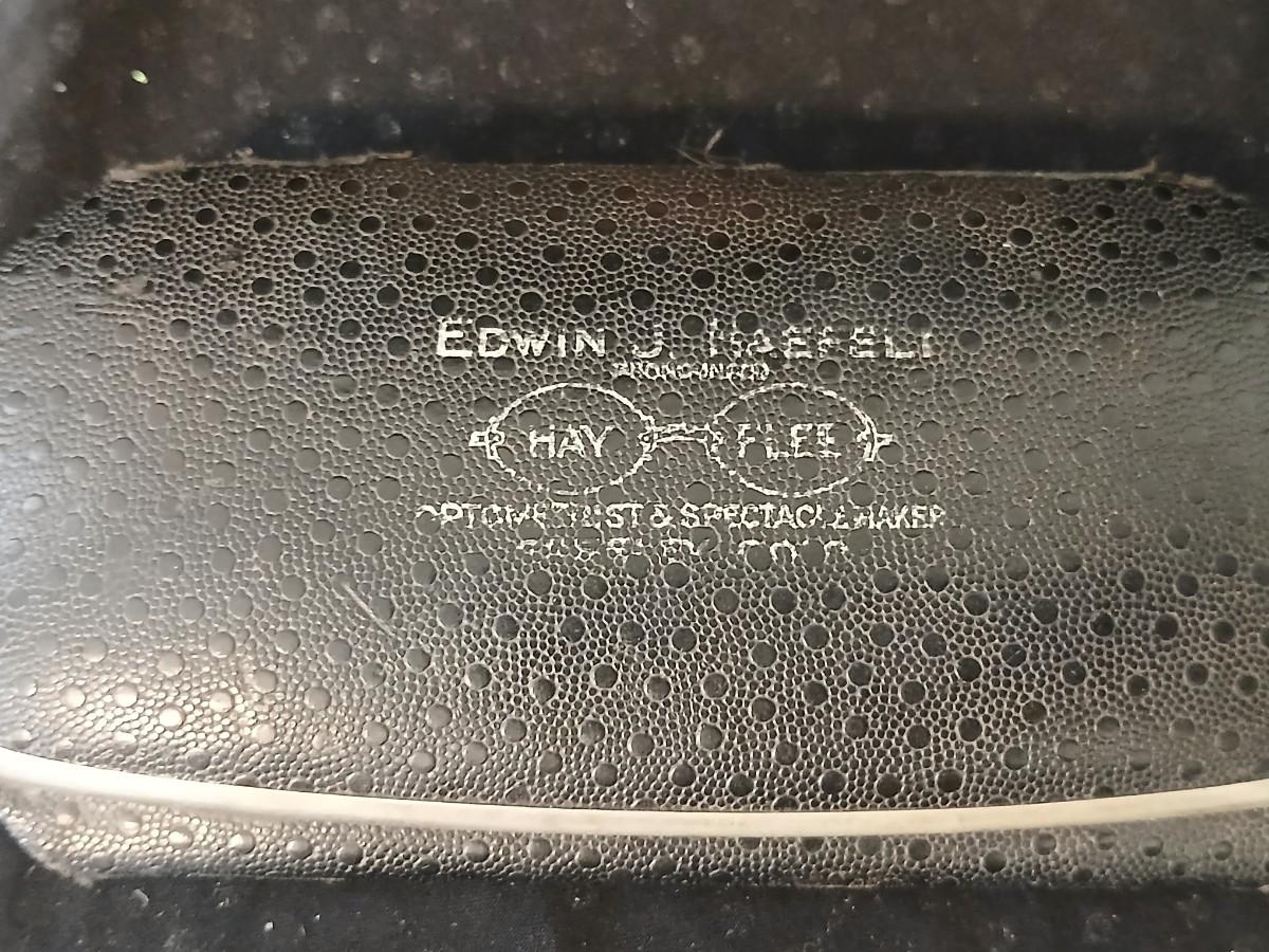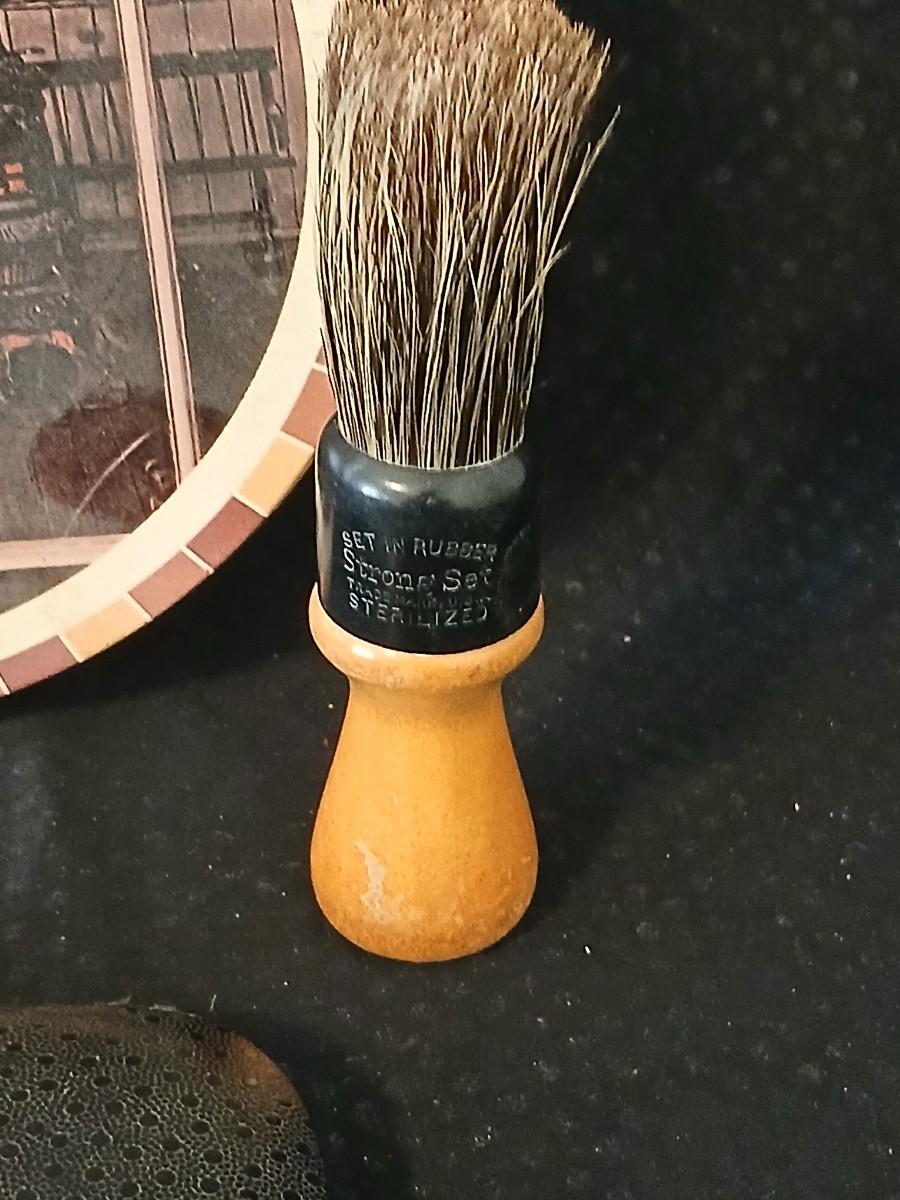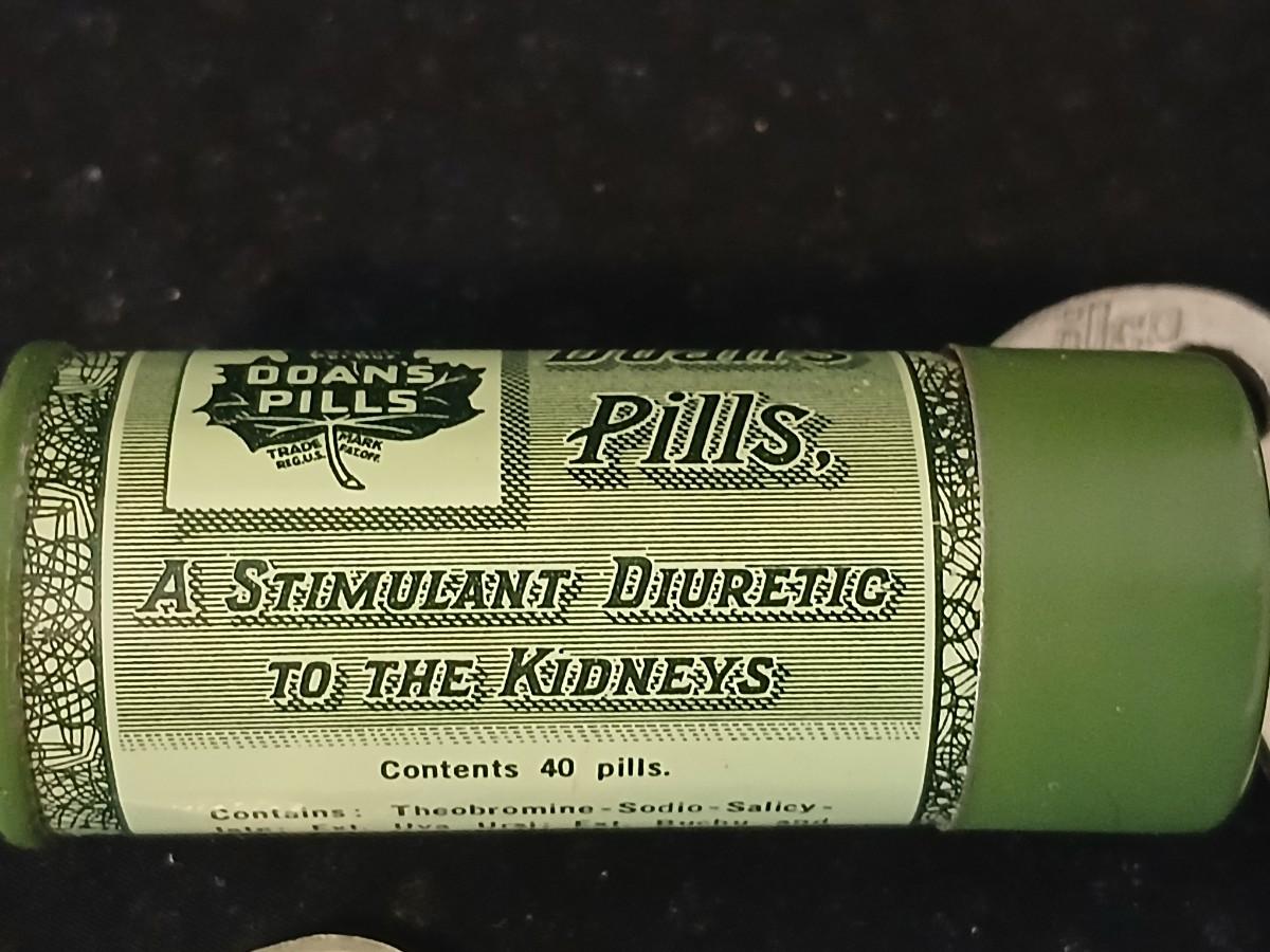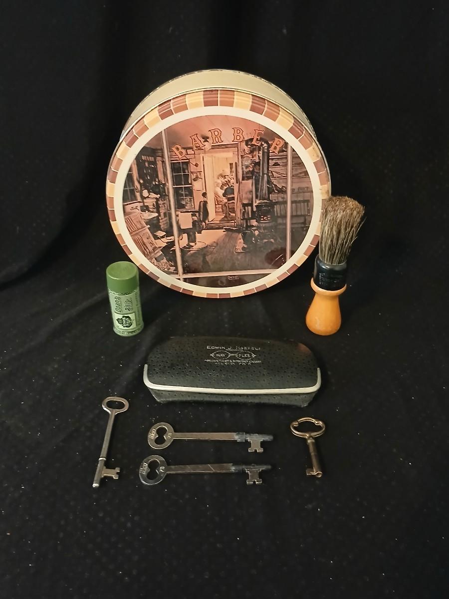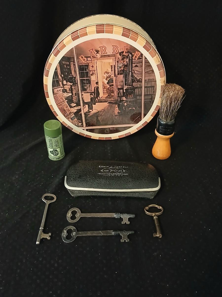 Barber tin with 12 K GF antiques glasses, Doan's pills tin, skeleton keys, Strong set shaving brush,