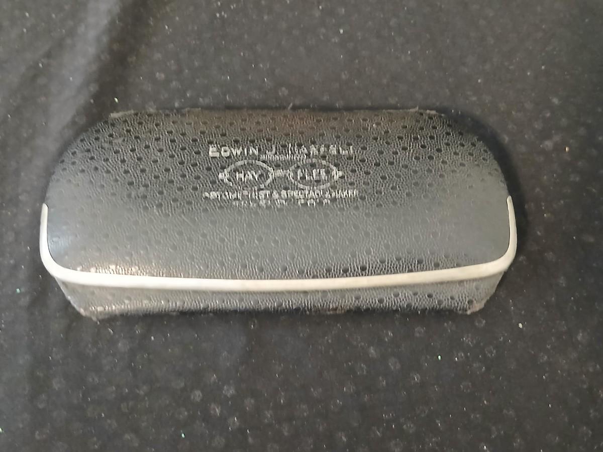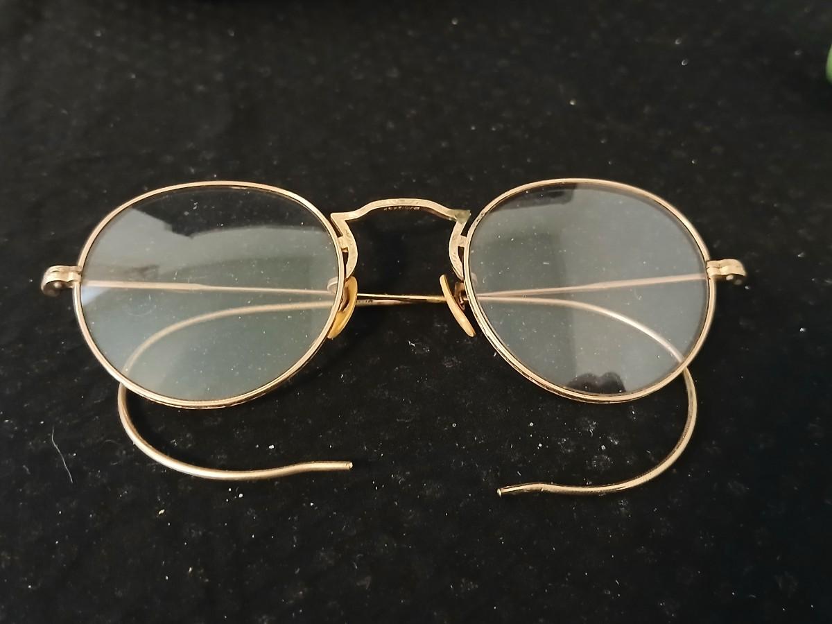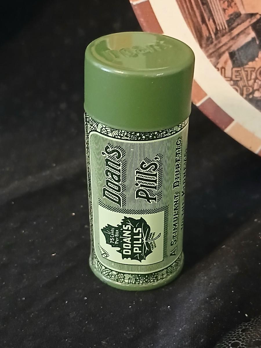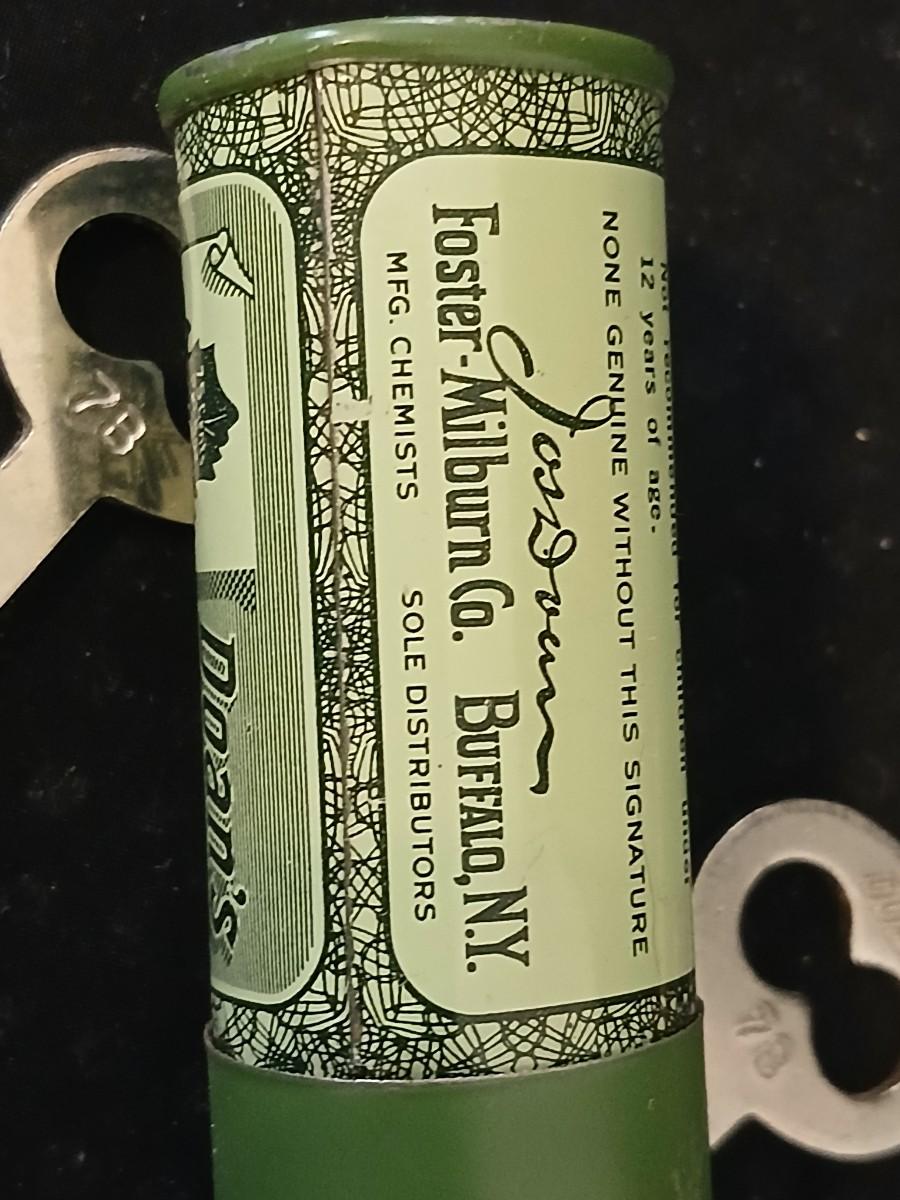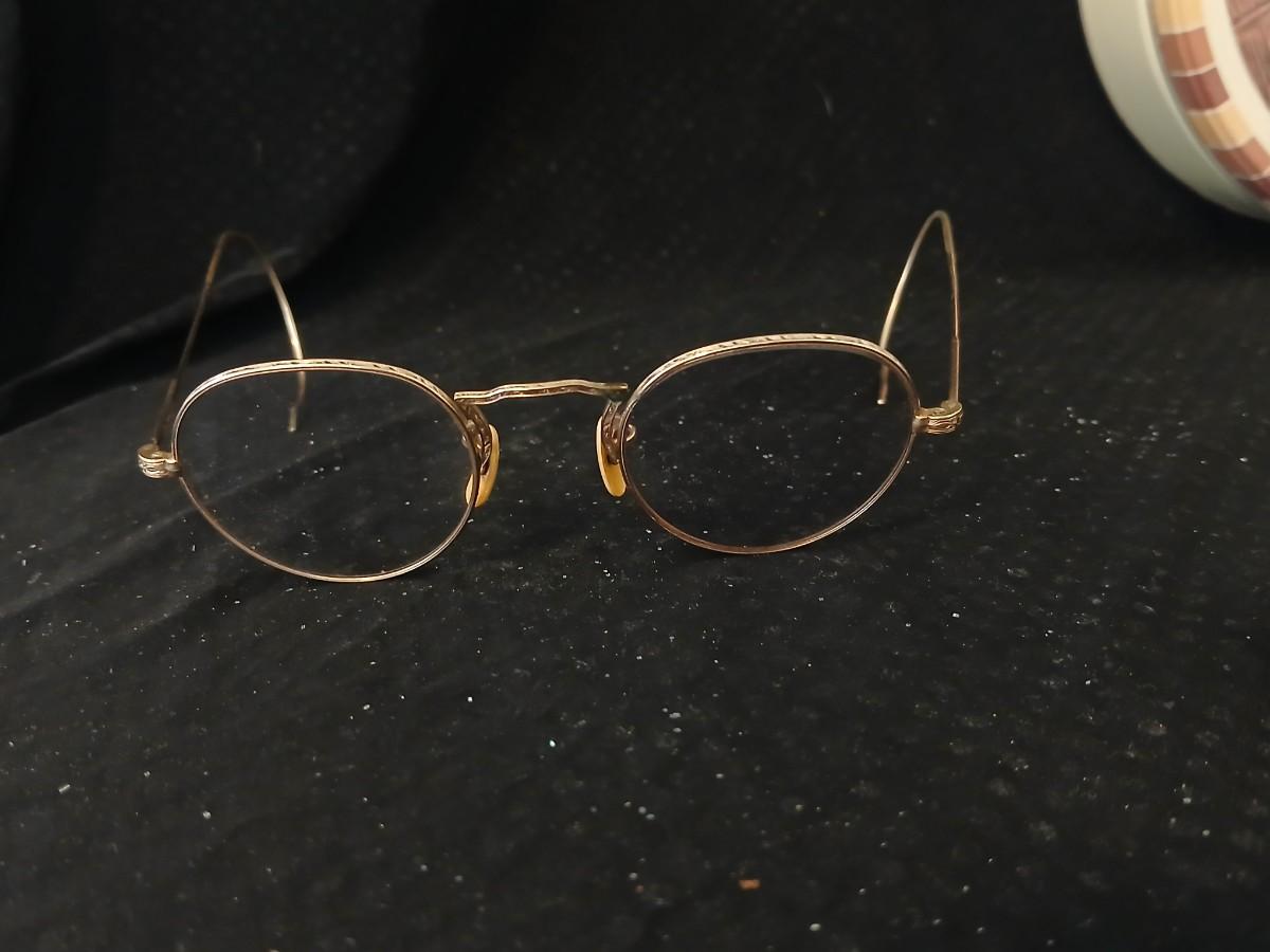 Barber tin with 12 K GF antiques glasses, Doan's pills tin, skeleton keys, Strong set shaving brush,