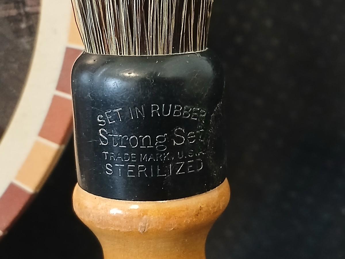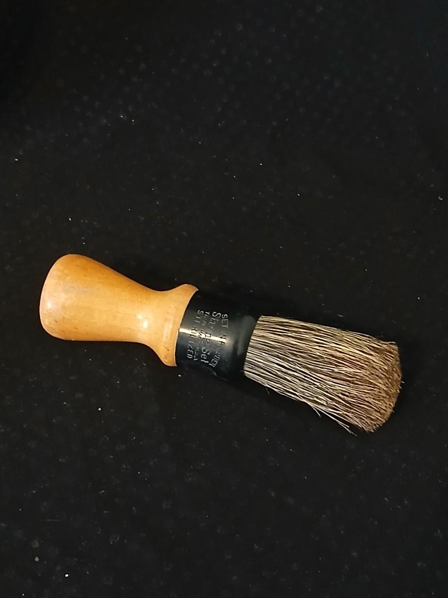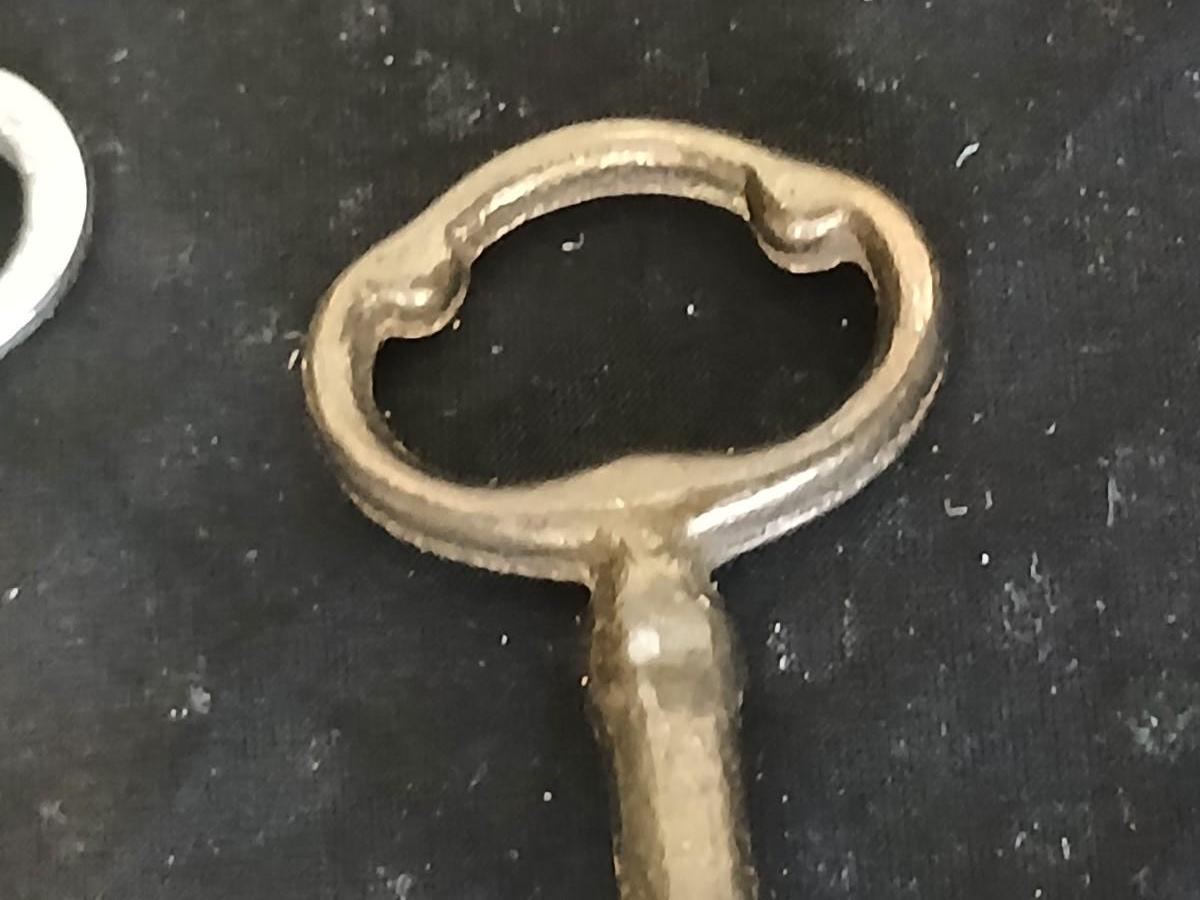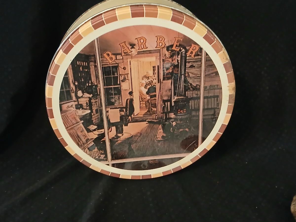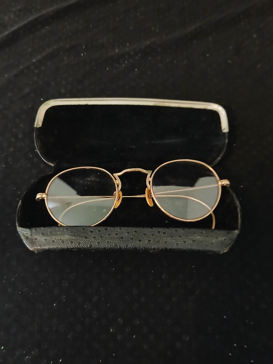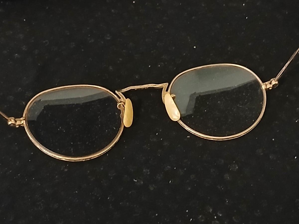 Barber tin with 12 K GF antiques glasses, Doan's pills tin, skeleton keys, Strong set shaving brush,