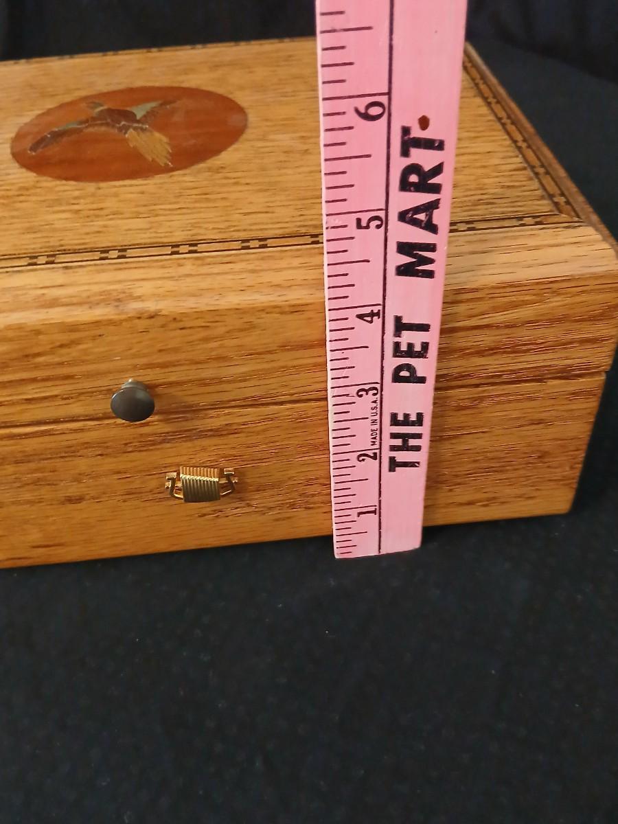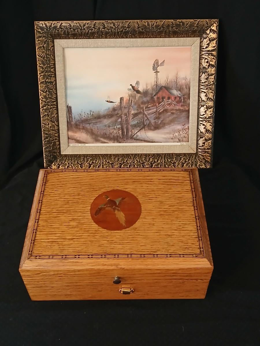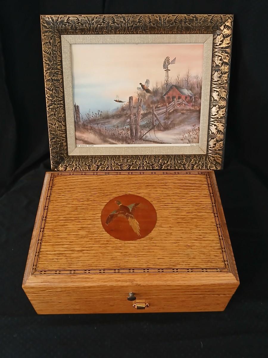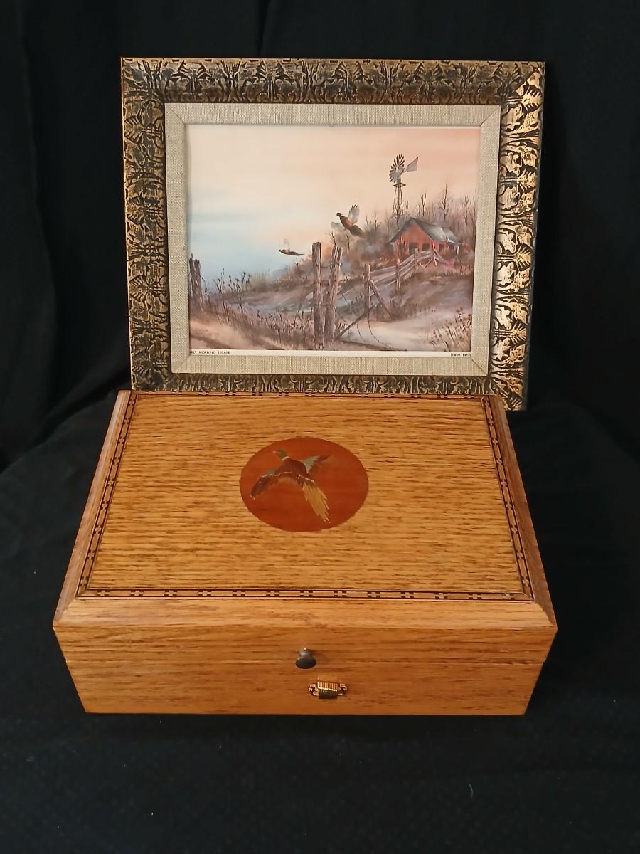 Wooden musical box with an inlay design of a flying pheasant - Sankyo Orpheus music box movement - Sherm Pehrson "Early Morning Escape" of flying pheasants