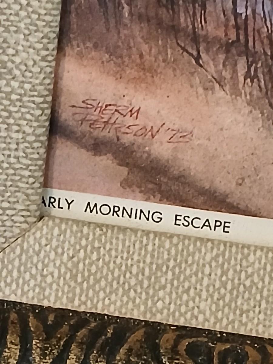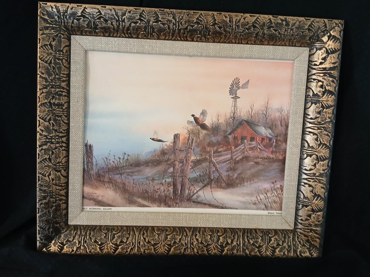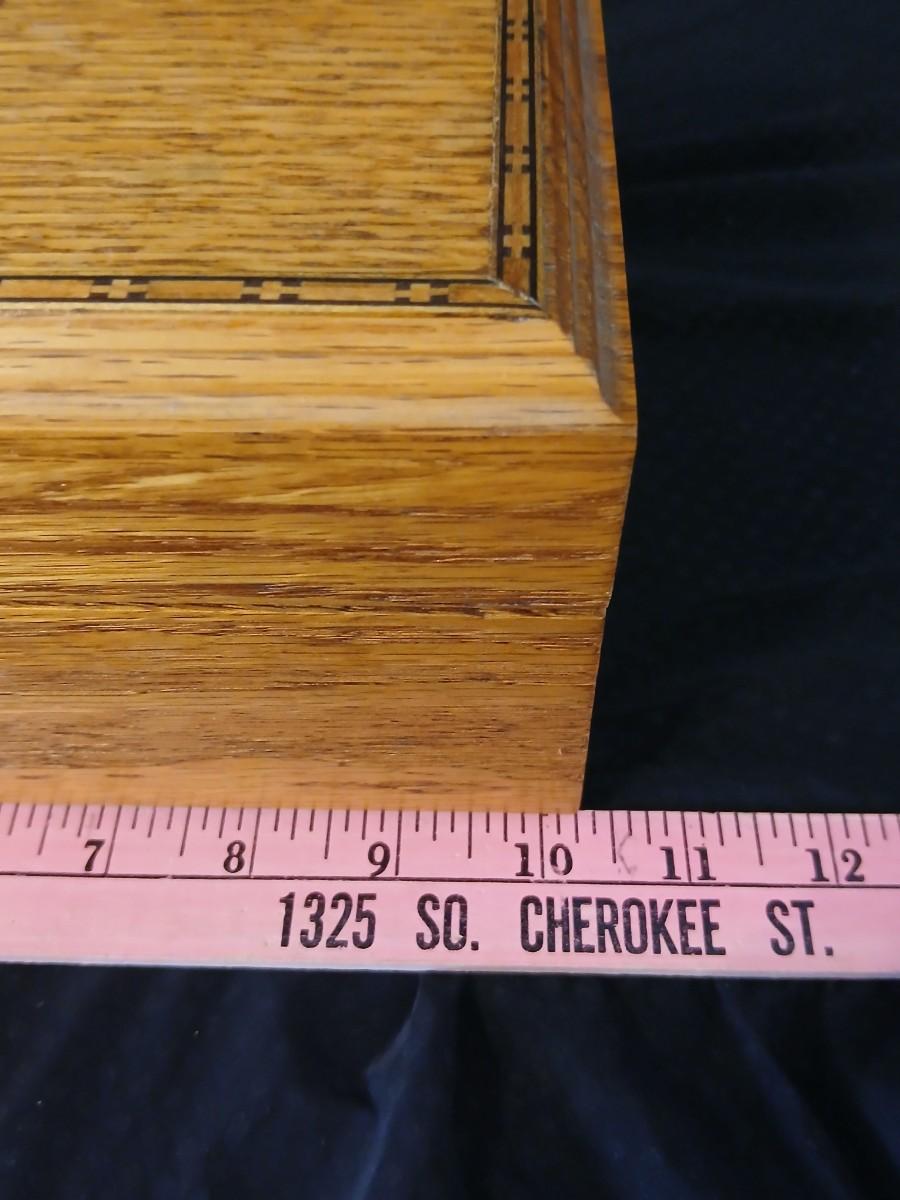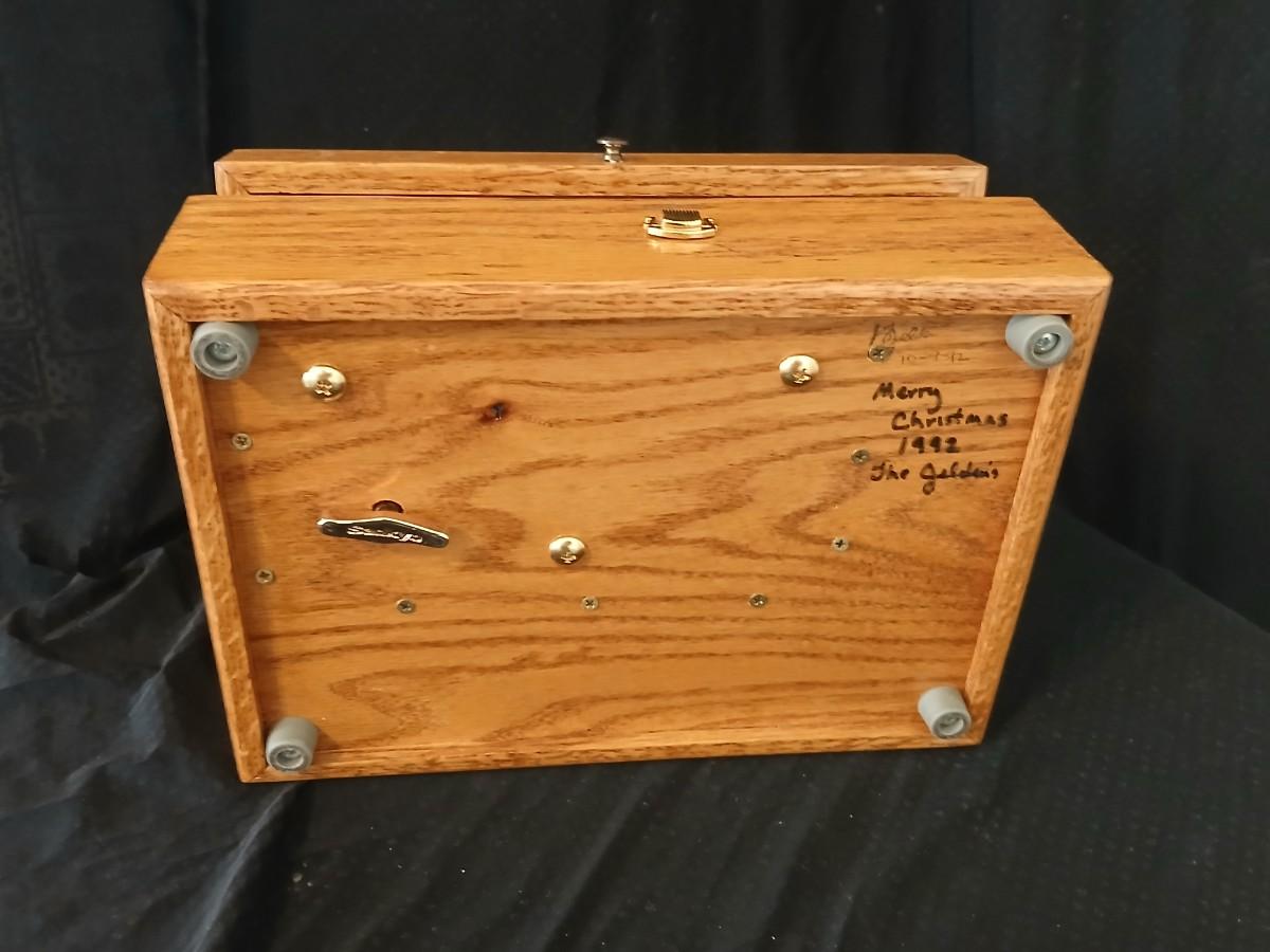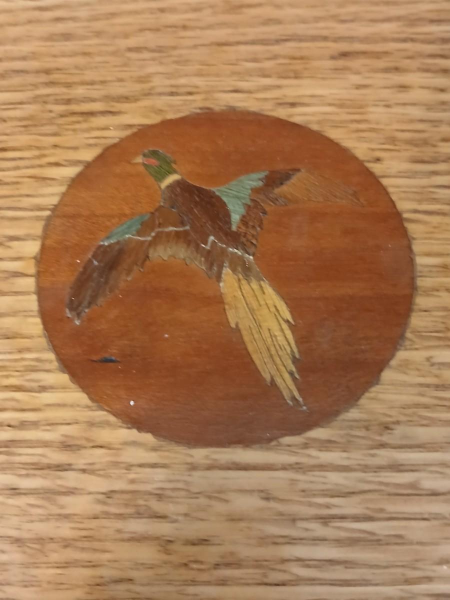 Wooden musical box with an inlay design of a flying pheasant - Sankyo Orpheus music box movement - Sherm Pehrson "Early Morning Escape" of flying pheasants