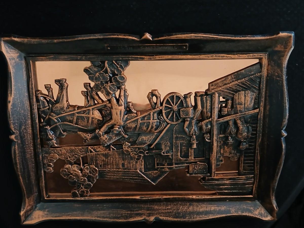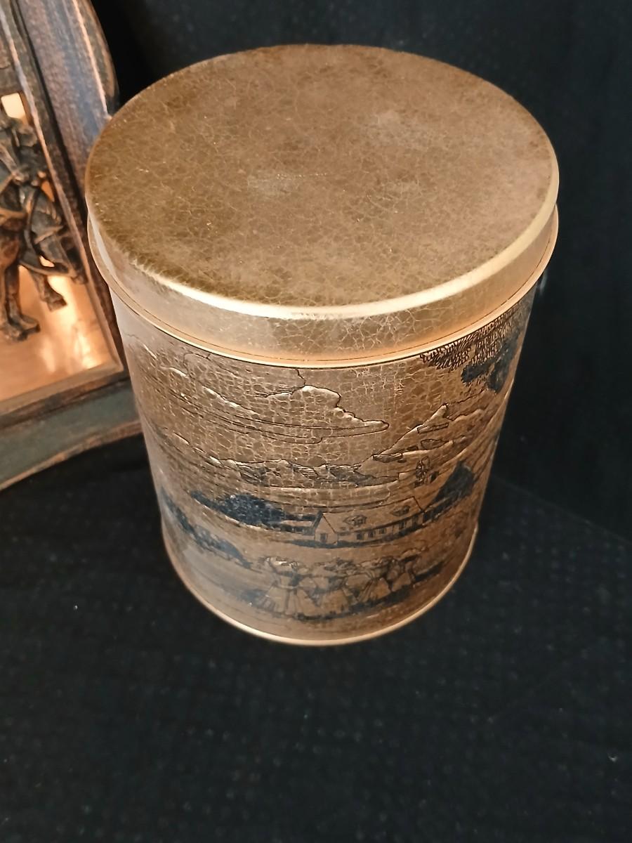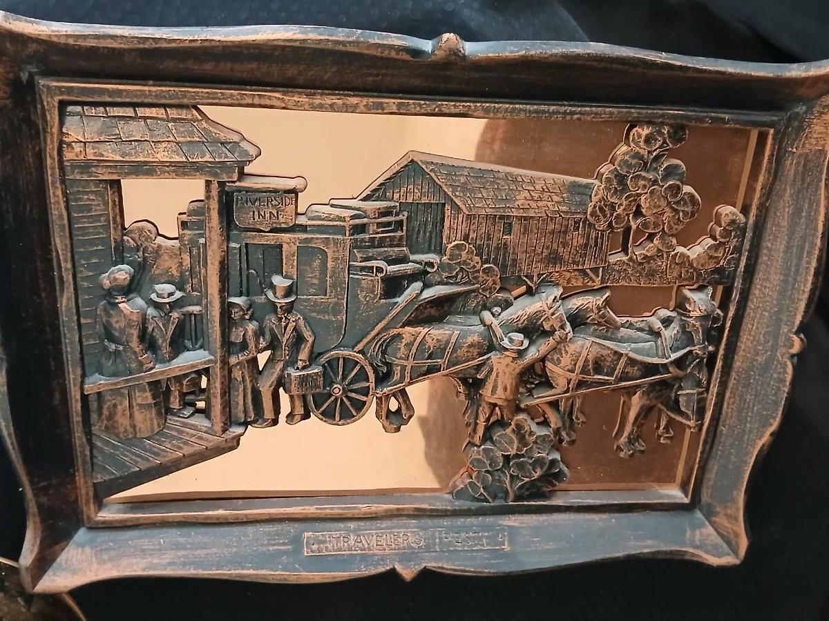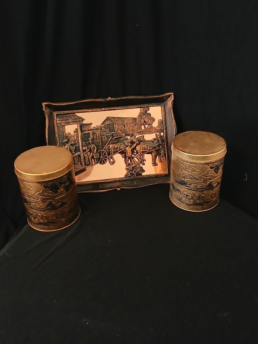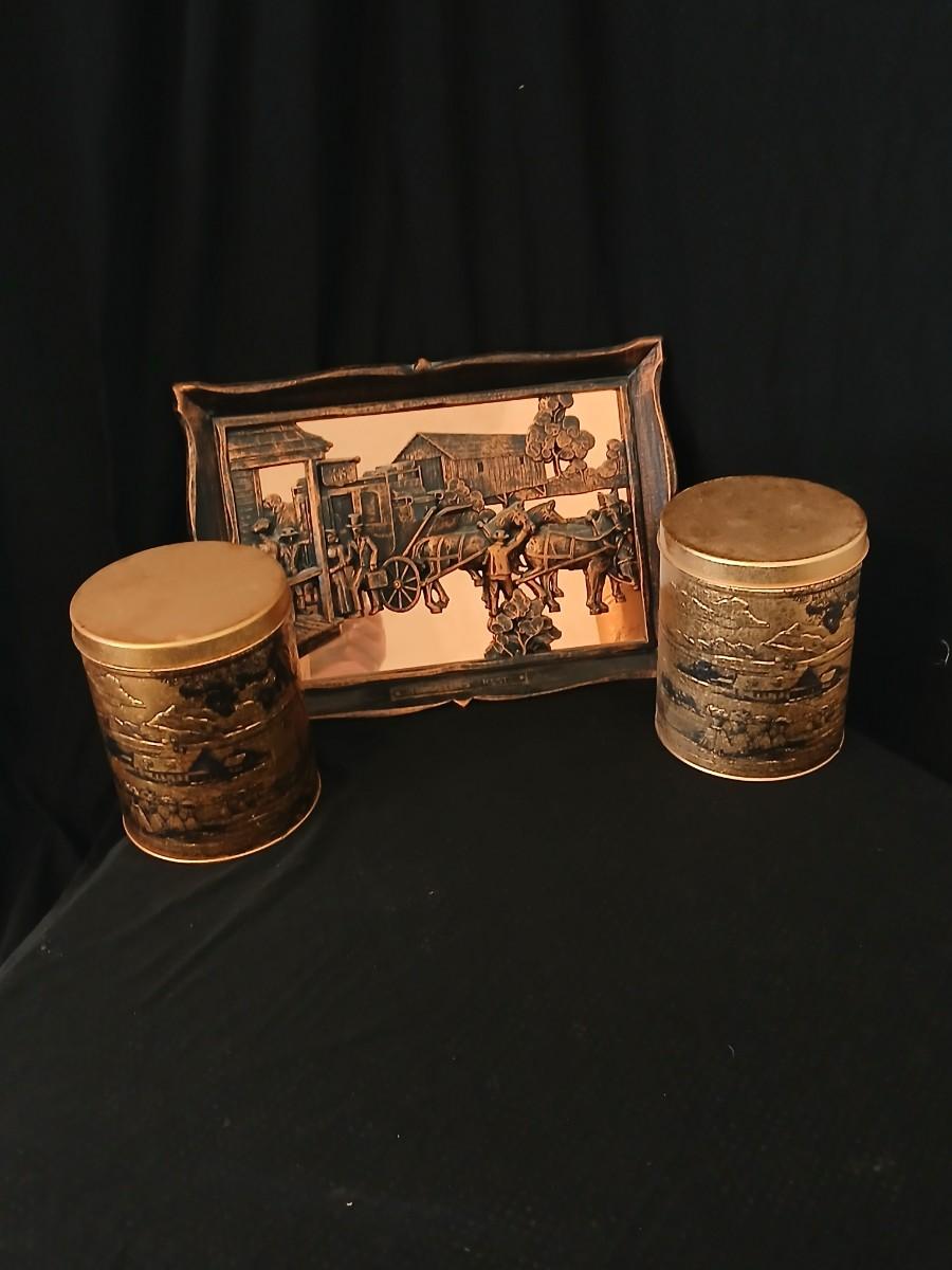 3D wall art plaque by Coppercraft Guild, titled "Traveler's Rest". with two vintage black and bronze / gold lacquer tins