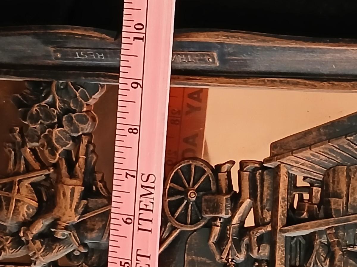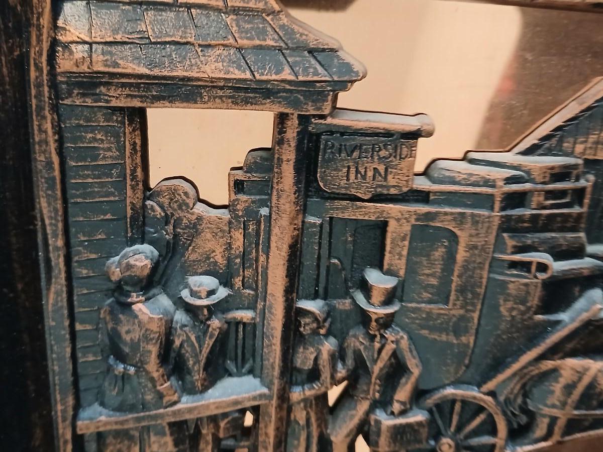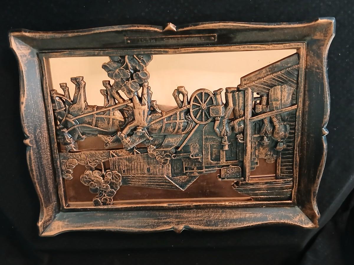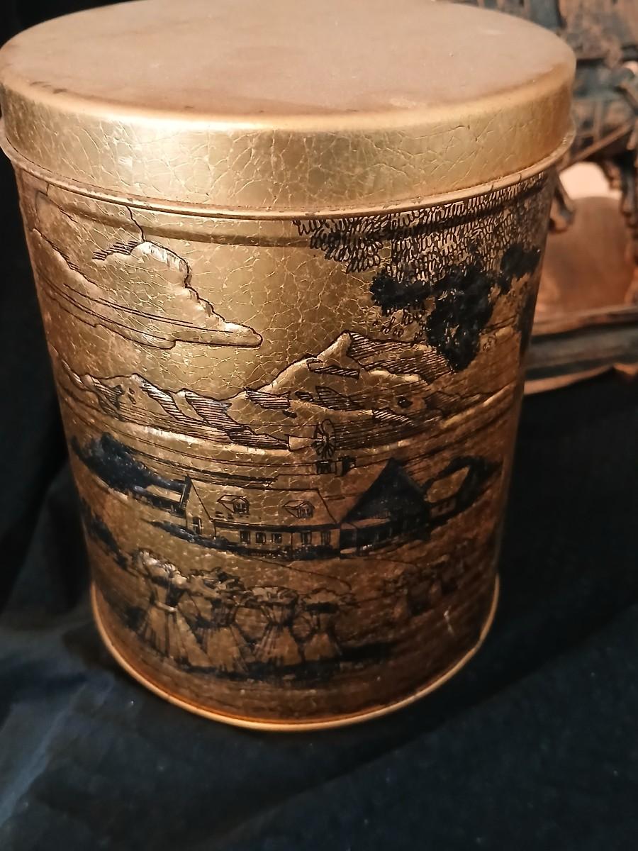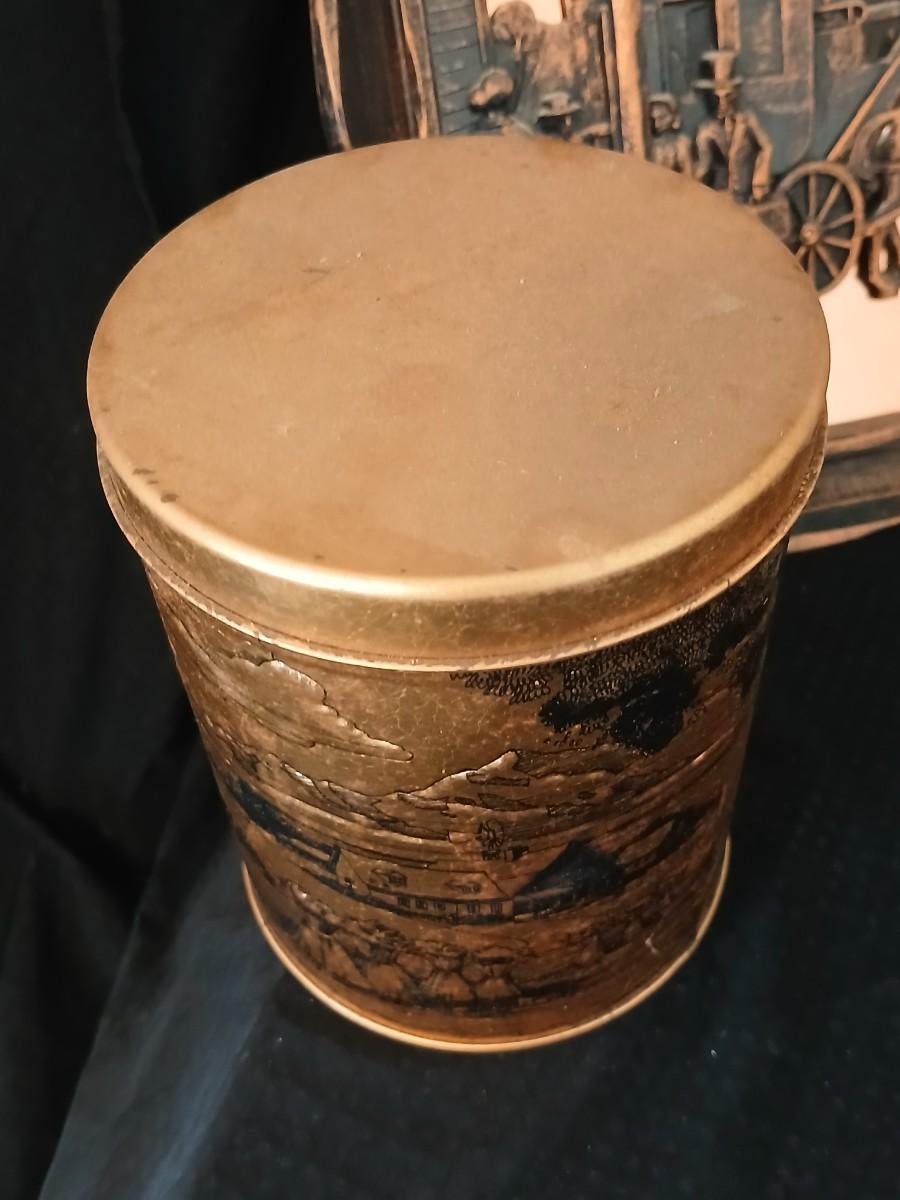 3D wall art plaque by Coppercraft Guild, titled "Traveler's Rest". with two vintage black and bronze / gold lacquer tins