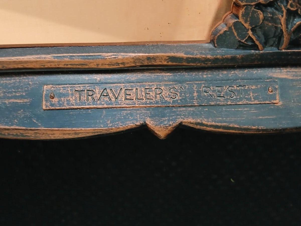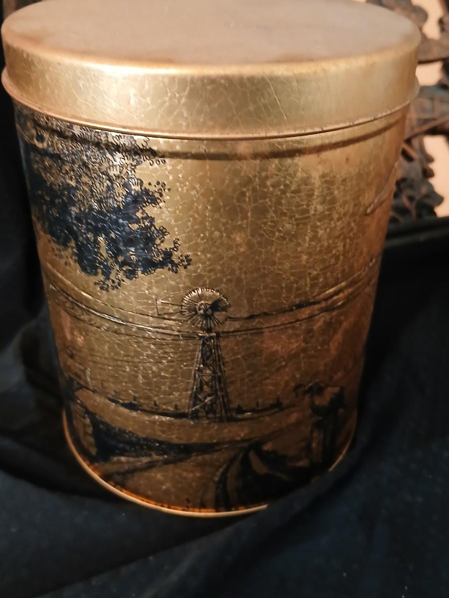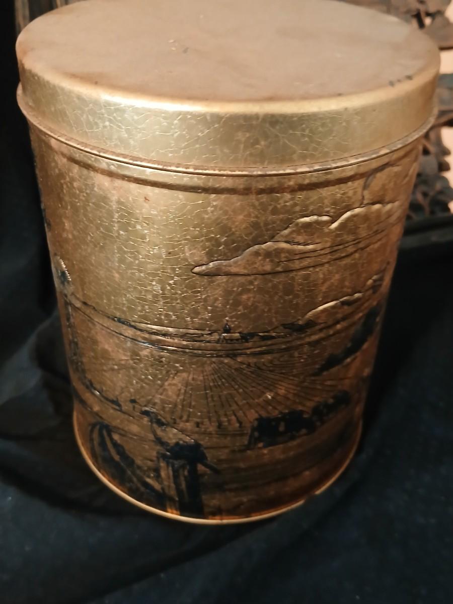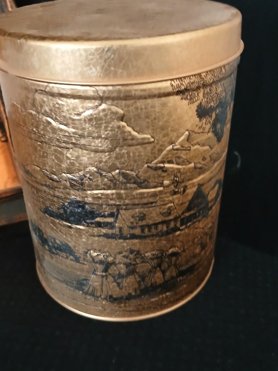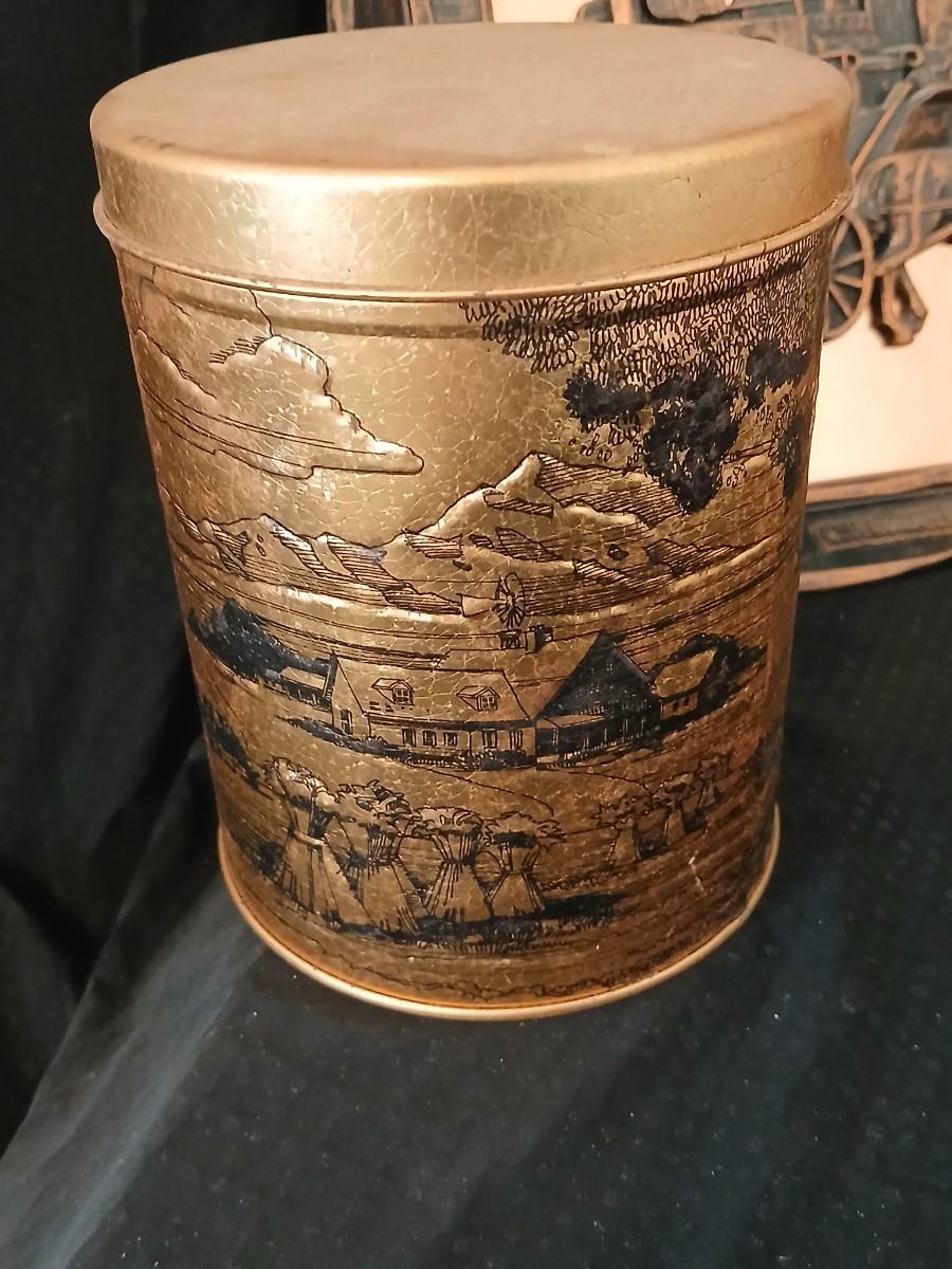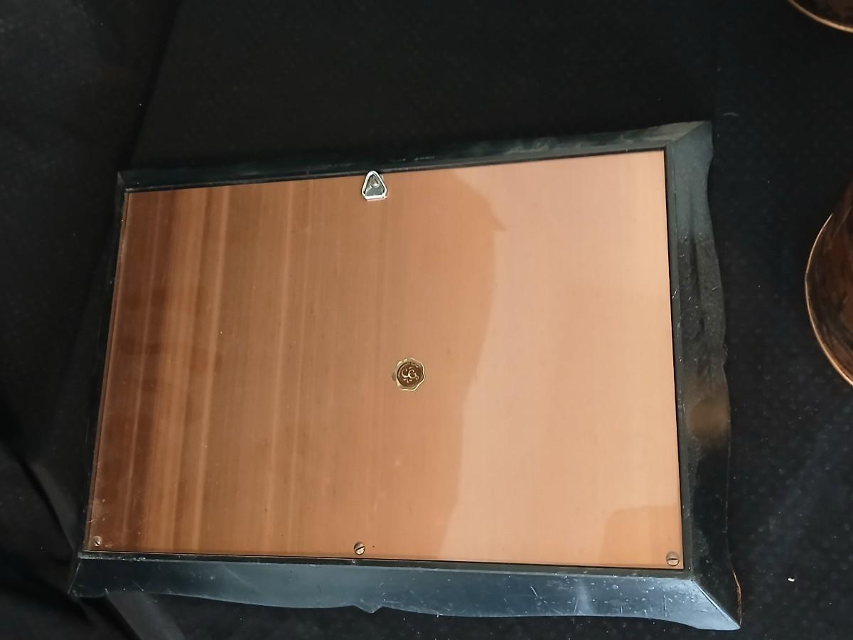 3D wall art plaque by Coppercraft Guild, titled "Traveler's Rest". with two vintage black and bronze / gold lacquer tins