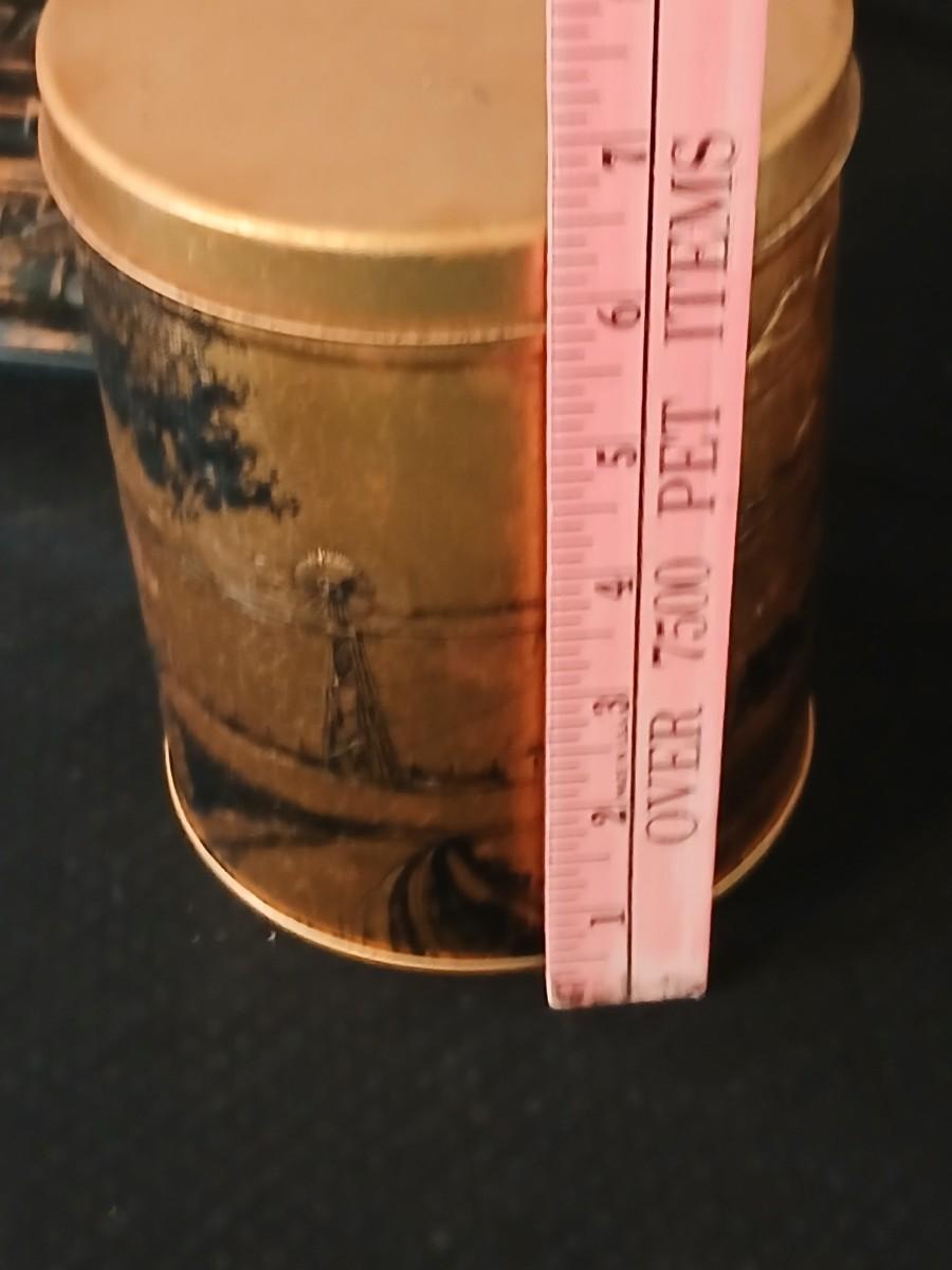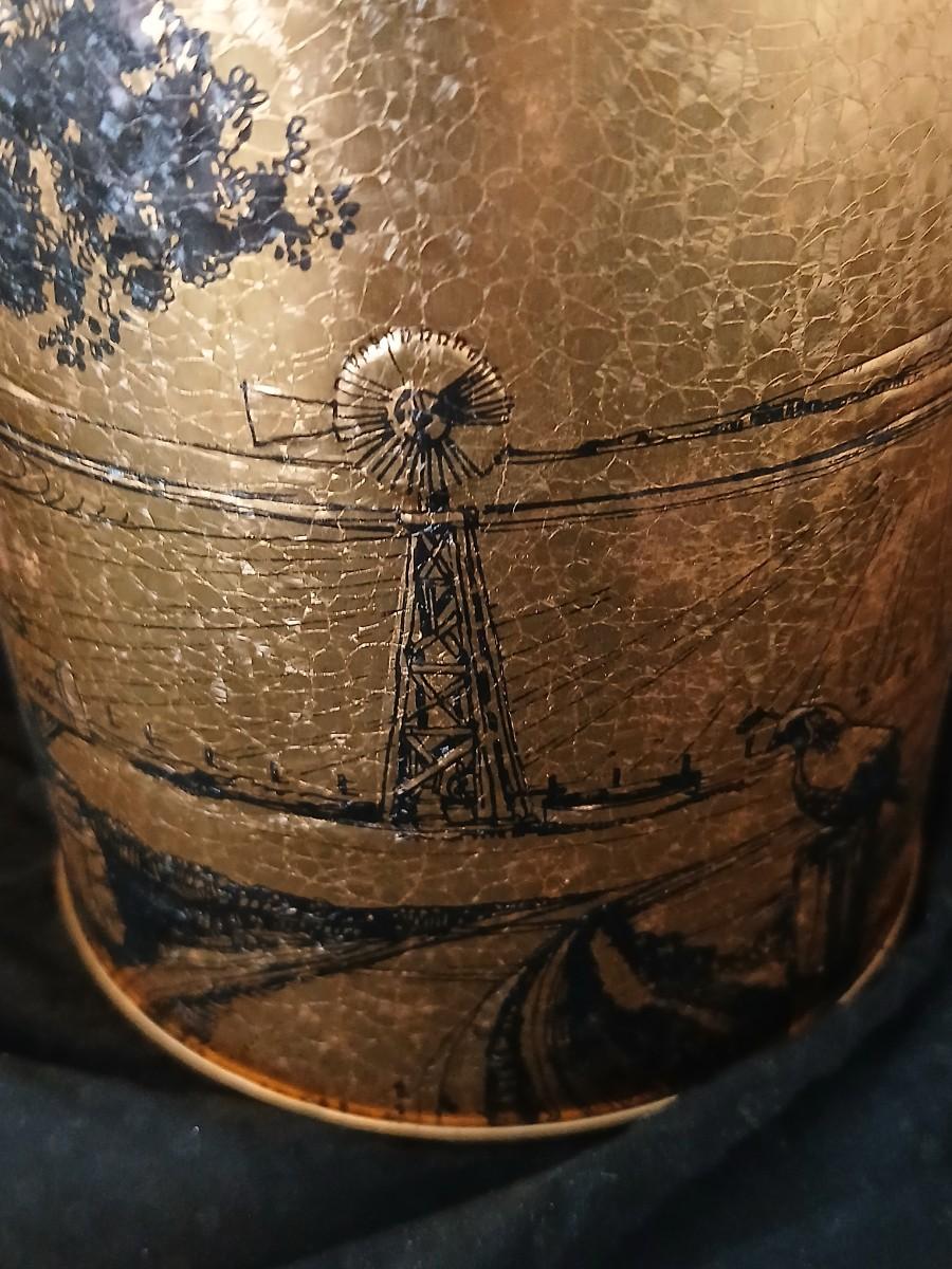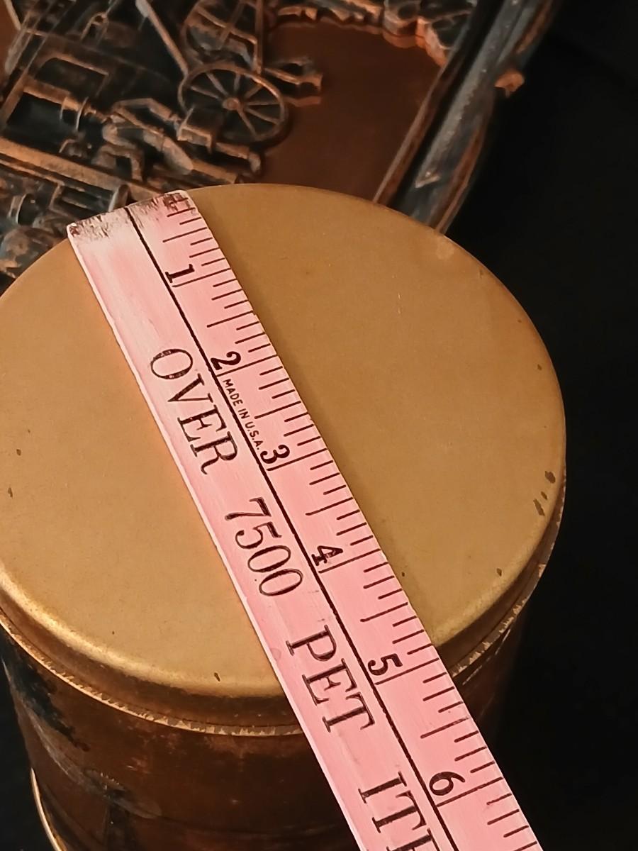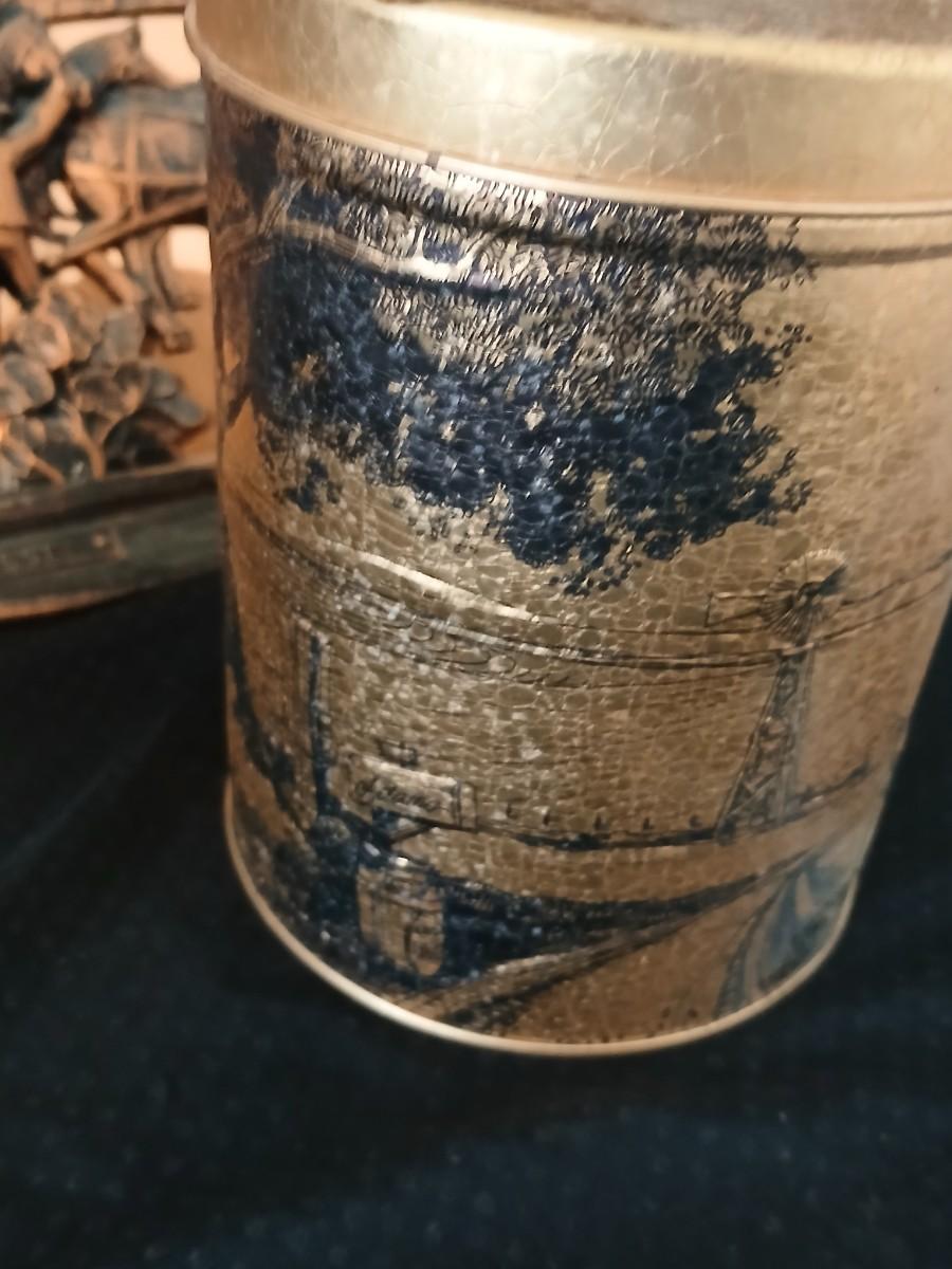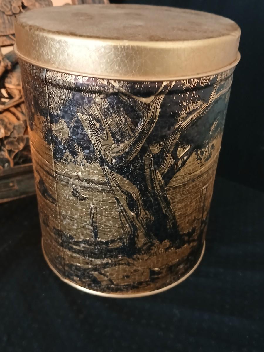 3D wall art plaque by Coppercraft Guild, titled "Traveler's Rest". with two vintage black and bronze / gold lacquer tins