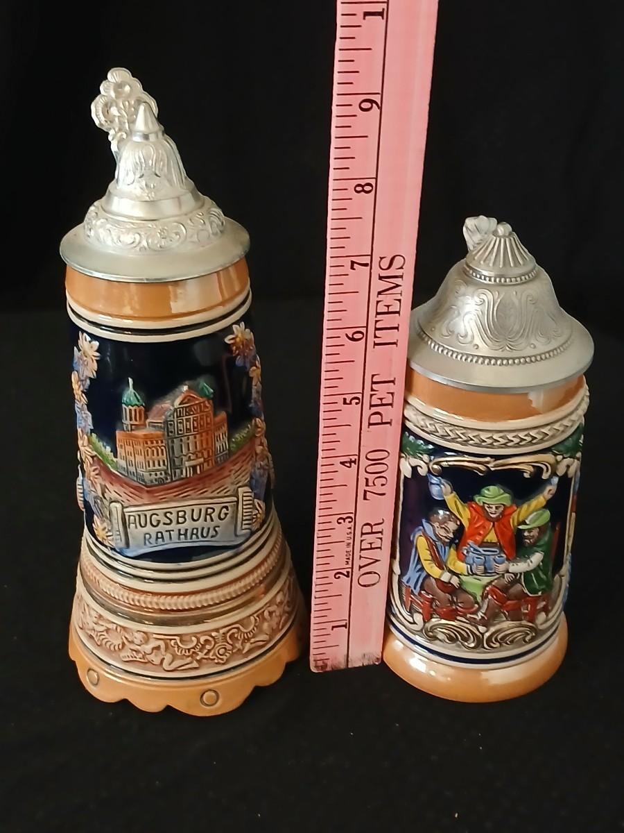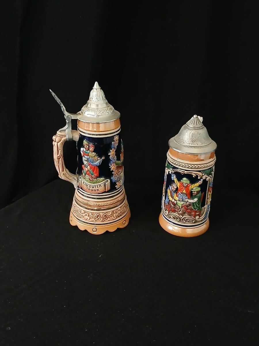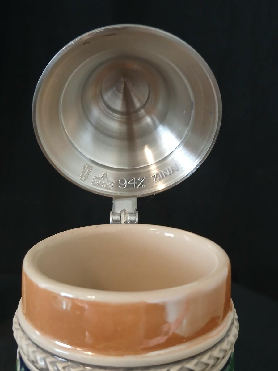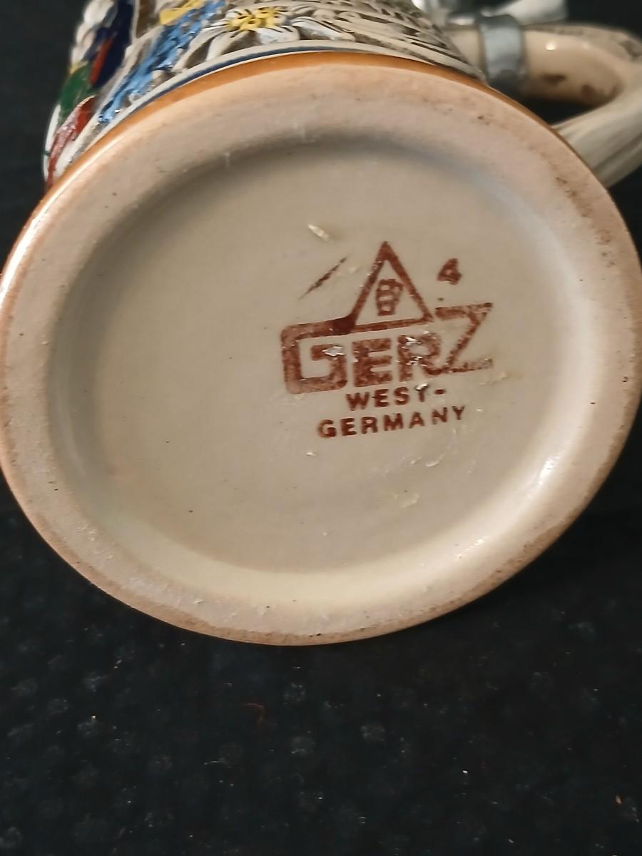 The small stein is made by Gerz, a company known for its breweriana. The underside of the lid might be marked "94% Zinn" or "95% Zinn" along with the Gerz triangle hallmark.