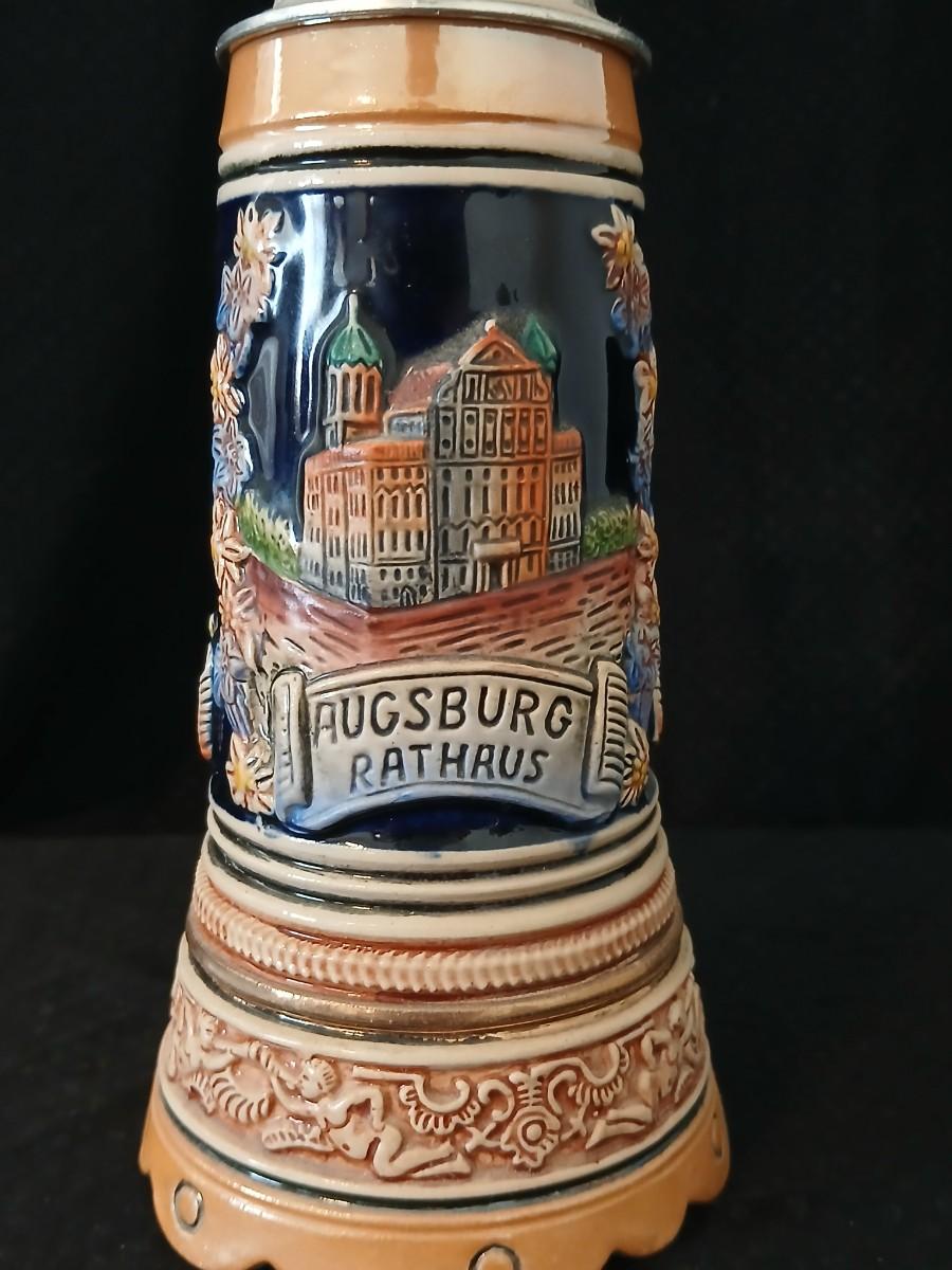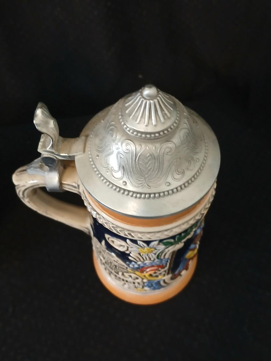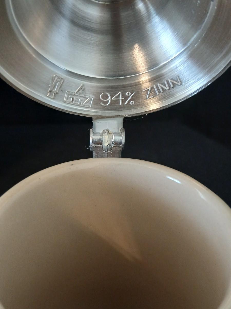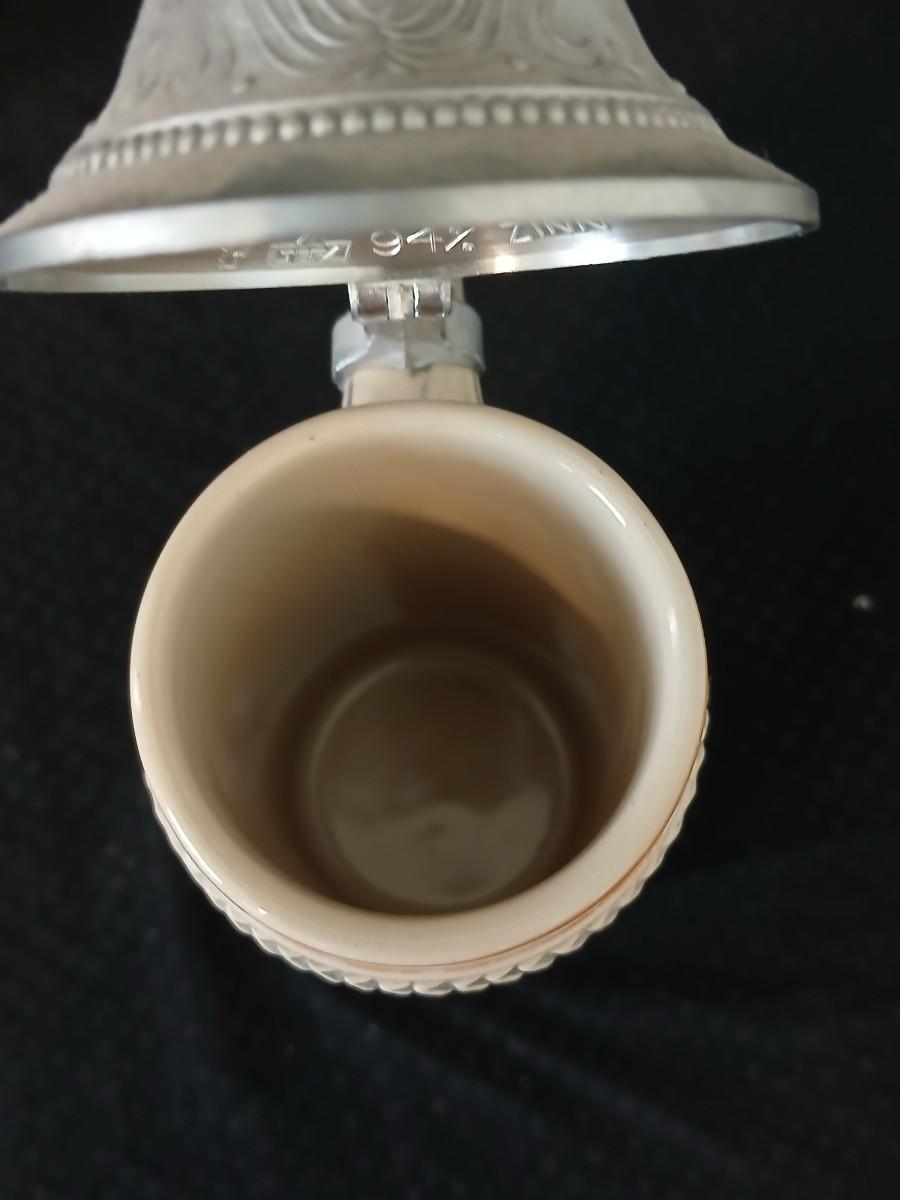 The small stein is made by Gerz, a company known for its breweriana. The underside of the lid might be marked "94% Zinn" or "95% Zinn" along with the Gerz triangle hallmark.