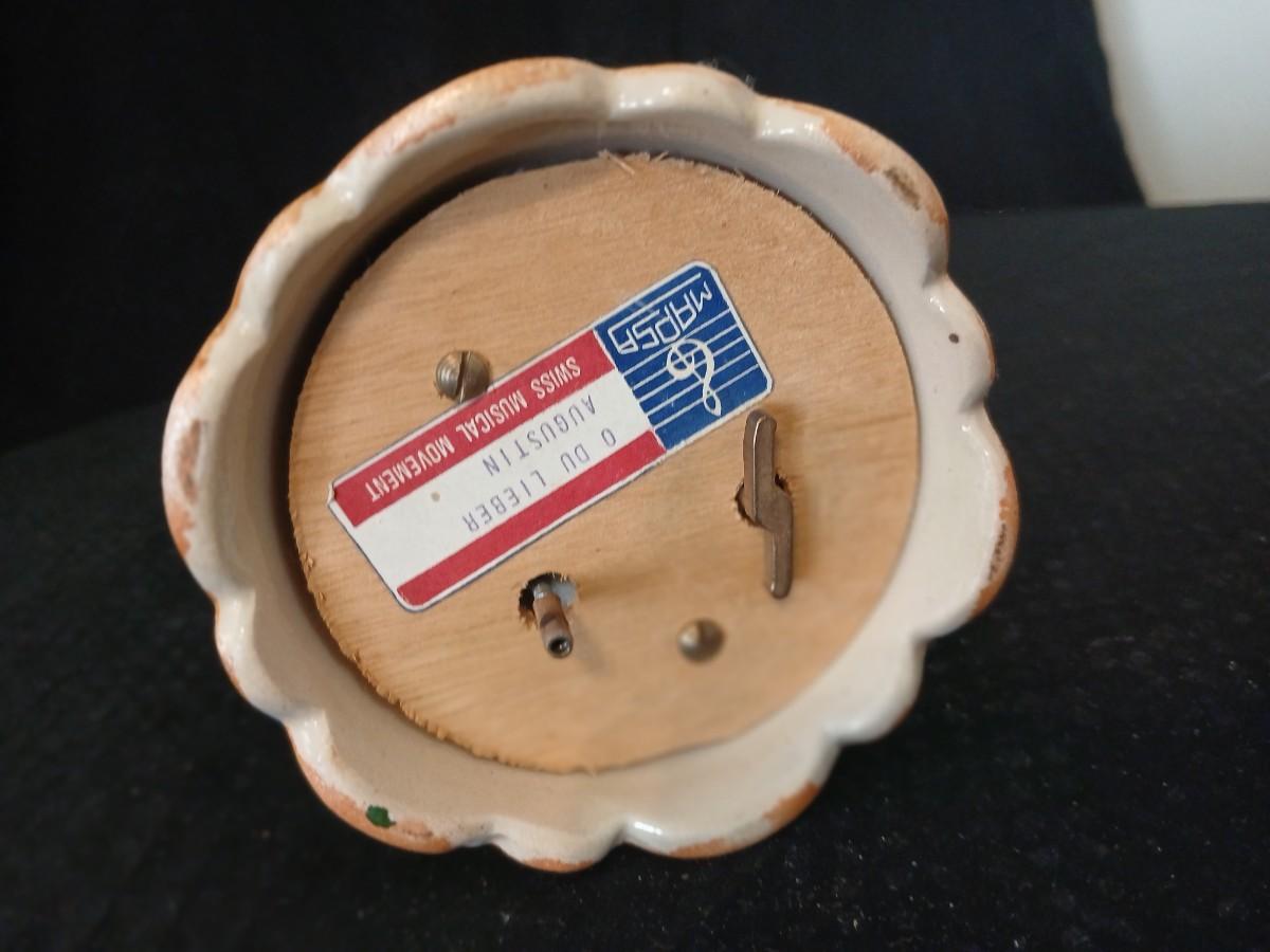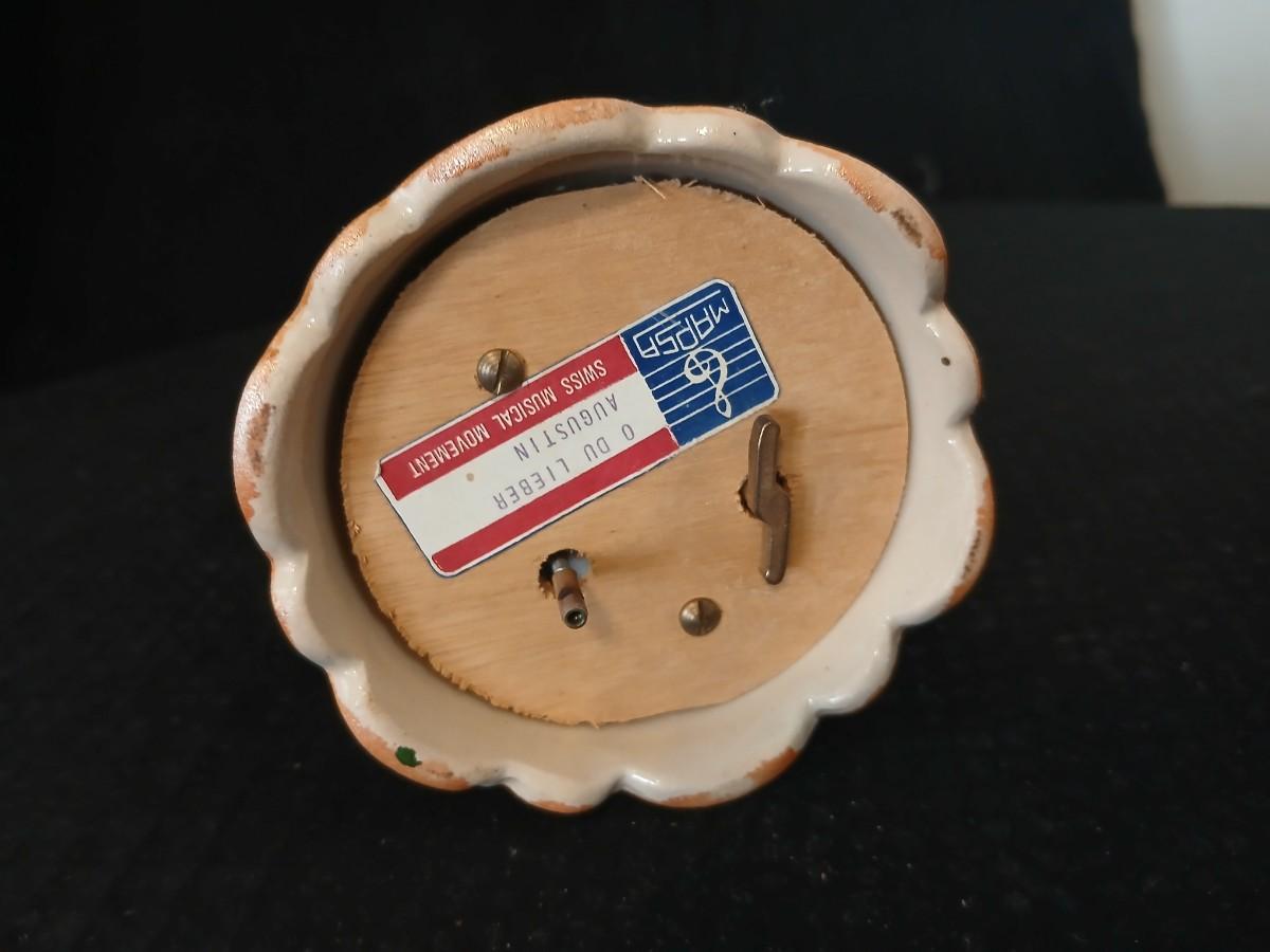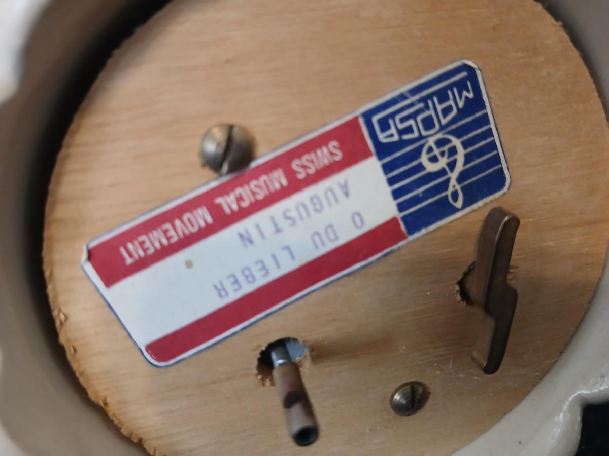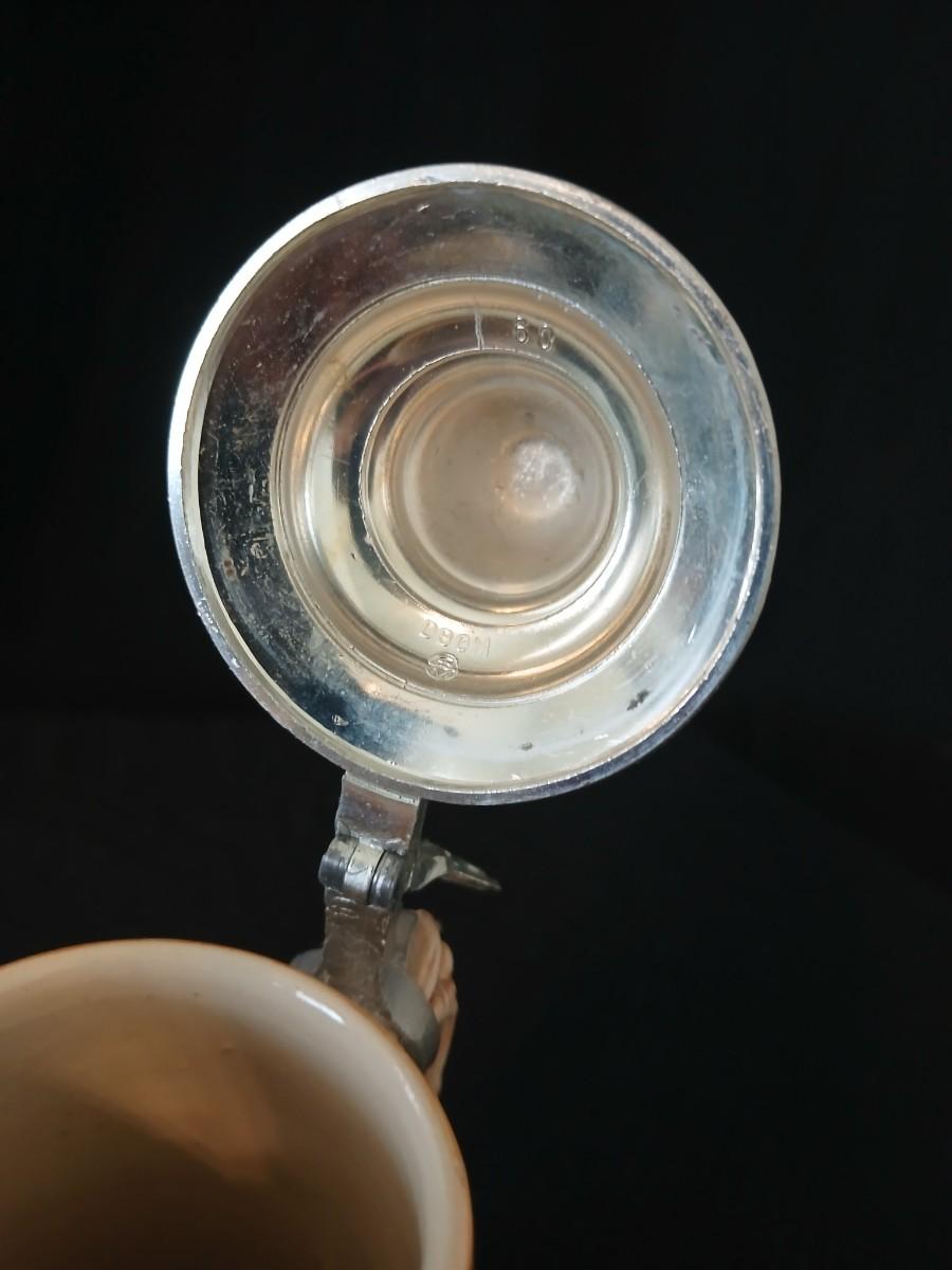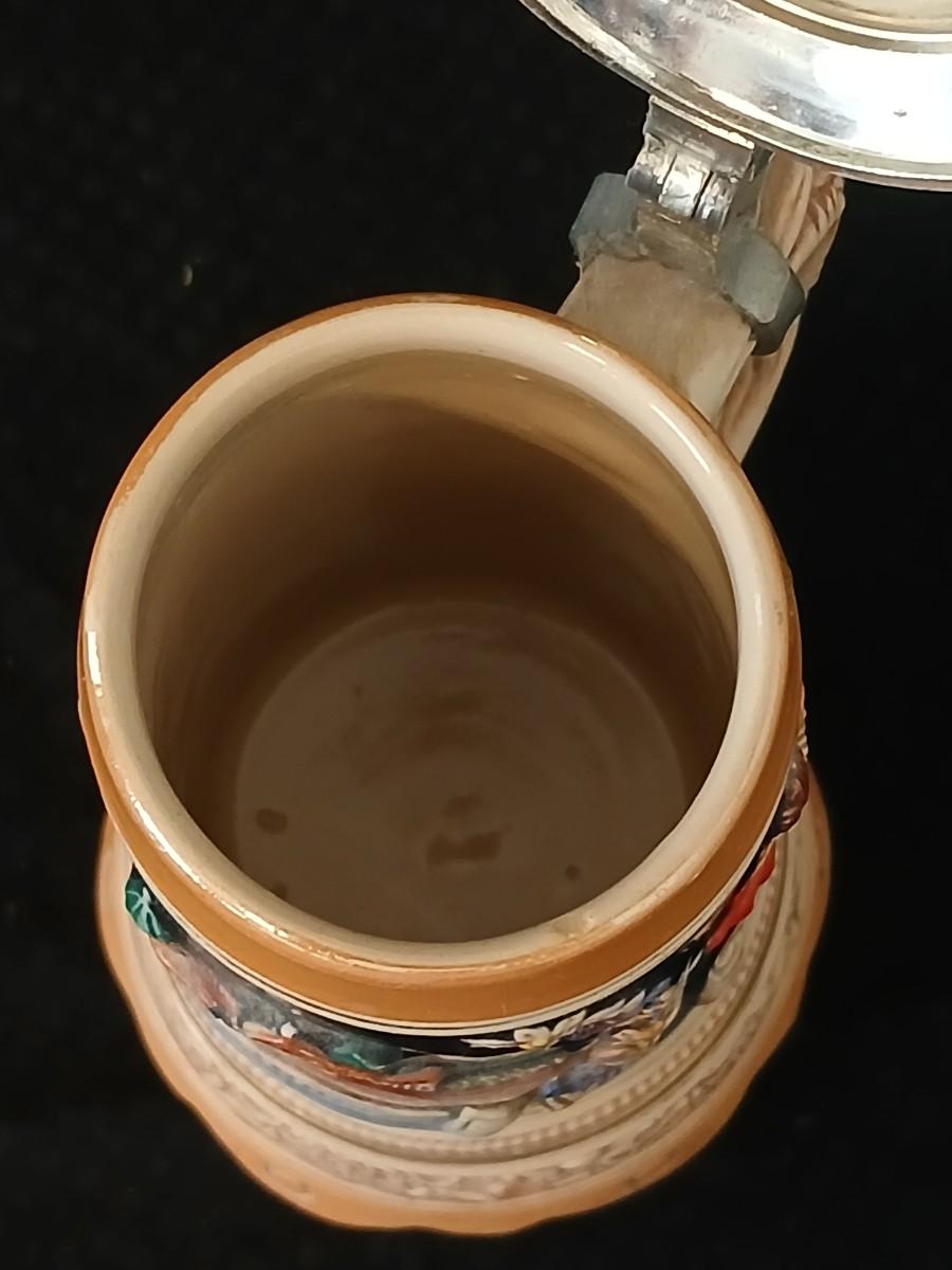 The stein has an internal music box, a Swiss musical movement, located in its base that plays the tune "O du lieber Augustin" (a popular Viennese song) when the hinged pewter lid is opened or closed