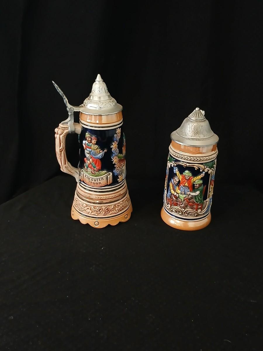 Two vintage German lidded porcelain beer steins - Gerz West Germany marked and Swiss Musical Mapsa