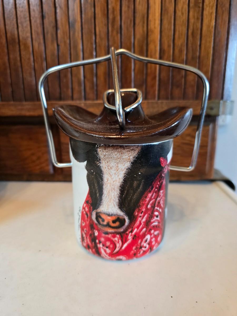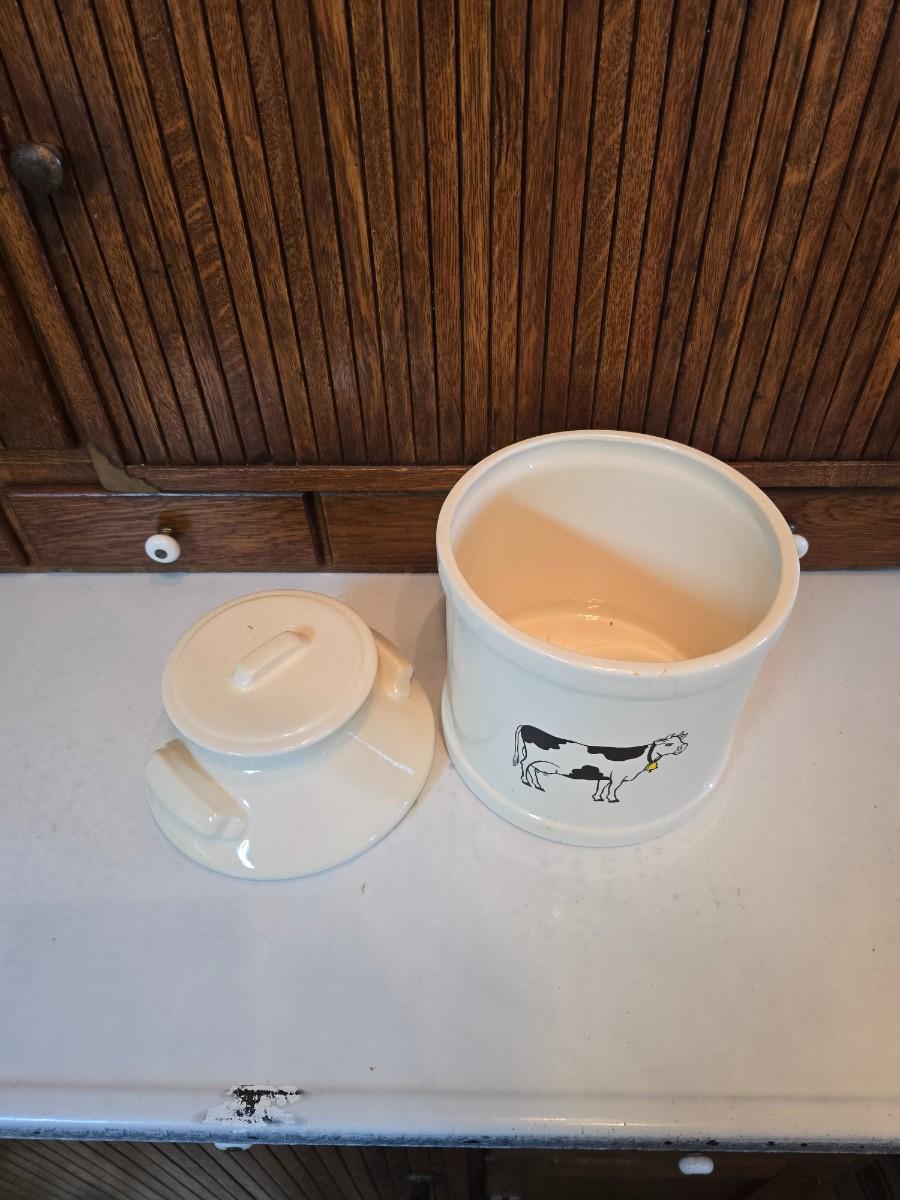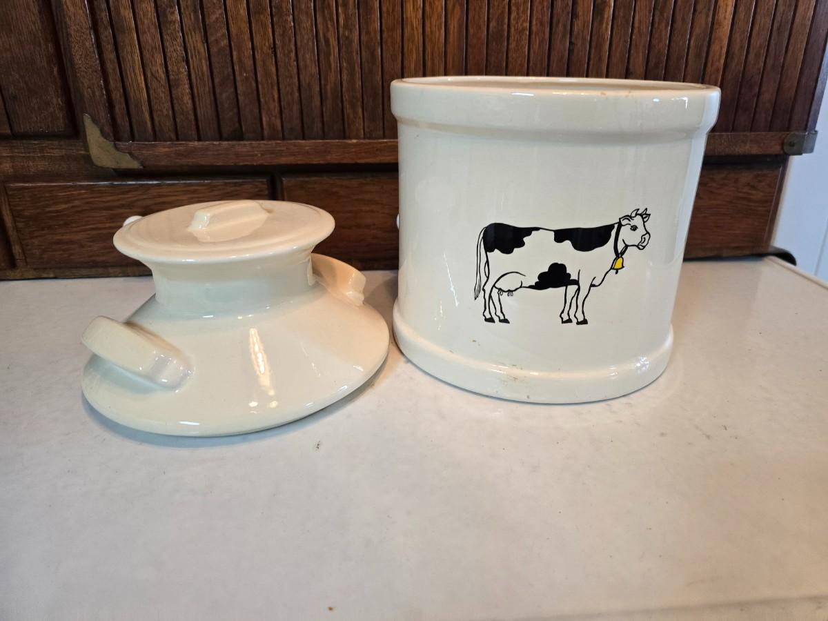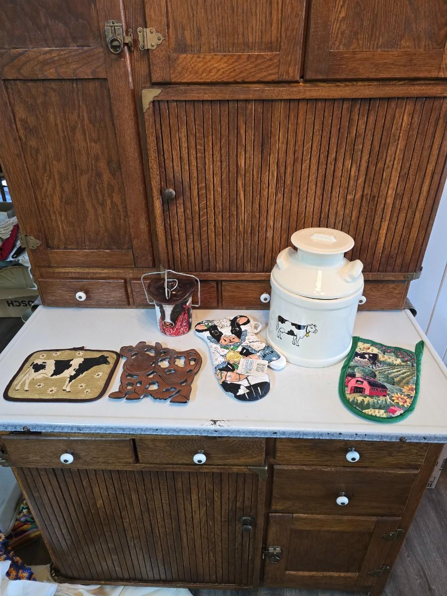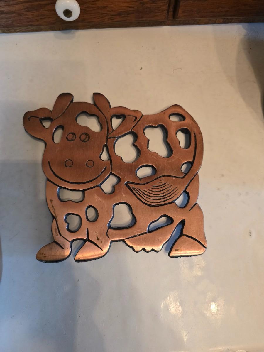 Cow canister - Ceramic cow themed crock - copper-toned cast iron trivet in the shape of a cow - and more
