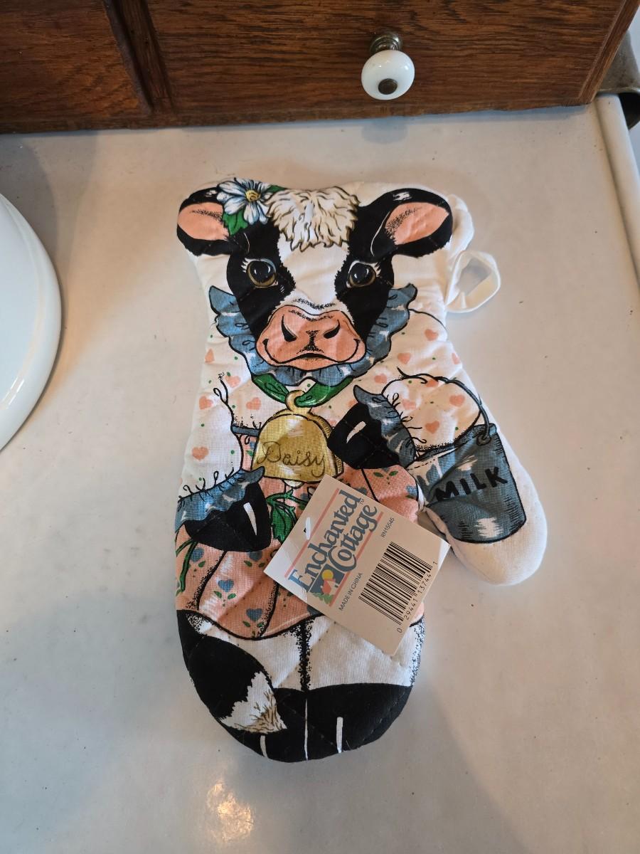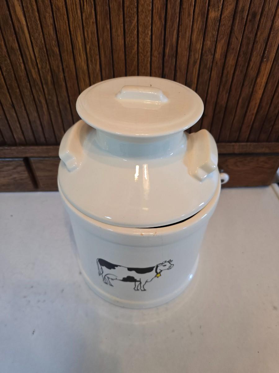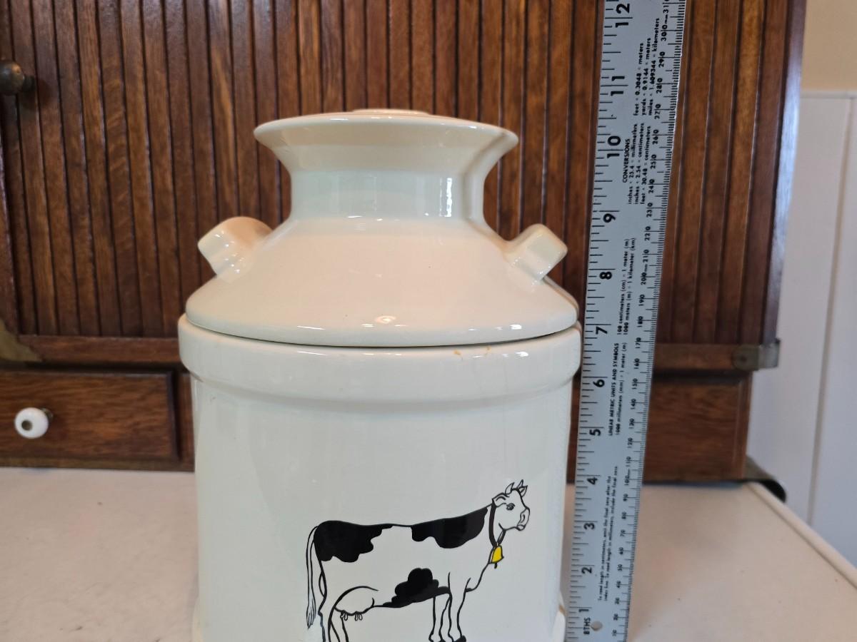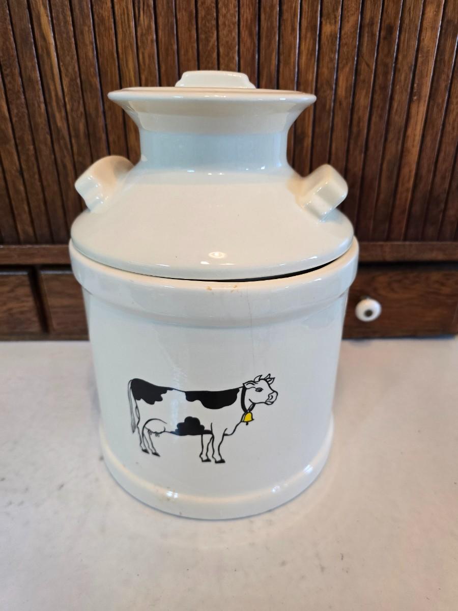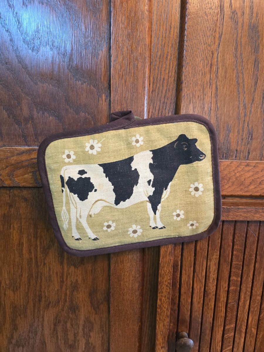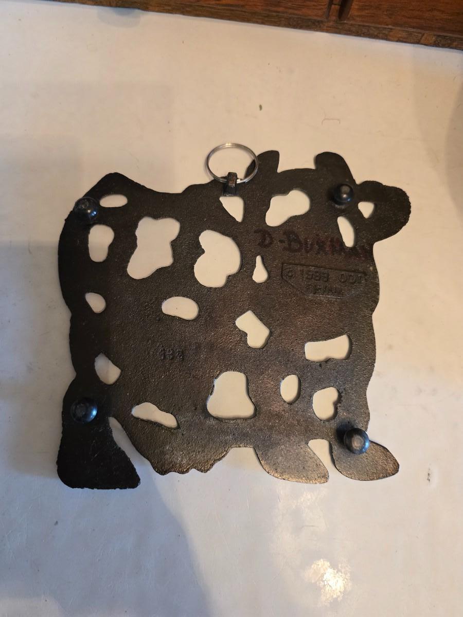 Cow canister - Ceramic cow themed crock - copper-toned cast iron trivet in the shape of a cow - and more