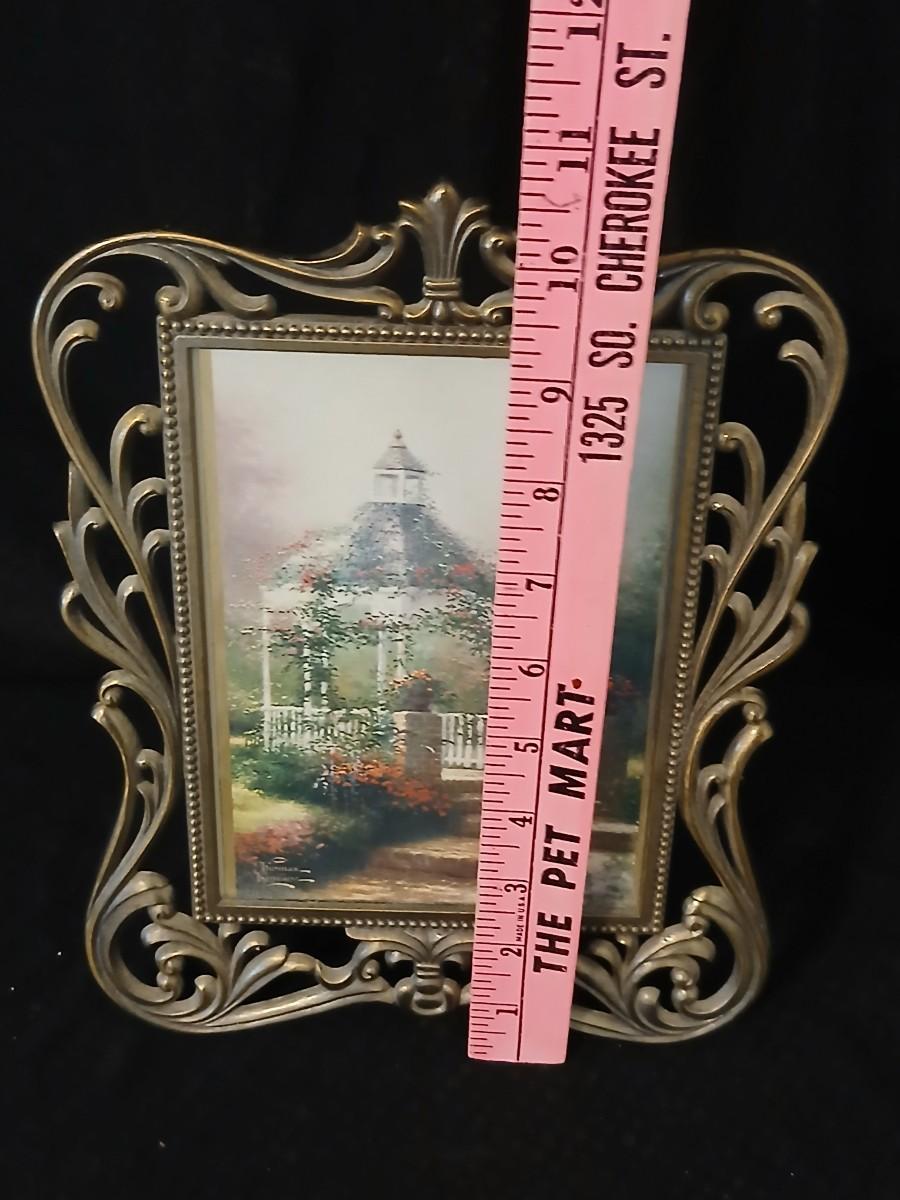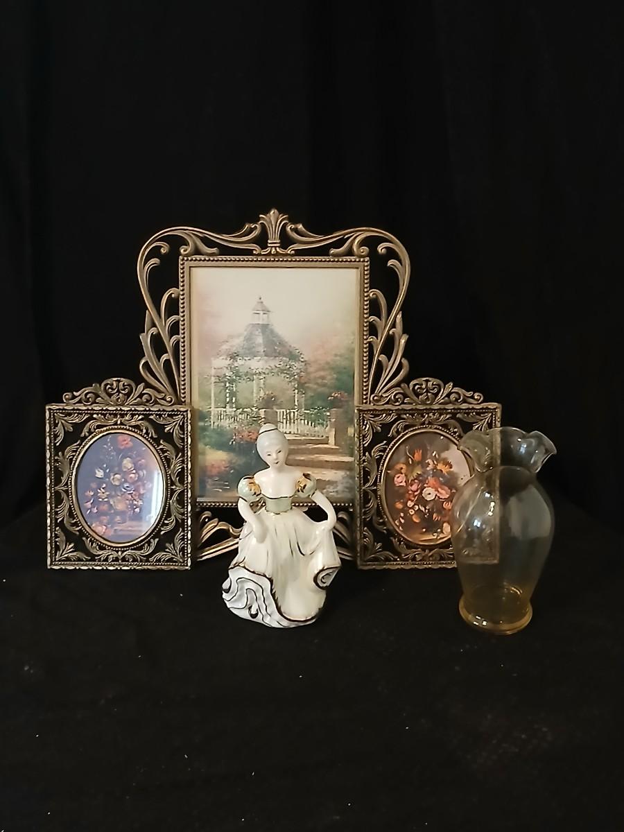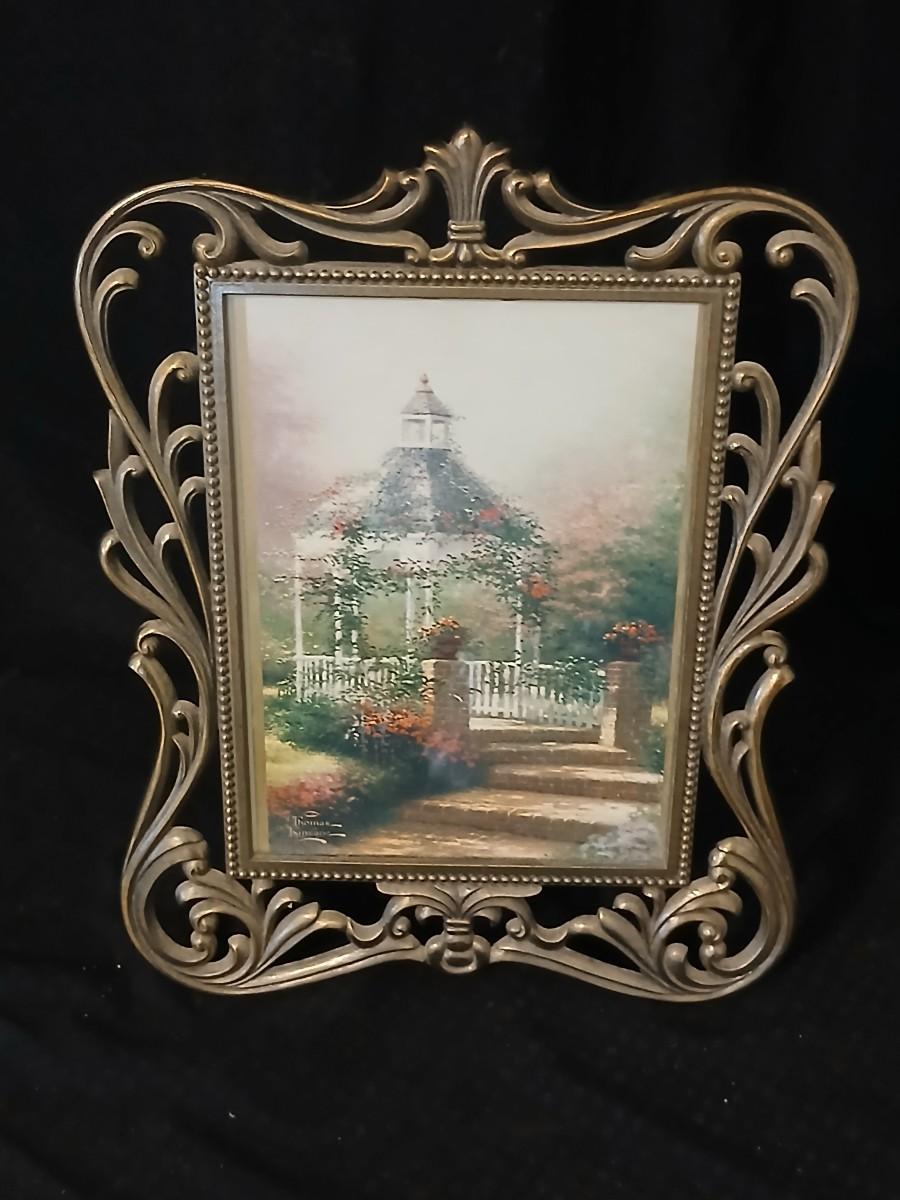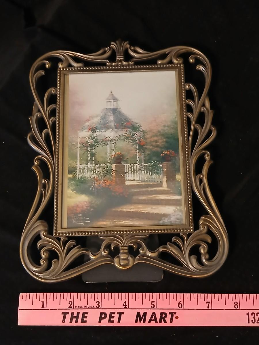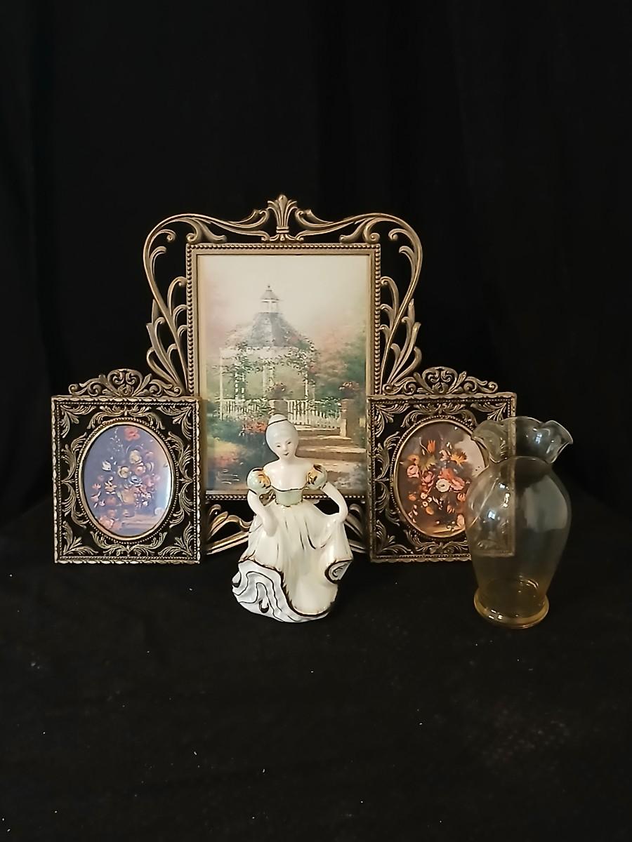 Framed print of the painting "The Hidden Gazebo" by Thomas Kinkade - Two ornate brass picture frames featuring a floral still life paintings - and aporcelain Victorian dancing lady bell figurine