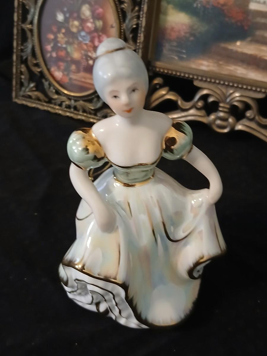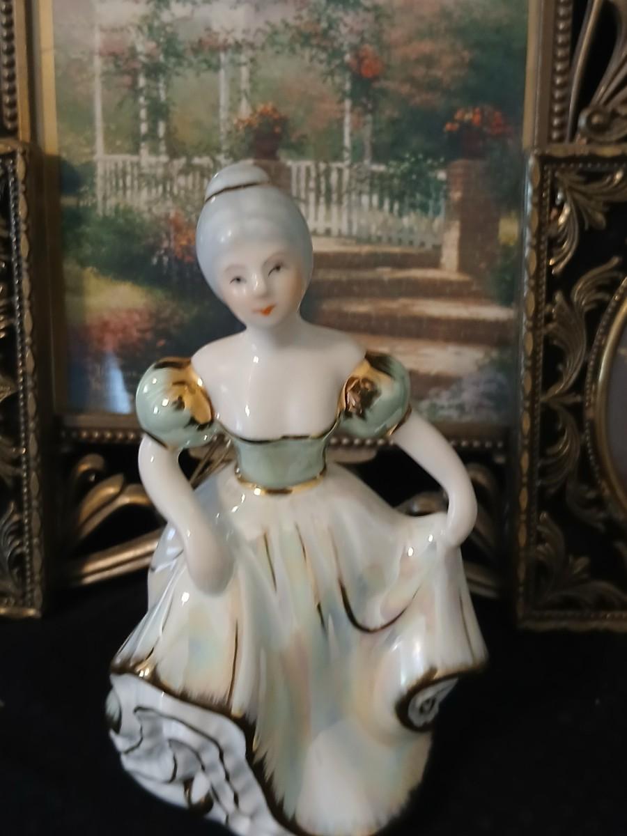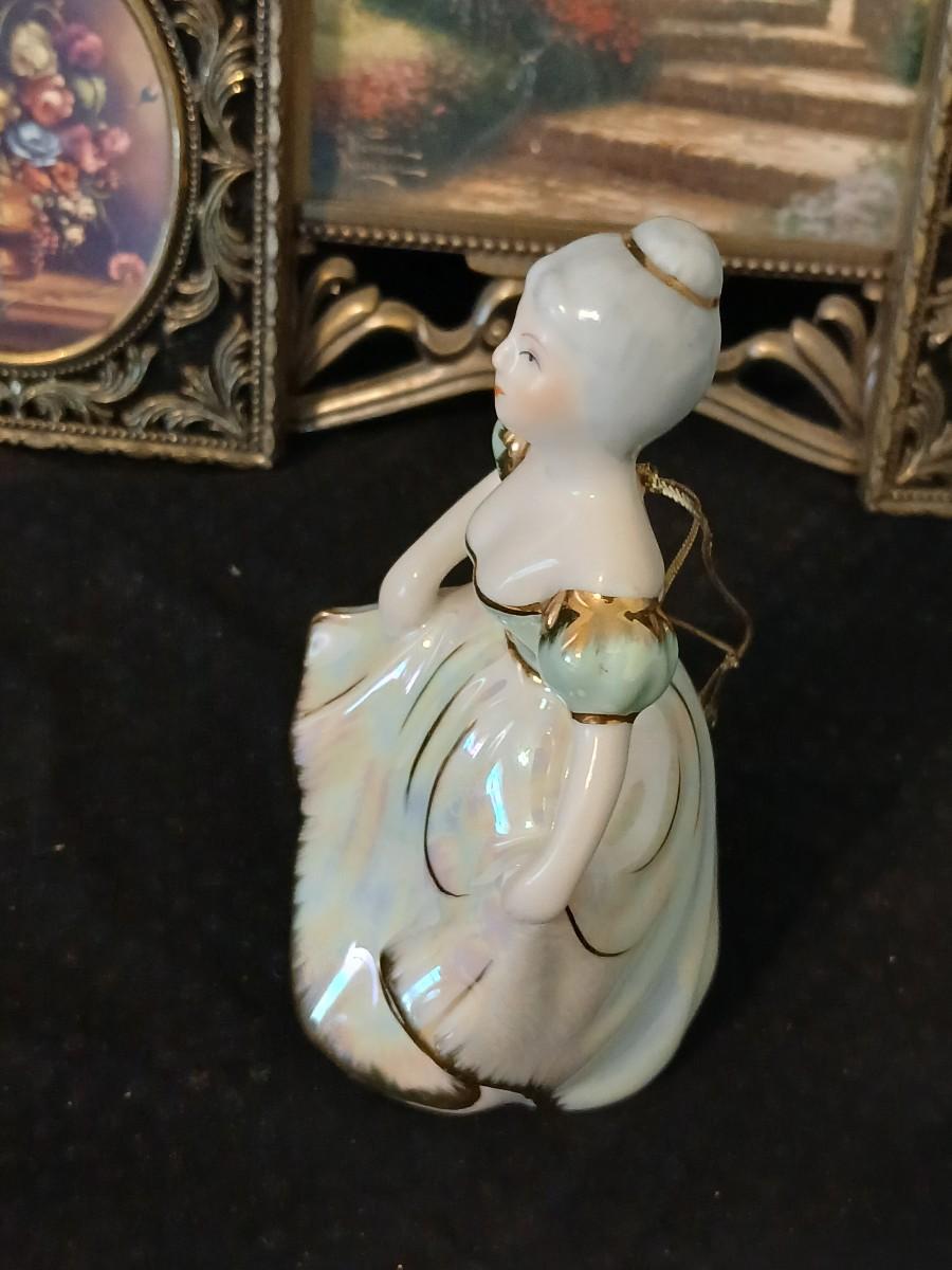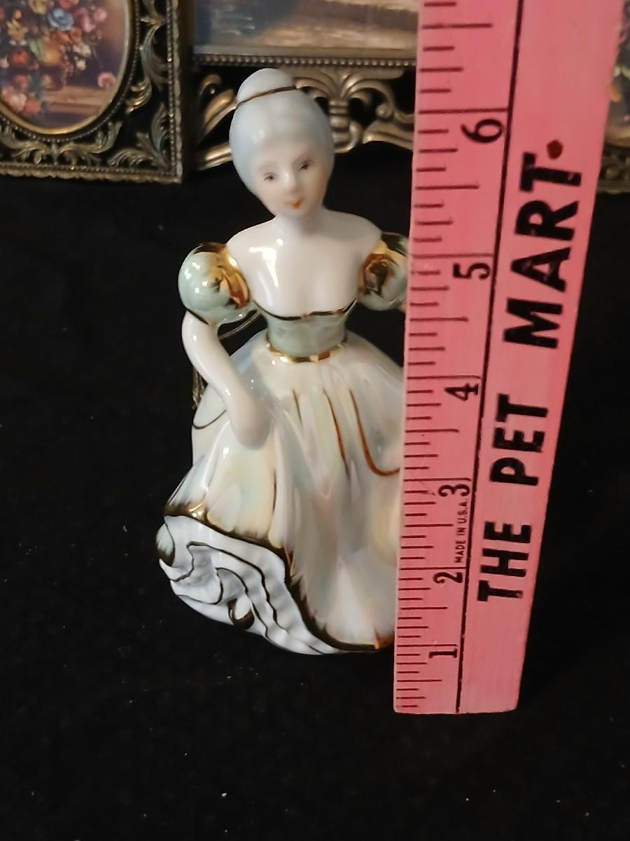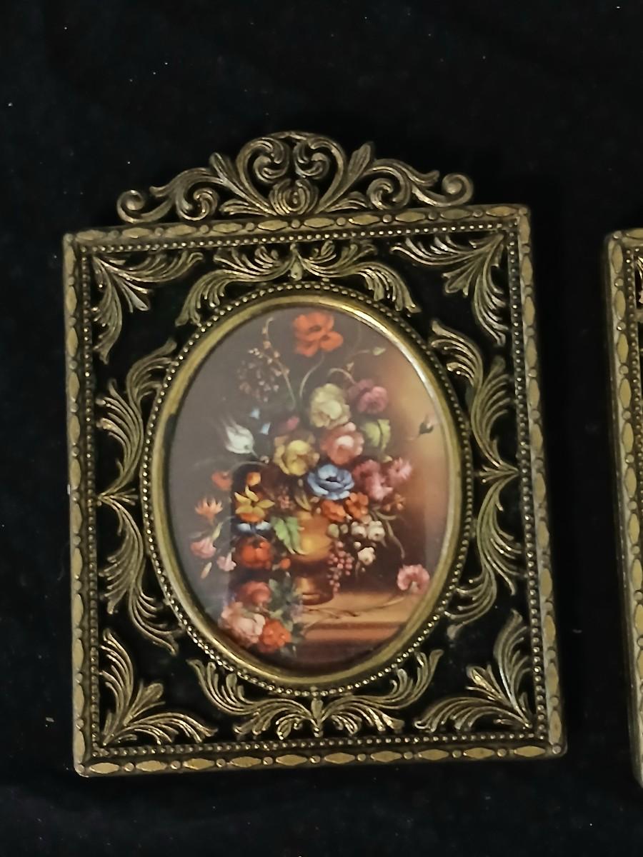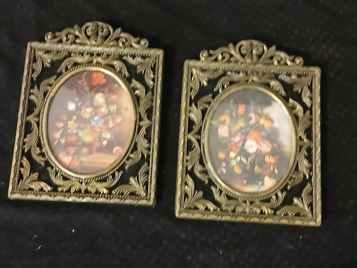 Framed print of the painting "The Hidden Gazebo" by Thomas Kinkade - Two ornate brass picture frames featuring a floral still life paintings - and aporcelain Victorian dancing lady bell figurine