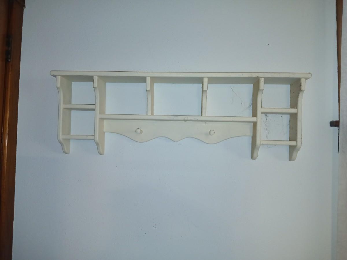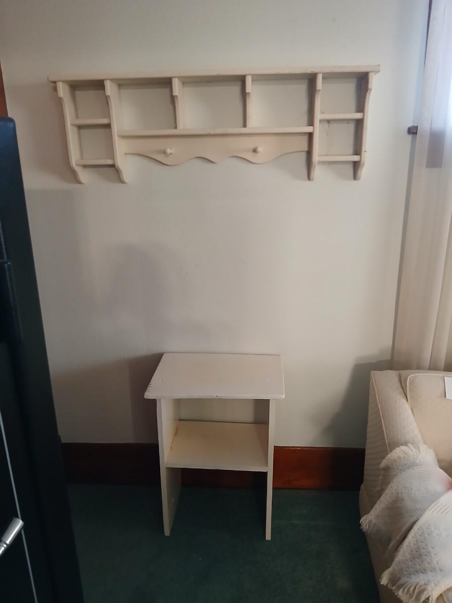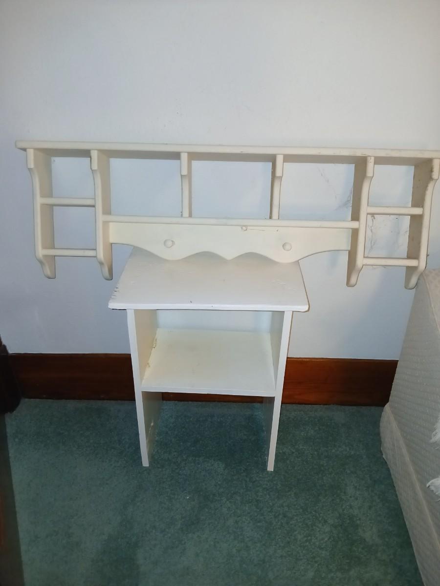 Small white table with a shelf and a wall shelf unit with many cubbies