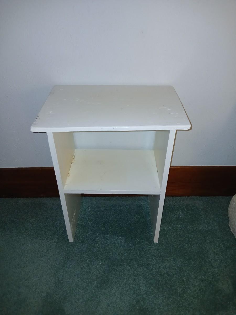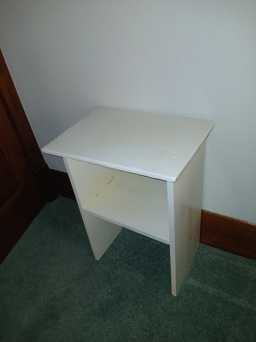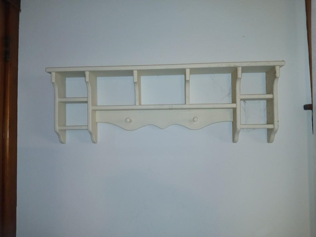 Small white table with a shelf and a wall shelf unit with many cubbies