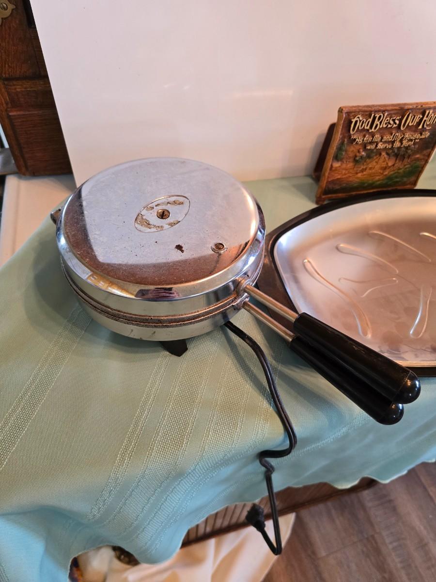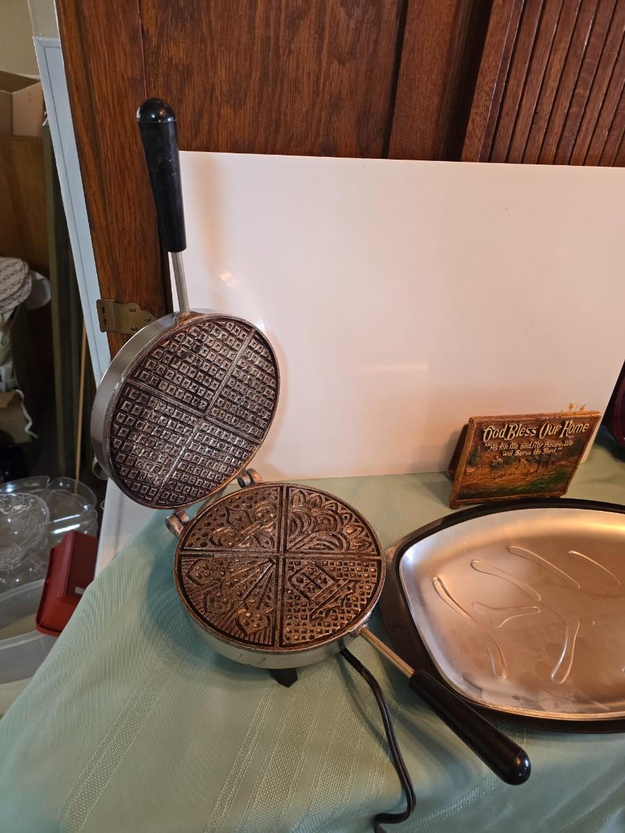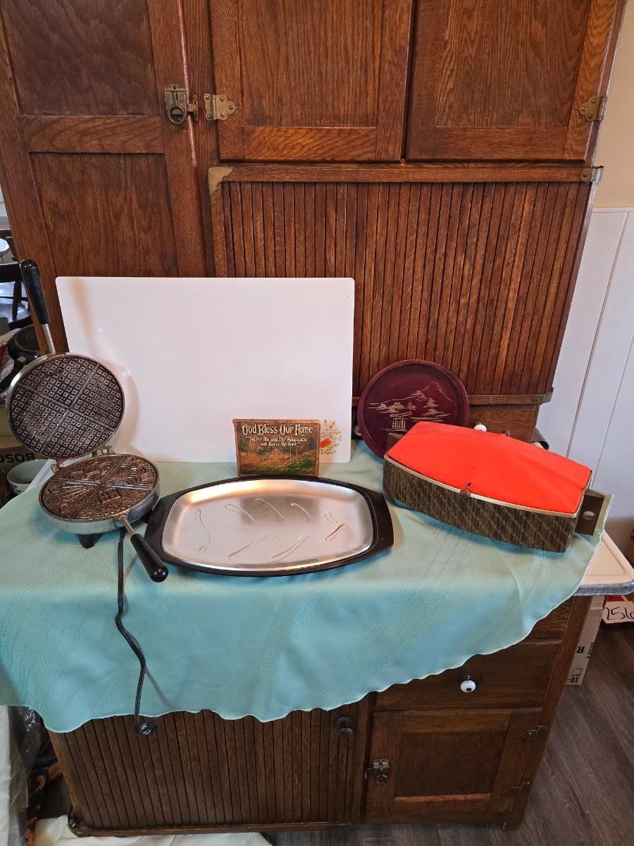 Vintage Kitchen items - Vitantonio Pizzelle Maker - Salton Hotray Bun Warmer Electric Bread Bun Warmer -"God Bless Our Home" napkin holder and more