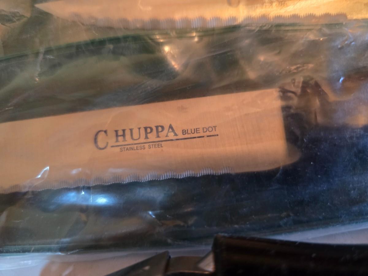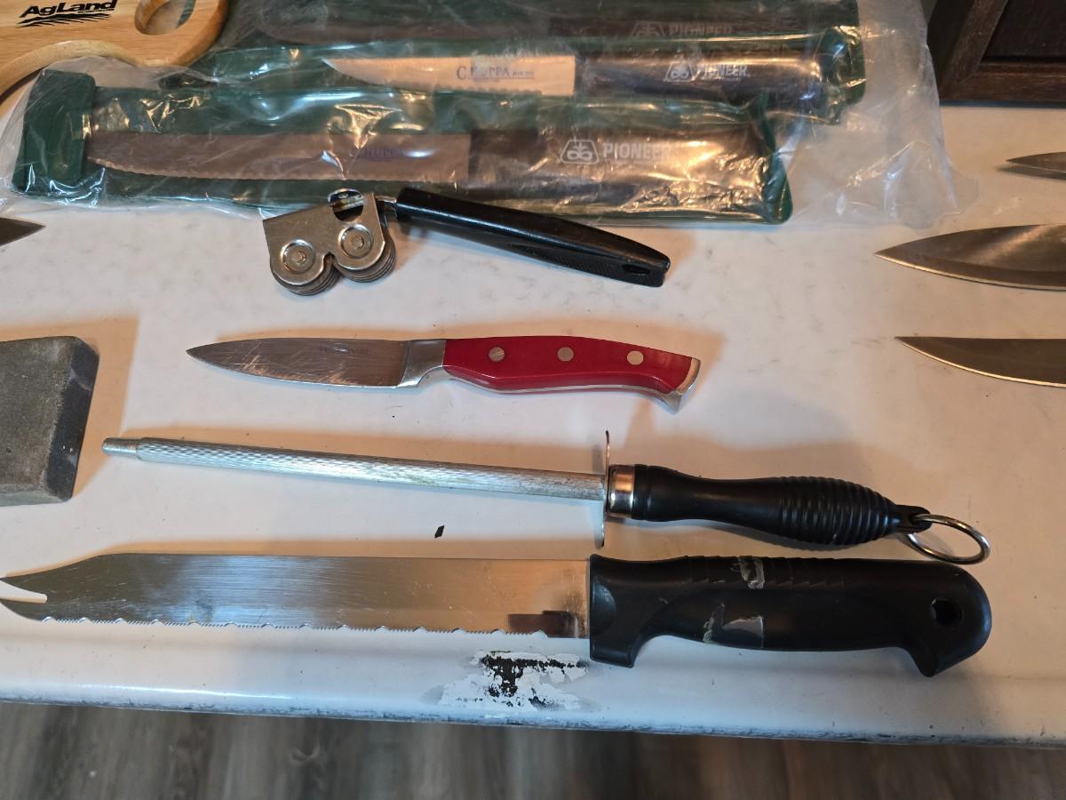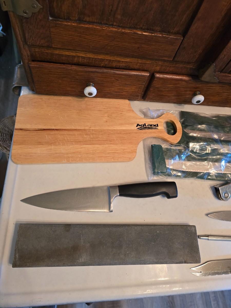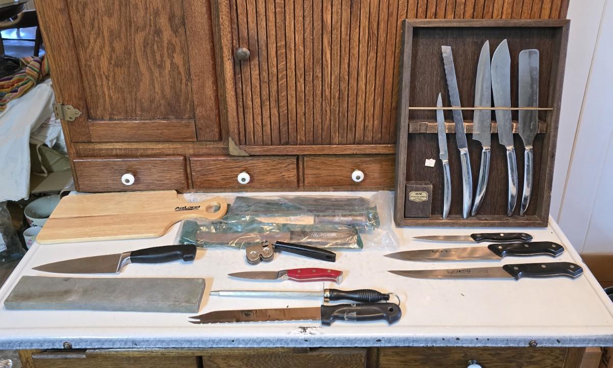 Kitchen knives - including new set of Pioneer branded Chuppa knives - sharpening stone and tools and a cutting board