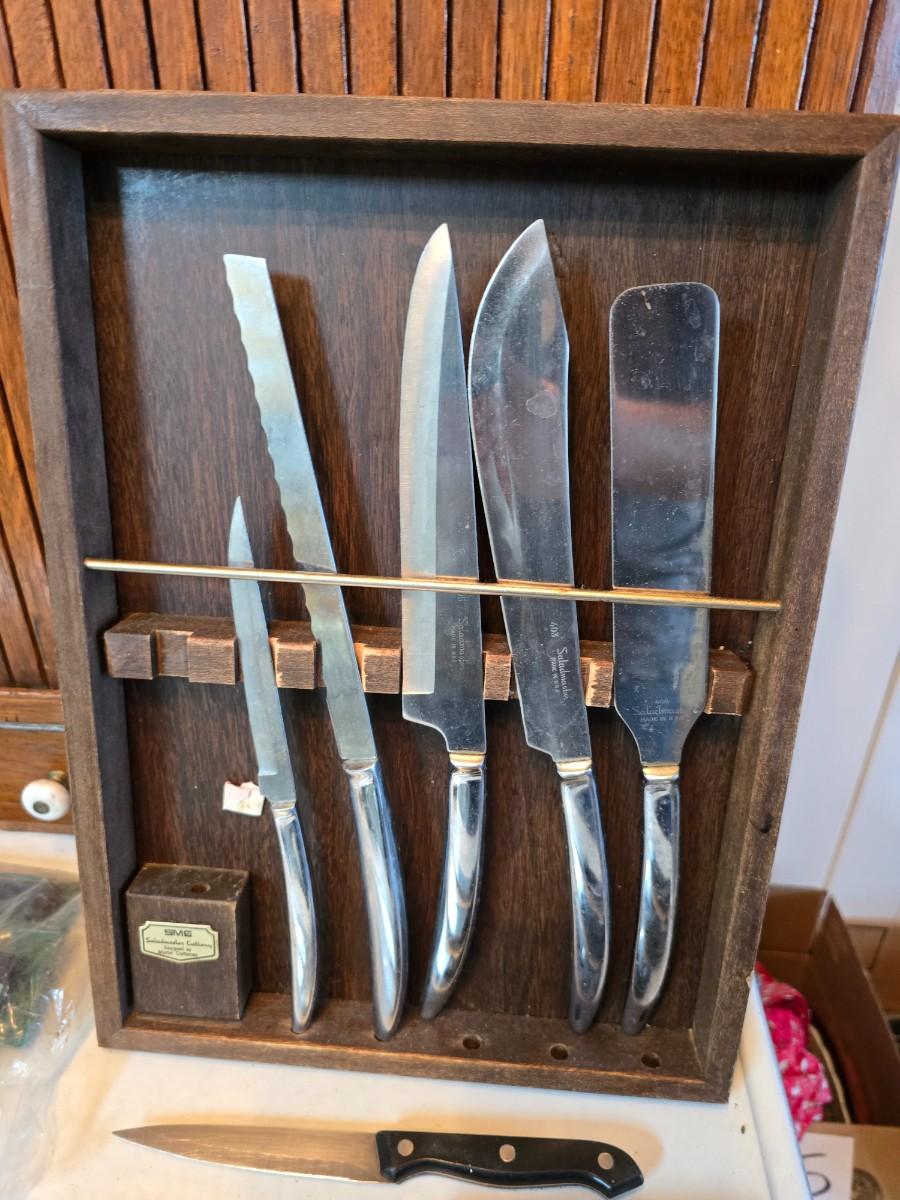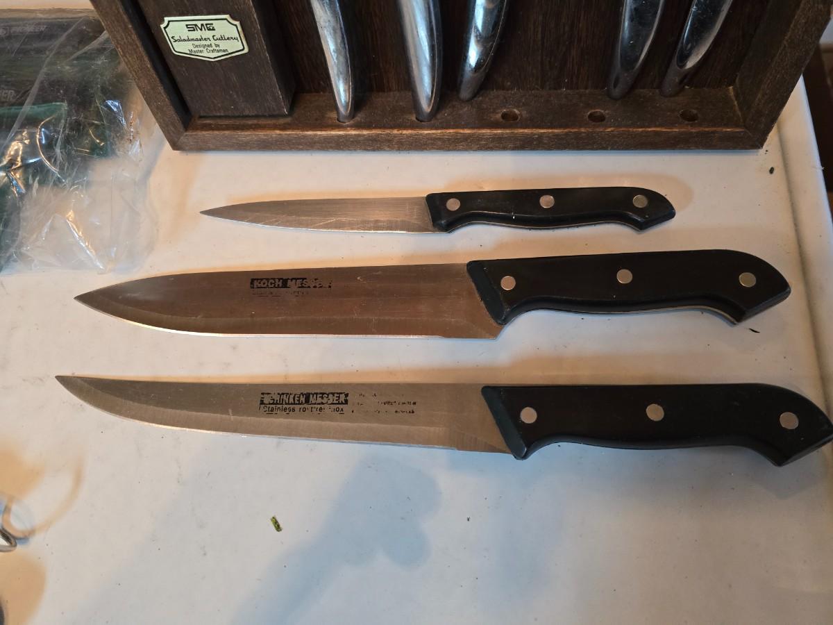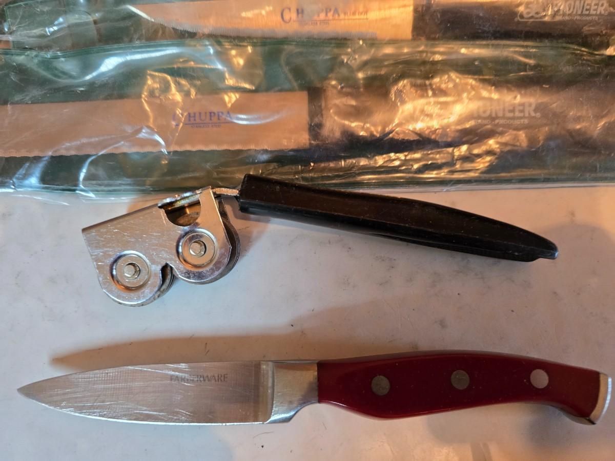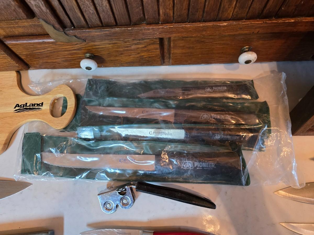 Kitchen knives - including new set of Pioneer branded Chuppa knives - sharpening stone and tools and a cutting board