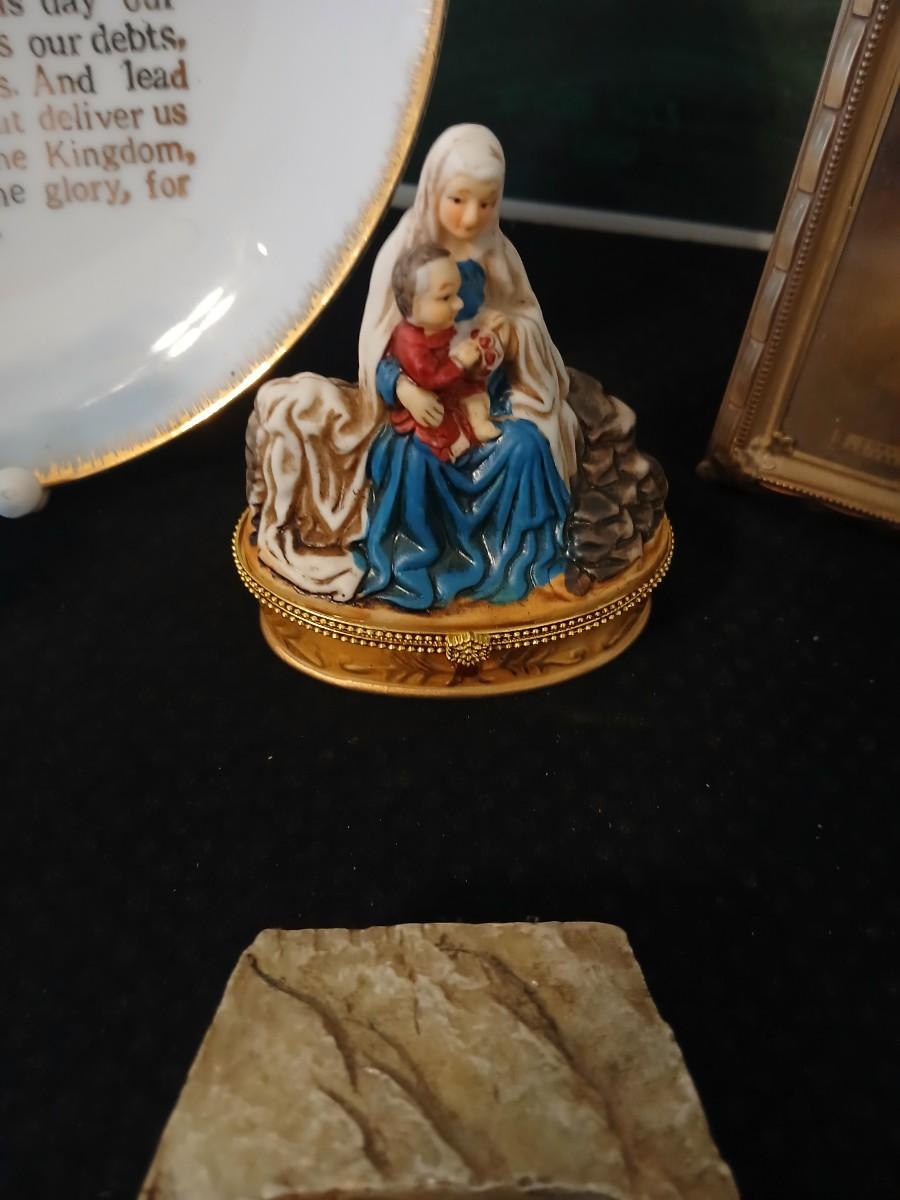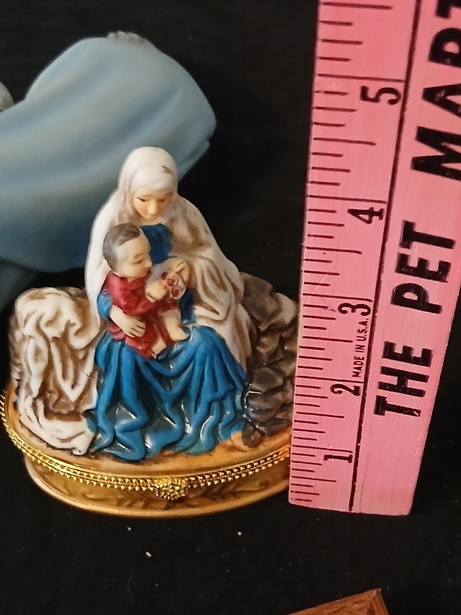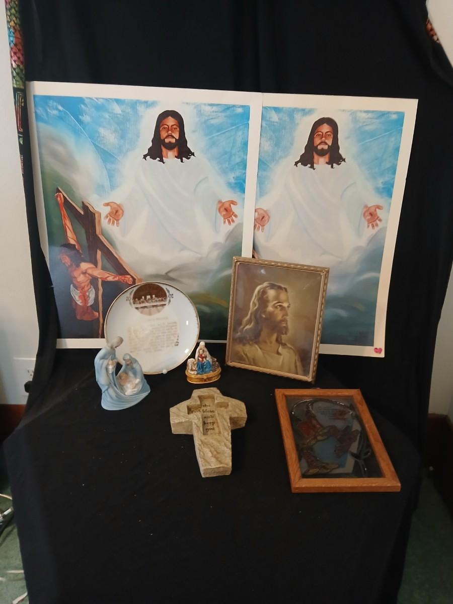 Religious decorative items - Nativity Scene Holy Family -Madonna & Child trinket box - Christian cross made of resin - framed Jesus Litho - and more