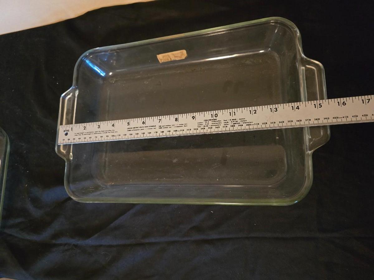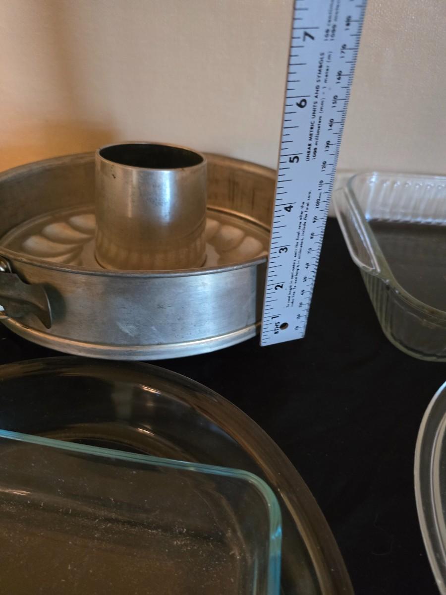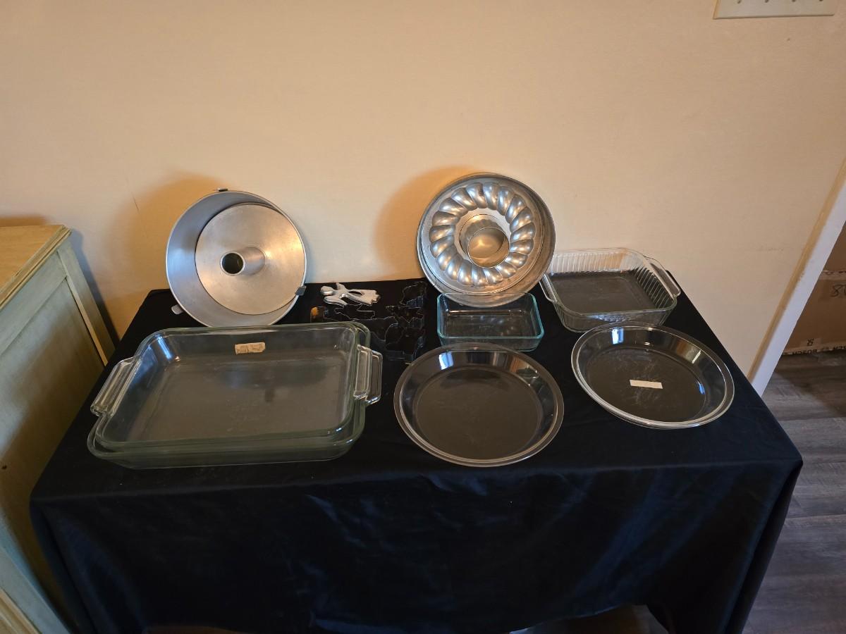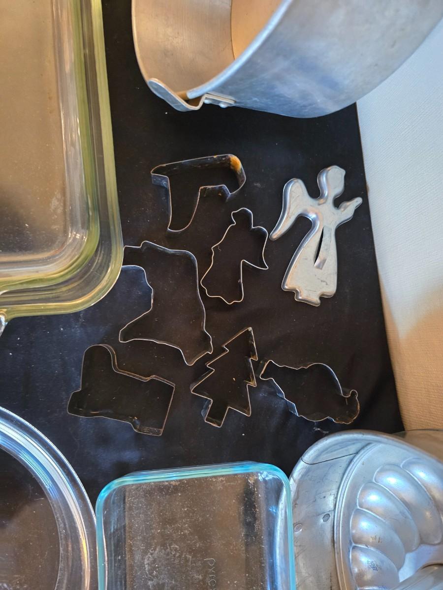 Pyrex / Anchor hocking Clear Glass & aluminum baking pans with vintage cookie cutters