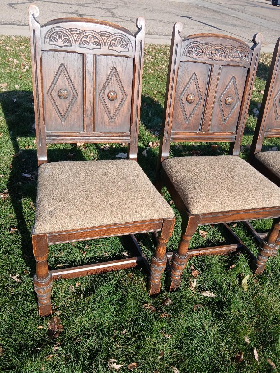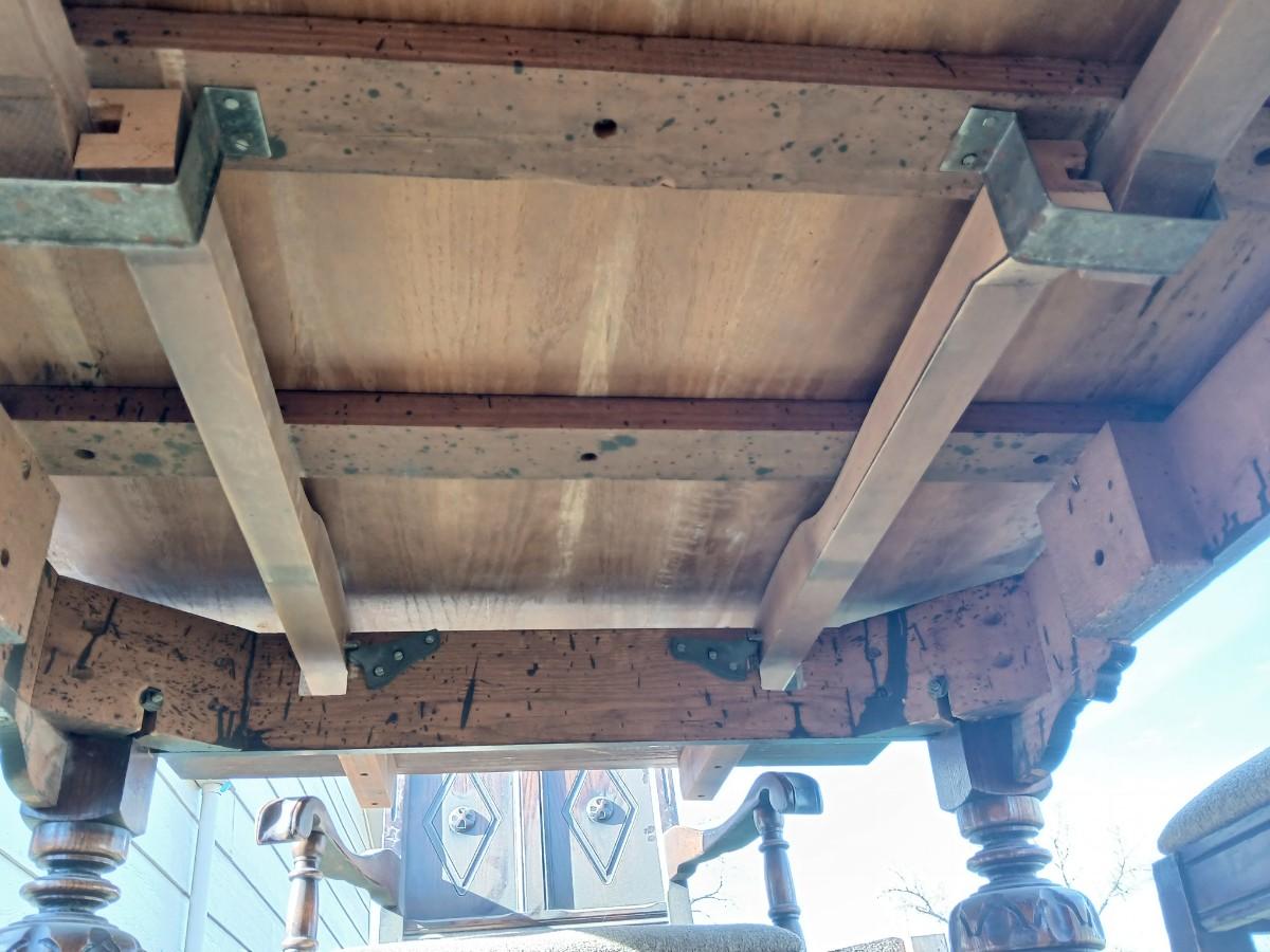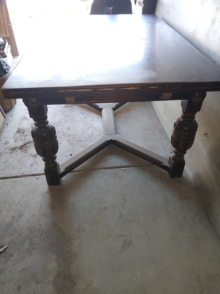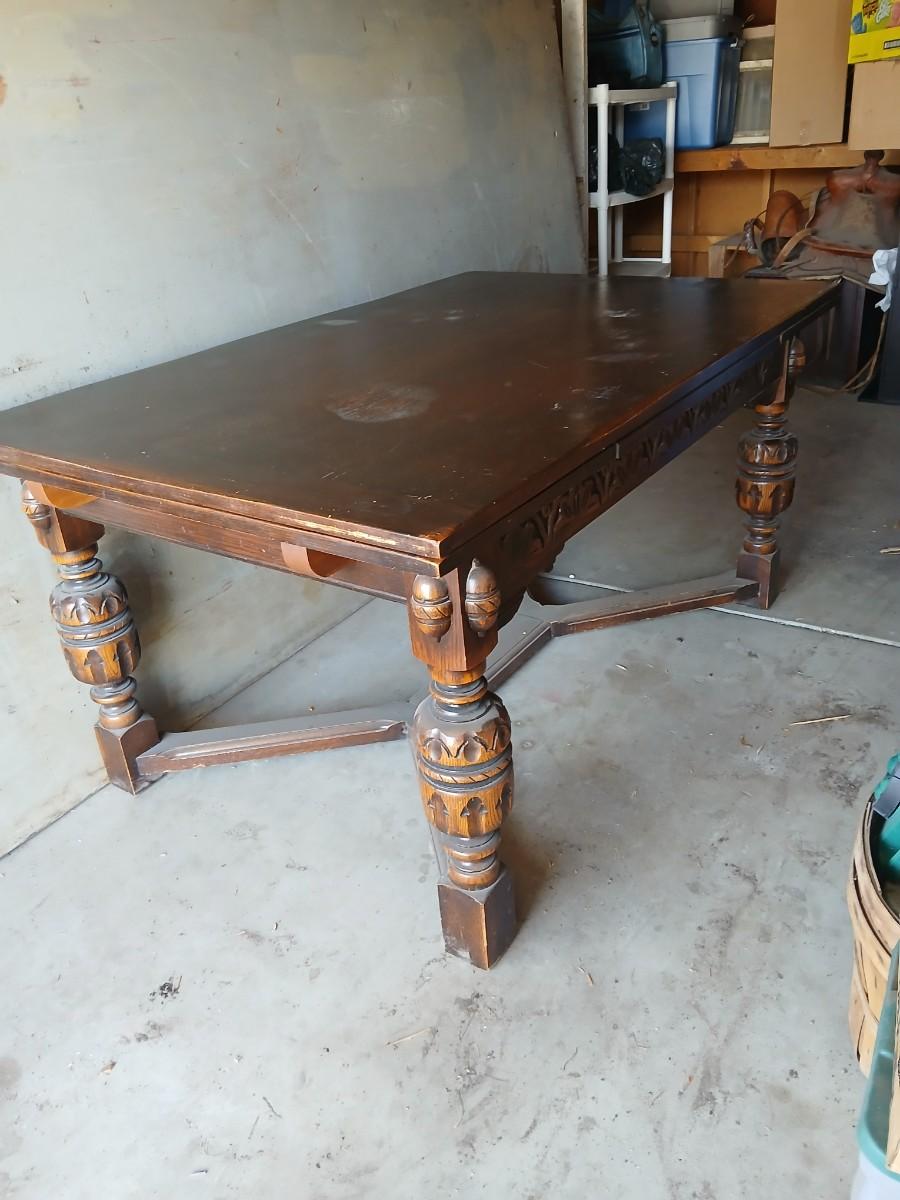 This table was our clients' grandparents table - well over 100 years old - 20th century or so. The table and chairs are sturdy; however, the table does have some staining and scratches