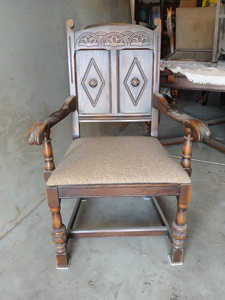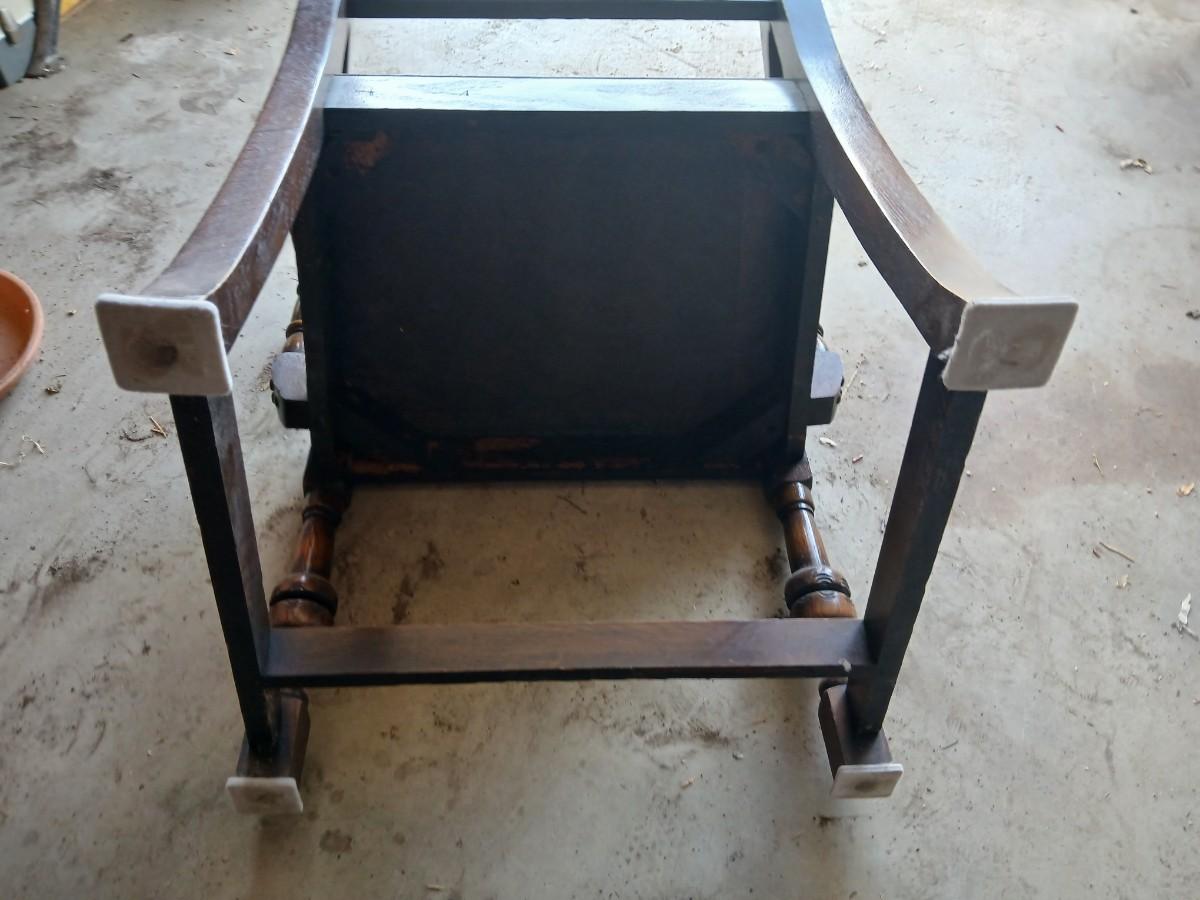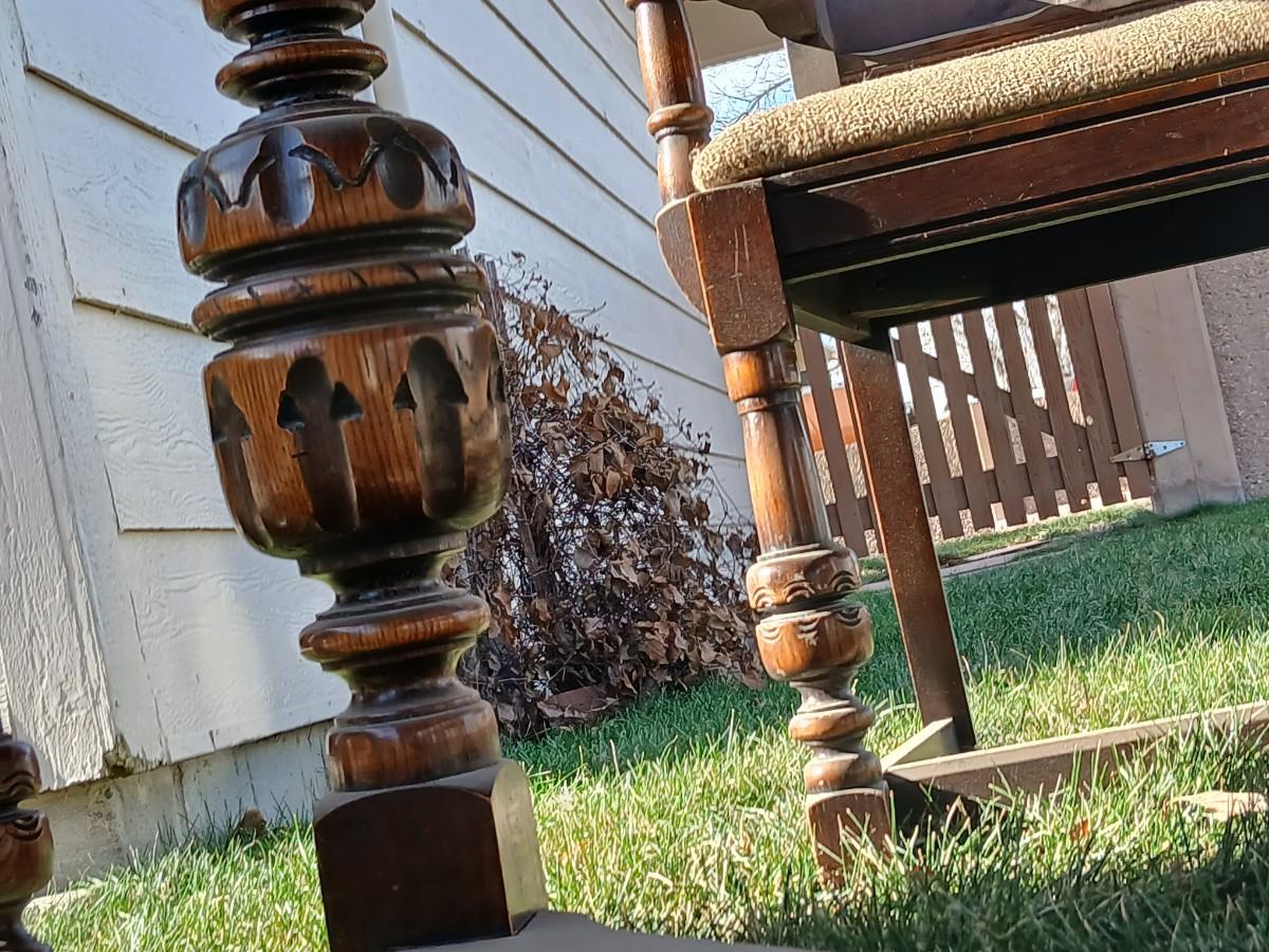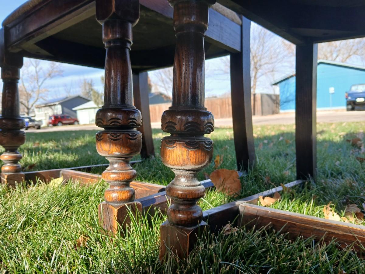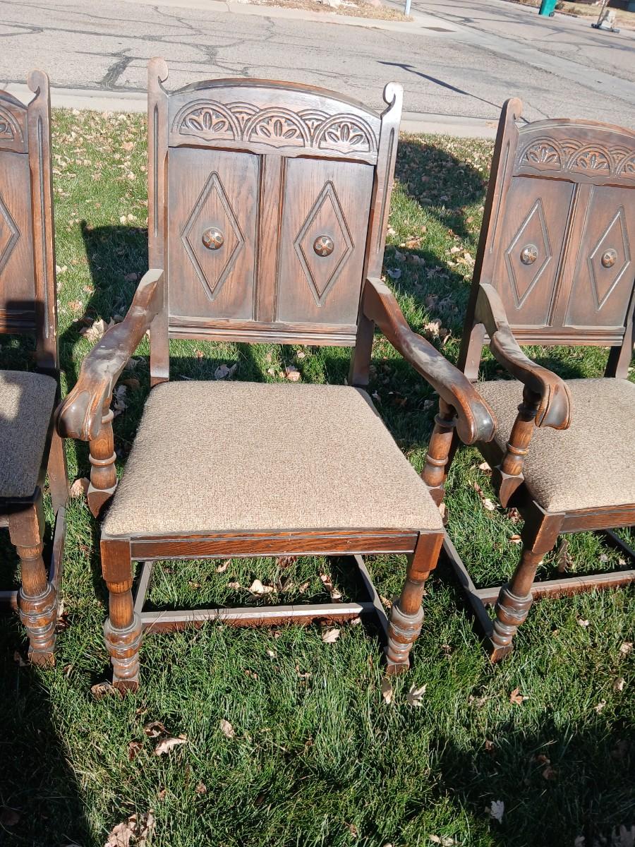 This table was our clients' grandparents table - well over 100 years old - 20th century or so. The table and chairs are sturdy; however, the table does have some staining and scratches
