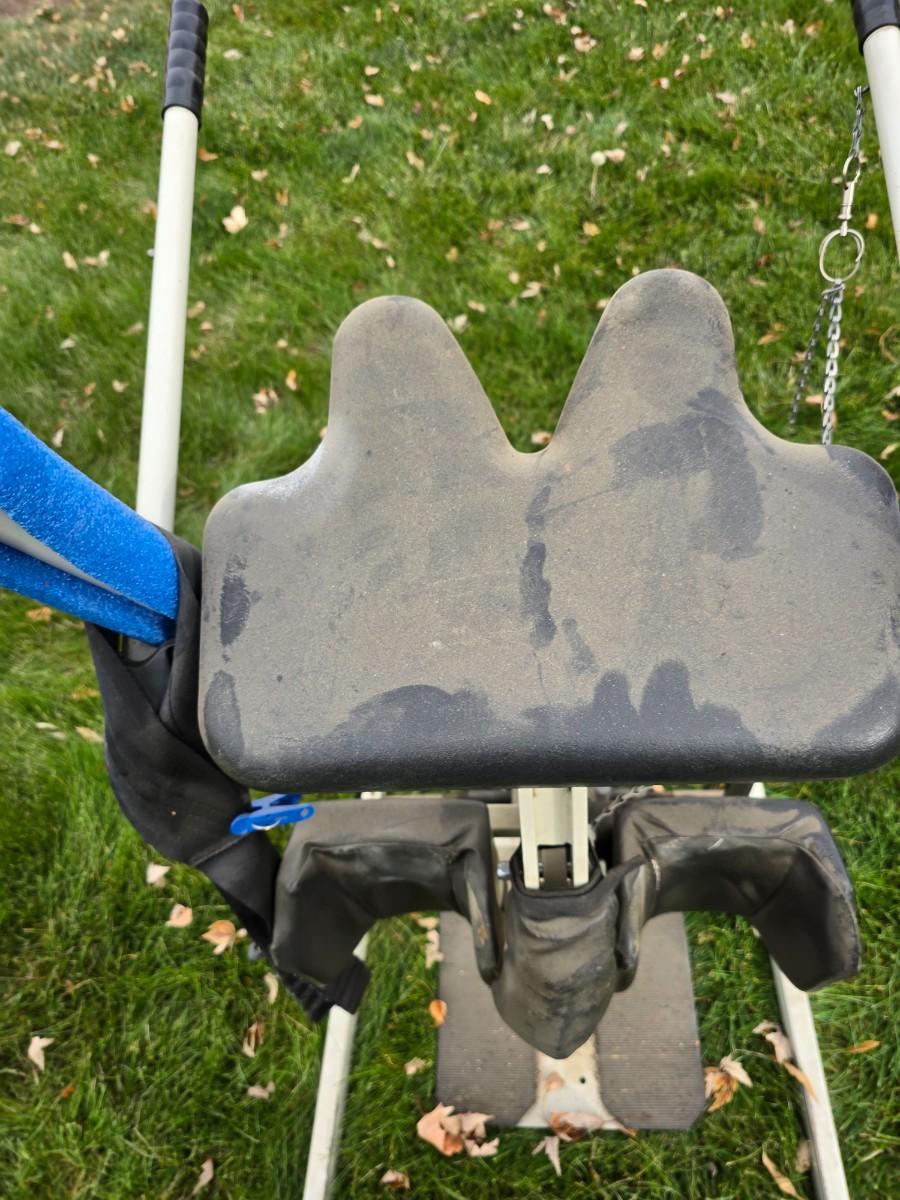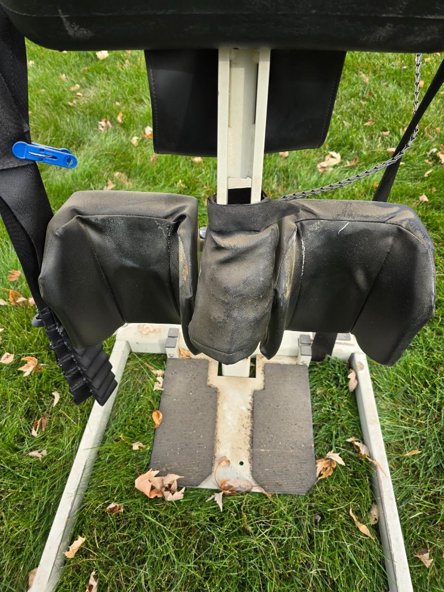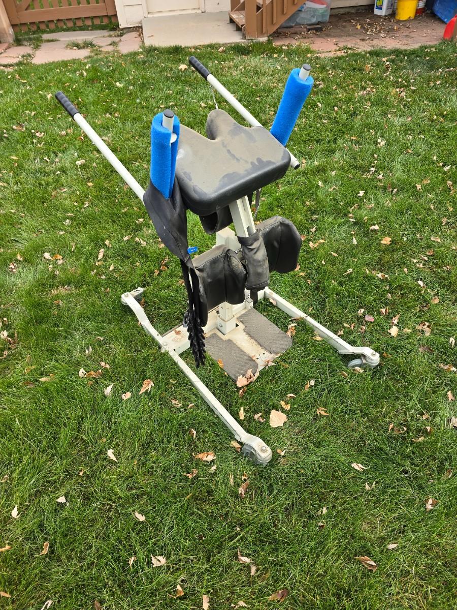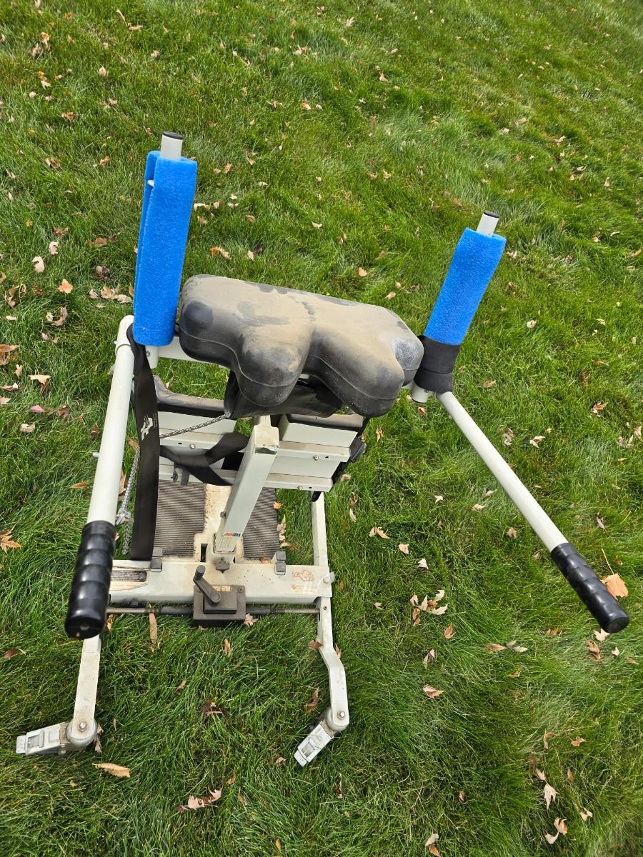 Features: The image shows a padded seat, blue padded leg supports, and handles for the user to grip.