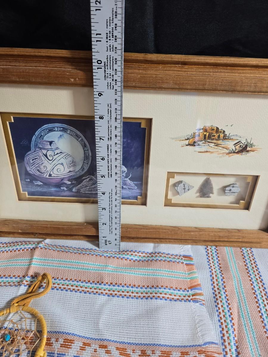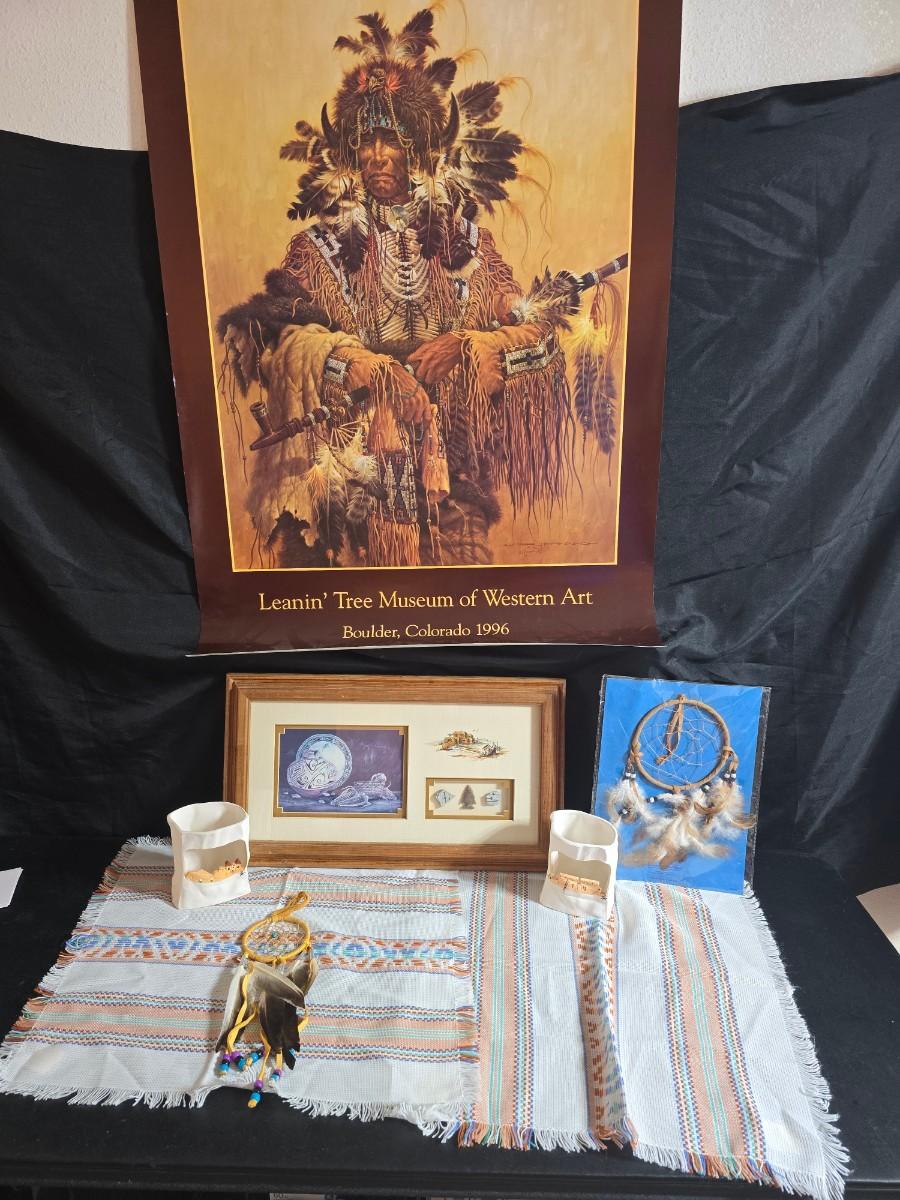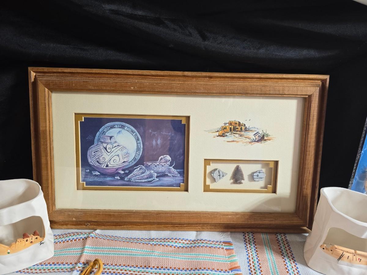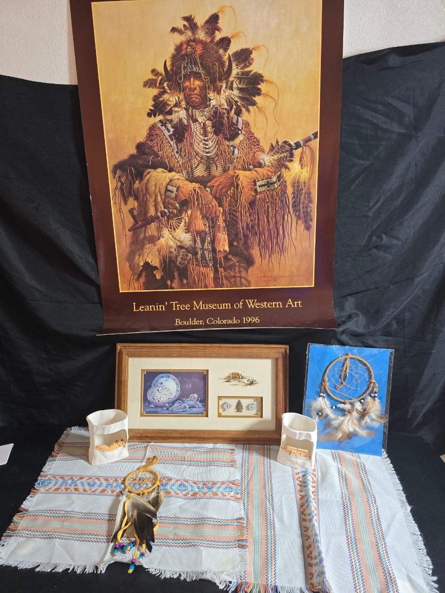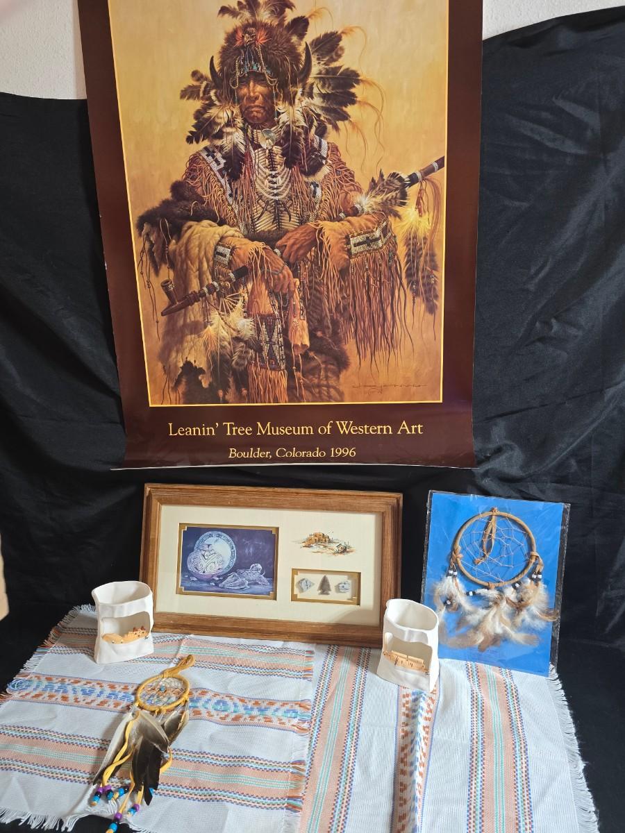 Laverne Elliott framed artwork with arrowhead and pottery - Dreamcatcher s- hand carved & painted candle sconces and a leanin' tree Indian poster