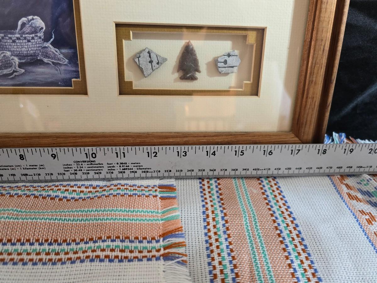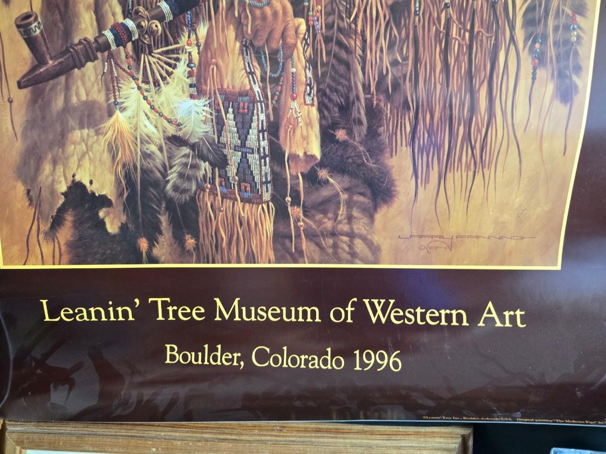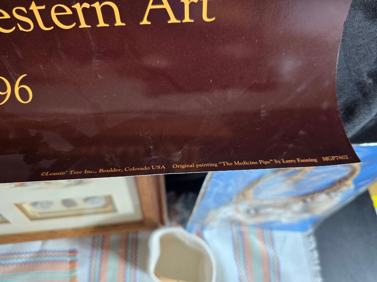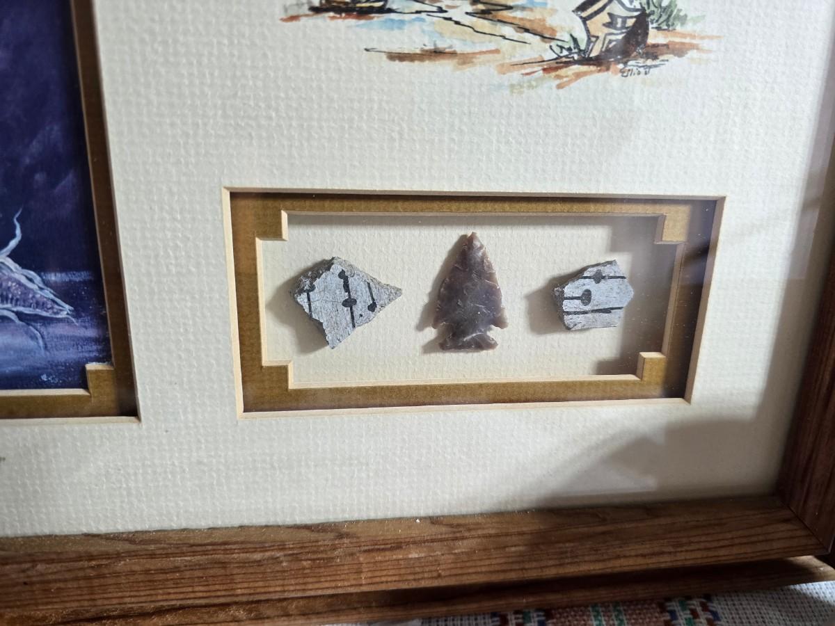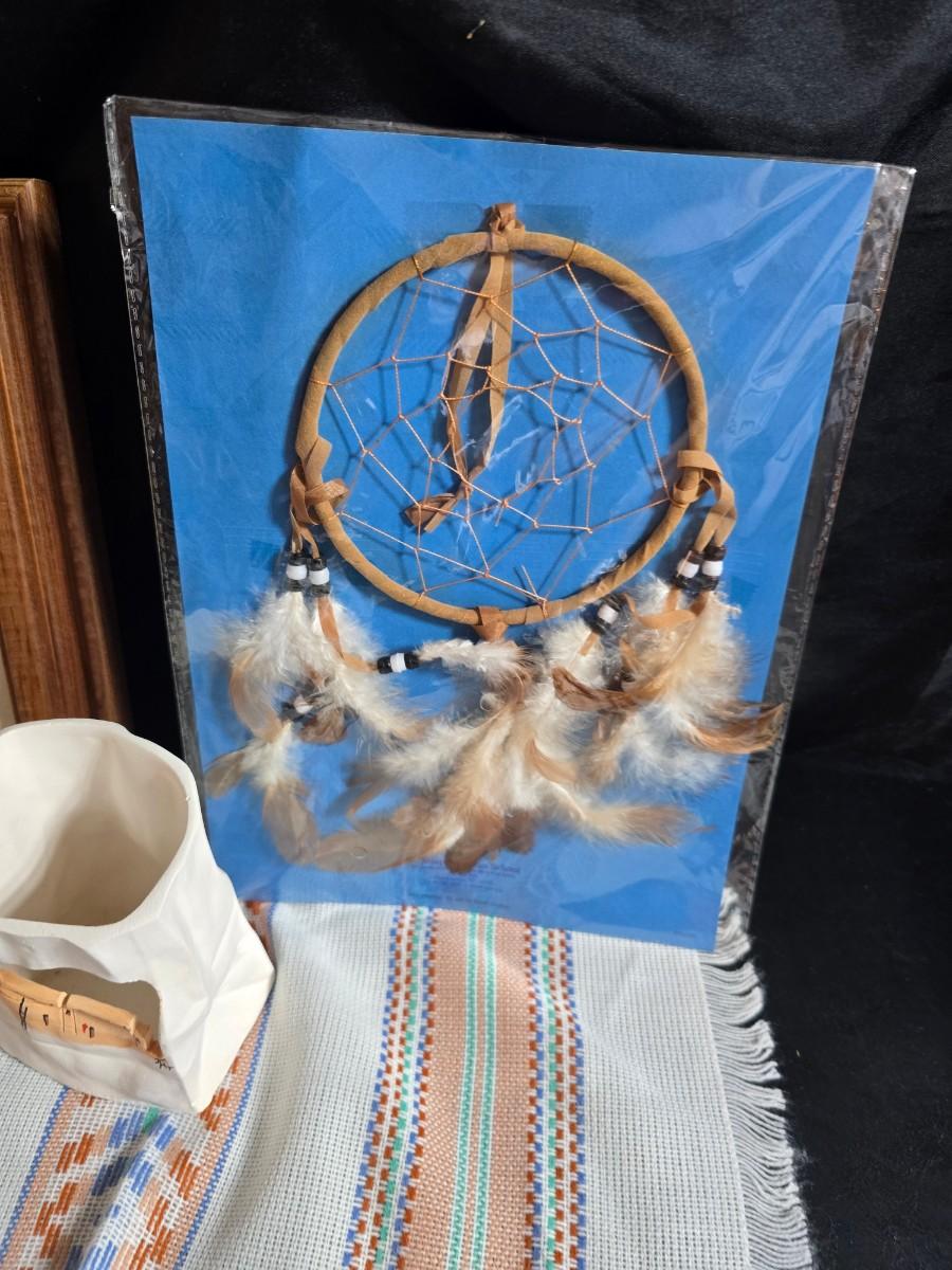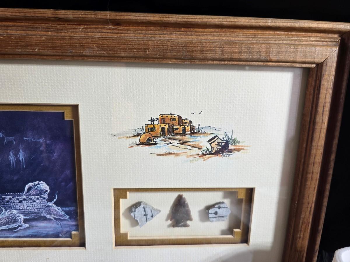 Laverne Elliott framed artwork with arrowhead and pottery - Dreamcatcher s- hand carved & painted candle sconces and a leanin' tree Indian poster