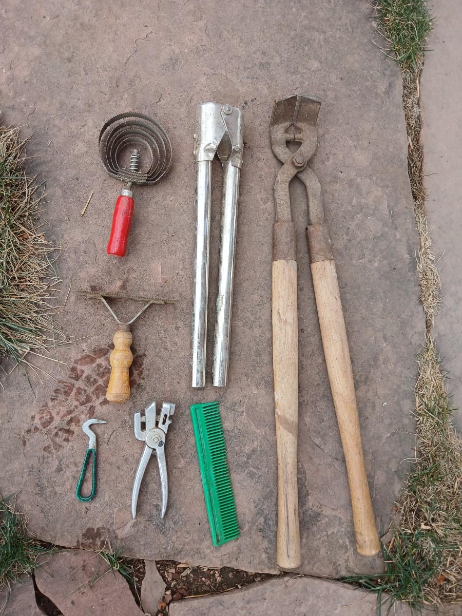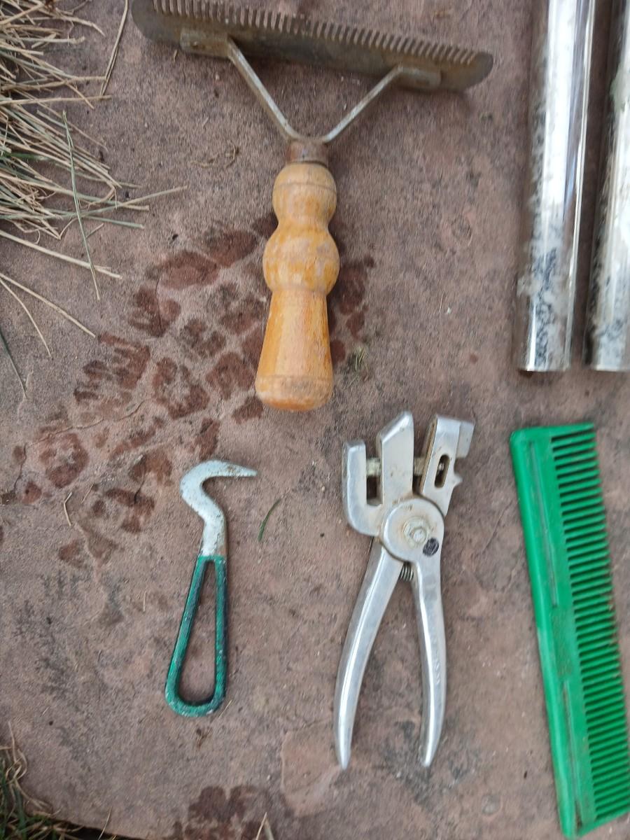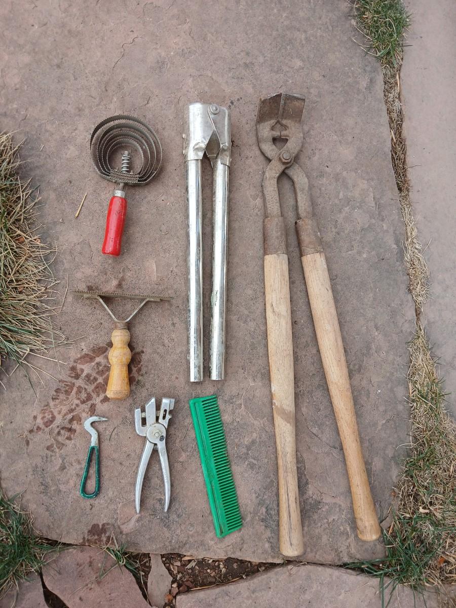 Livestock items - dehorner - trimmers - tagger - assortment of brushes and more