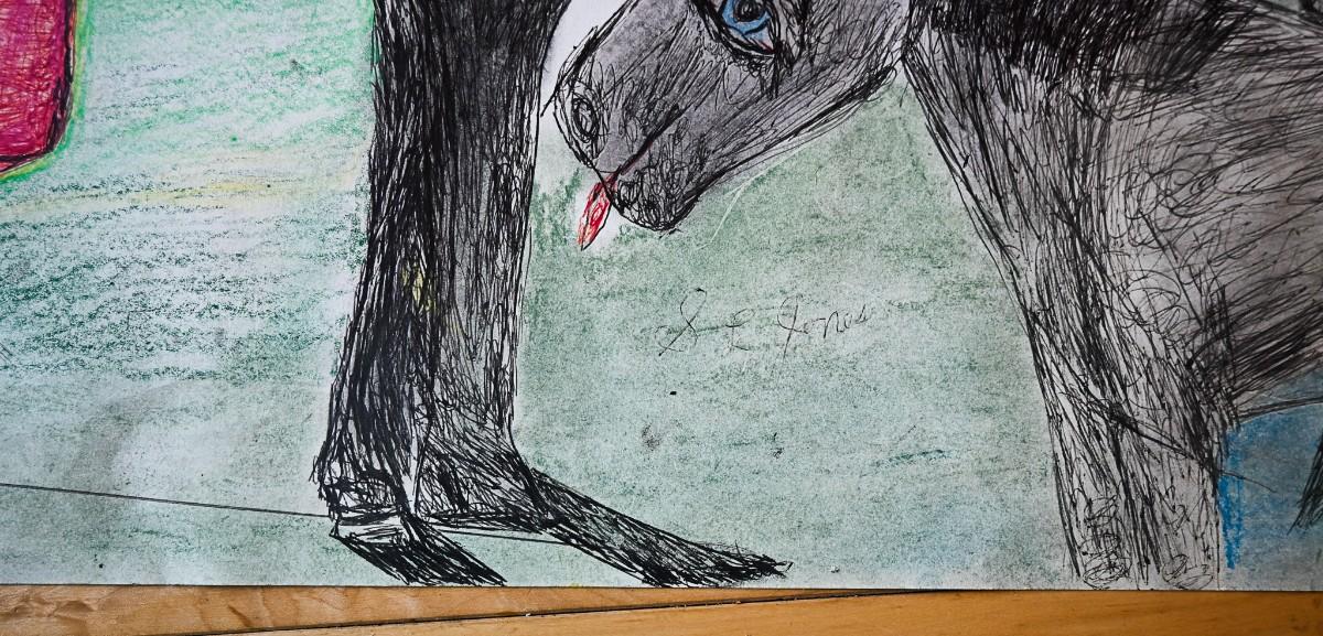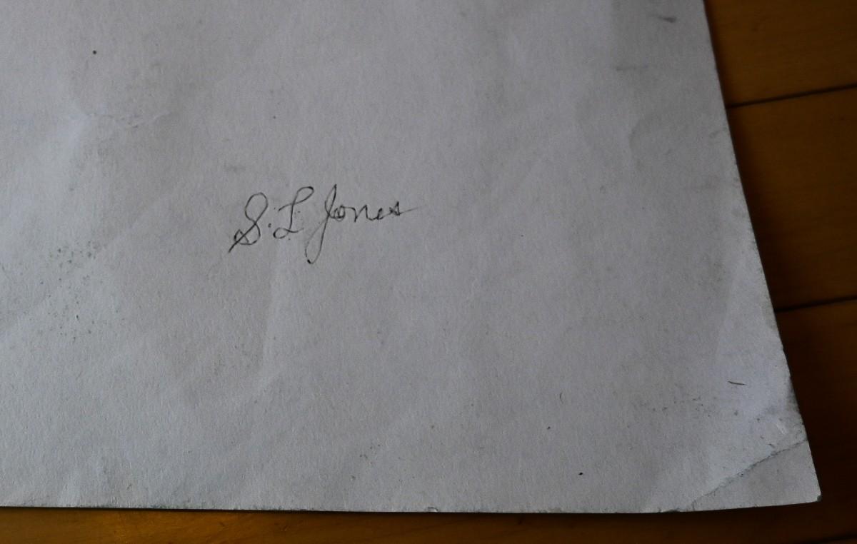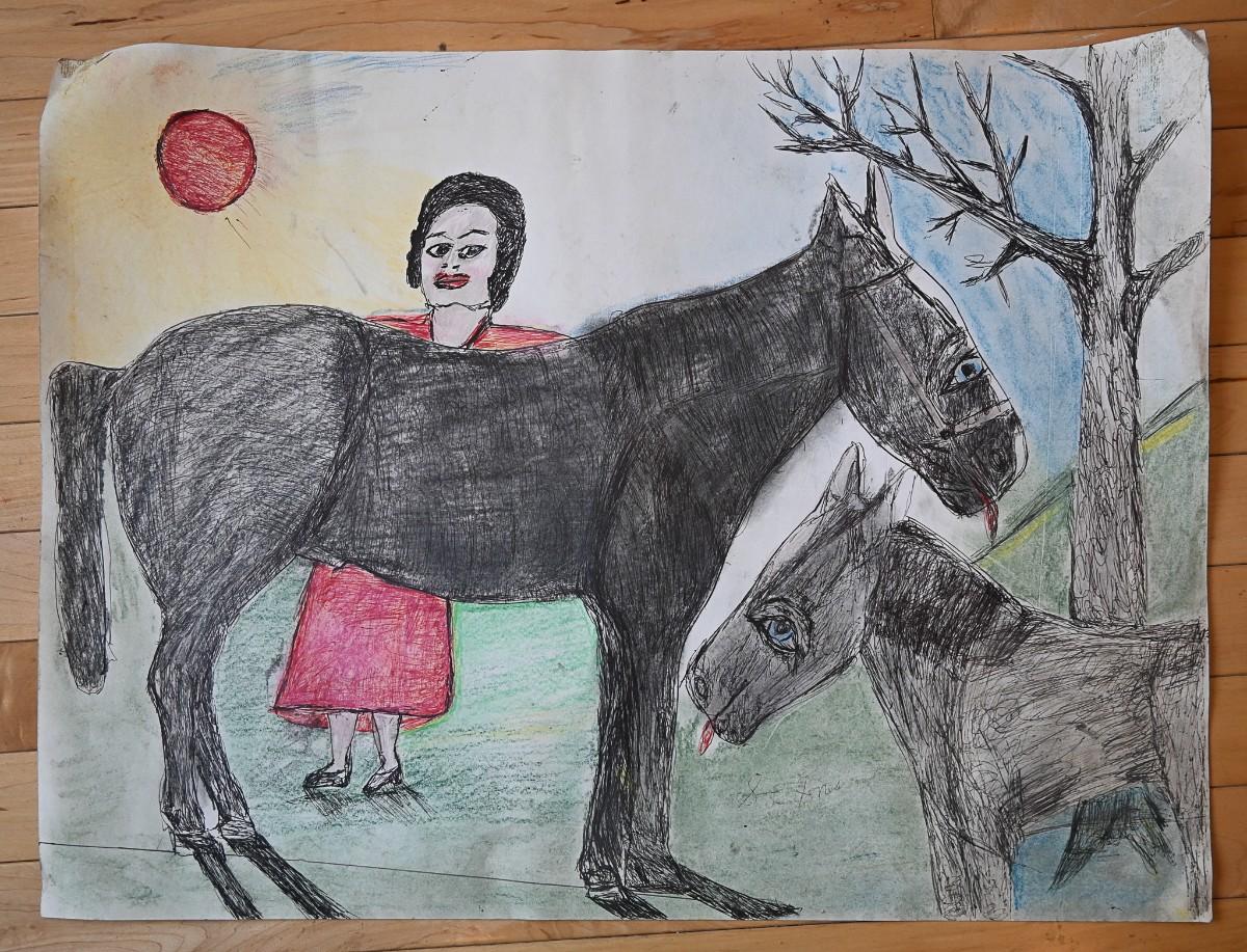 An untitled illustration of a horse by artist S. L. Jones. Mixed media. Approx. 18" x 24". Please note the creased condition of the paper, including the curling corners.