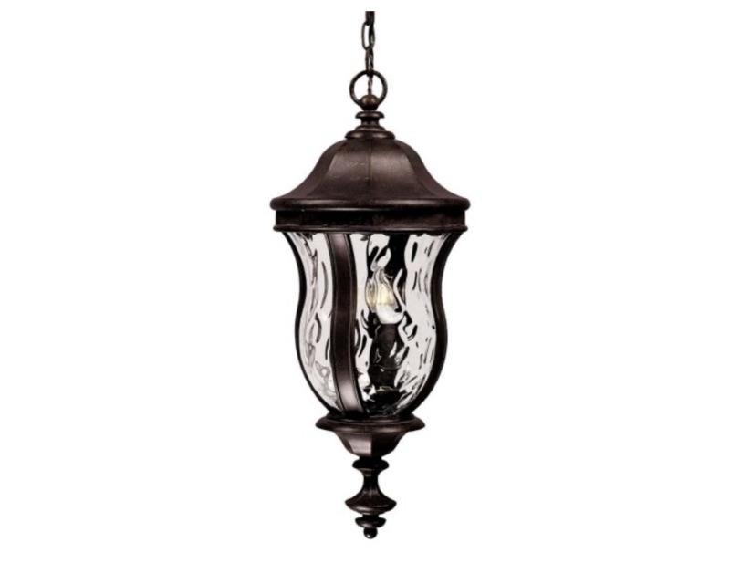 Outdoor lighting with charming traditional style and finely crafted details thats the Monticello, designed by Karyl Pierce Paxton and constructed with high quality engineering by Savoy House. The lantern has a graceful bell shape, with a curved, tiered roof, matching multi-tiered finial, and decorative ring attachment to the chain and the entire frame has a stately, bronze-like, walnut patina finish. The shade is made of gorgeous, clear, water glass, adding to the timeless appeal. Three 40W, C-style bulbs within, illuminate the exterior of your home with a welcoming glow. This 10" wide, 24" high hanging lantern brings classic style to your porch, patio, sunroom, pergola, and other covered living areas in your yard and garden.