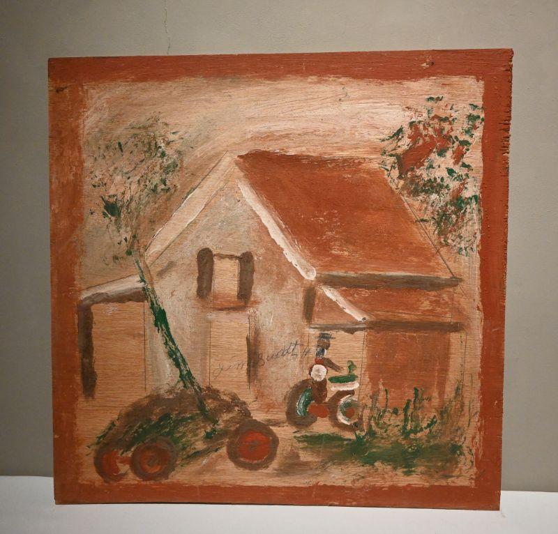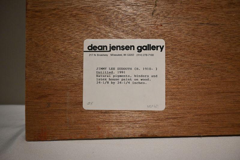 Untitled (1991) by artist Jimmy Lee Sudduth (1910-). Natural pigments, binders, and latex house paint on wood. Approx. 24" x 24".