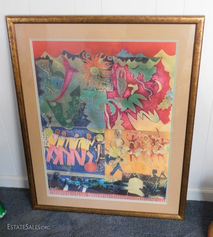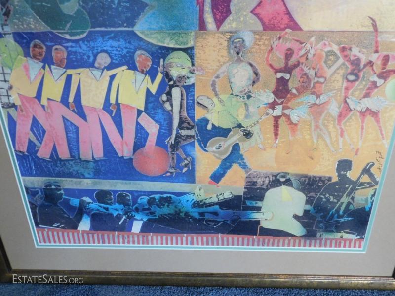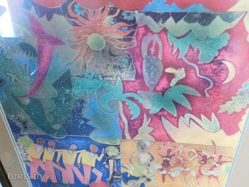 This extremely colorful art has a collage of music and dancing people in celebration of life. Reminds of New Orleans Jazz or folksy style festivals. Extremely eye catching.