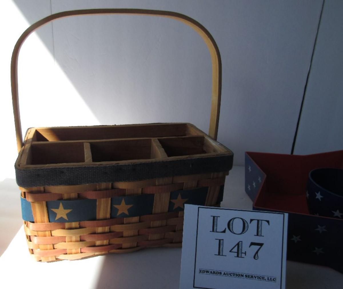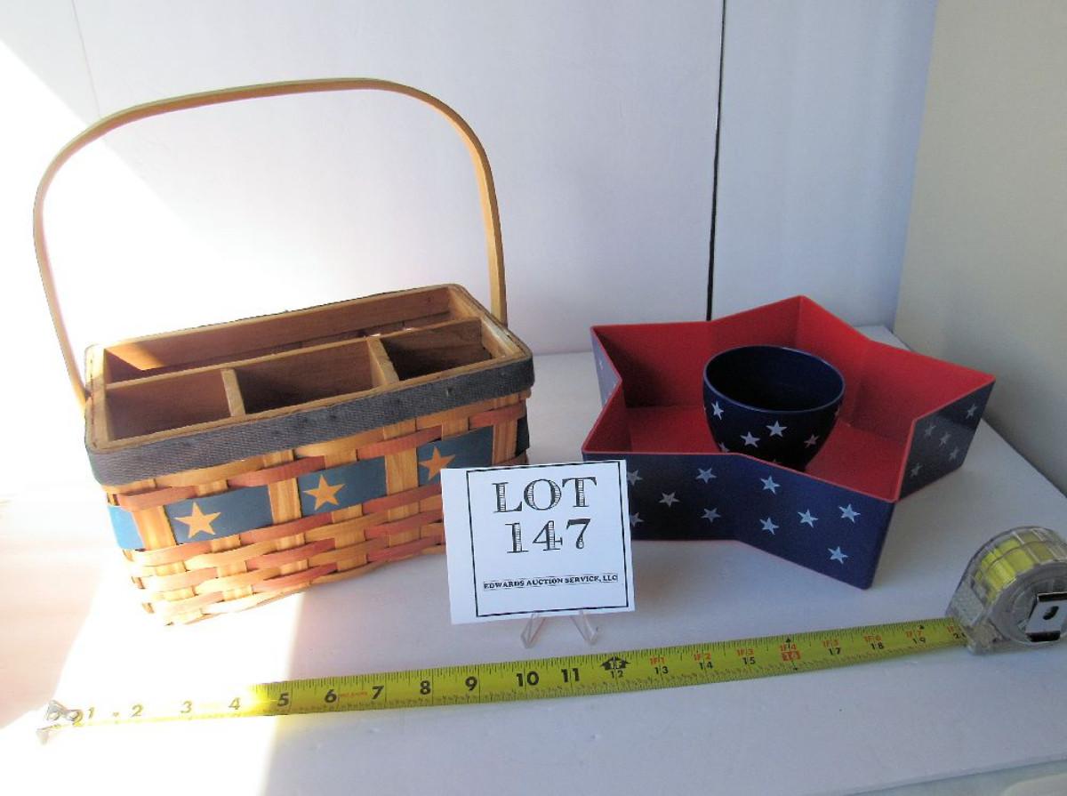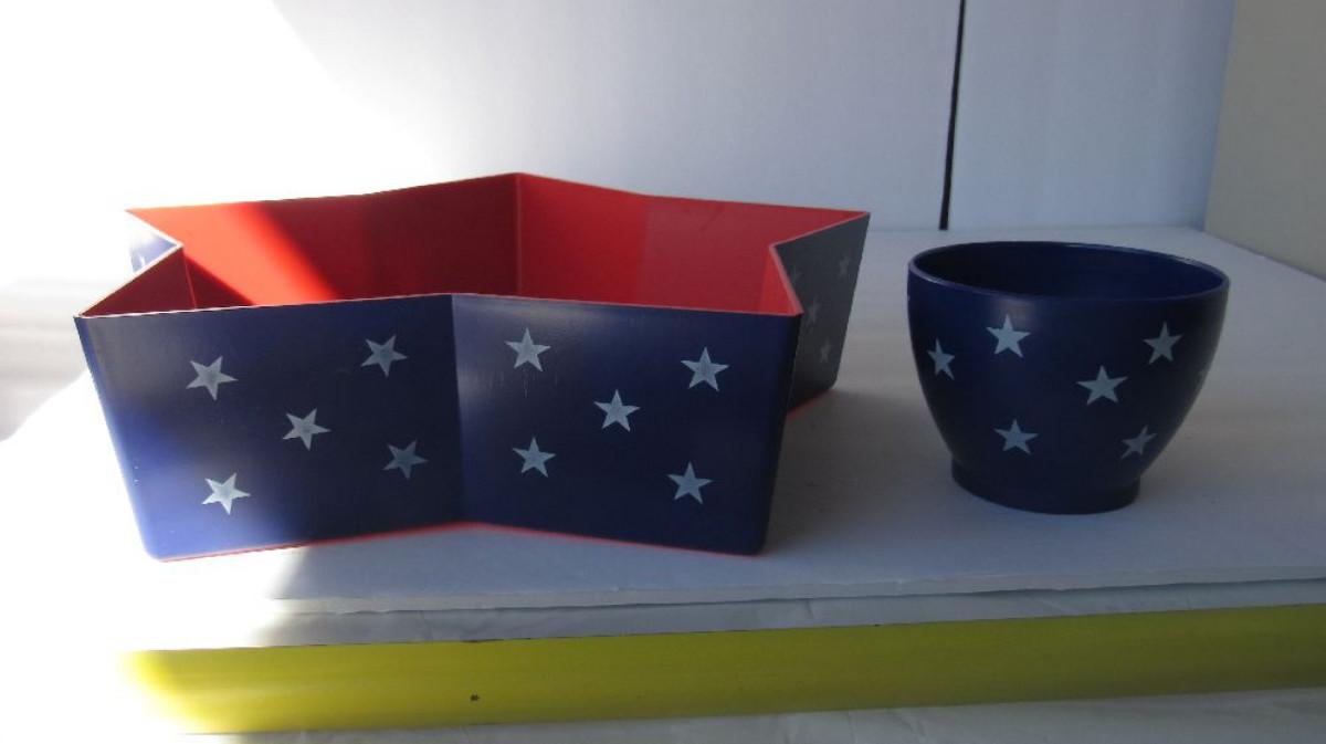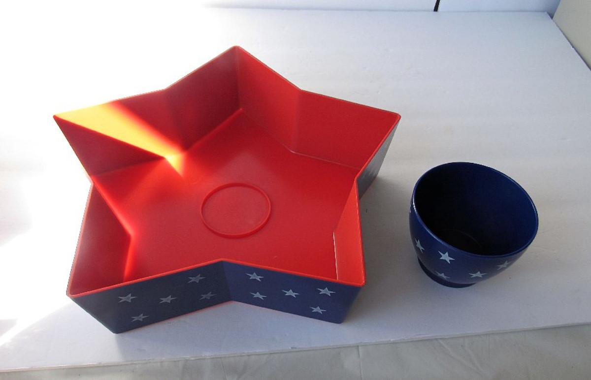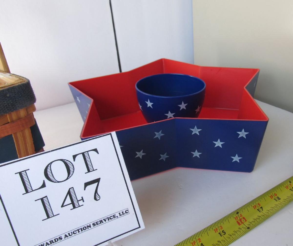 Unused Patriotic Chip and Dip Set and Patriotic Utensil/Napkin Basket