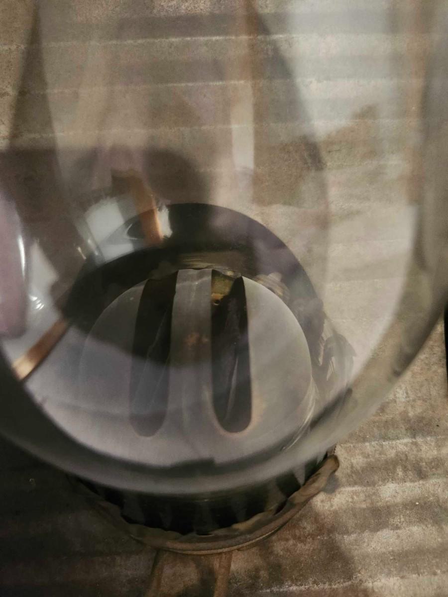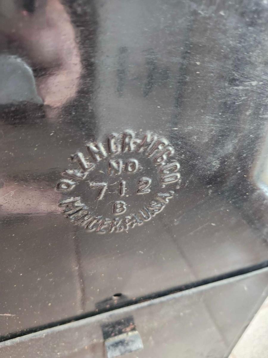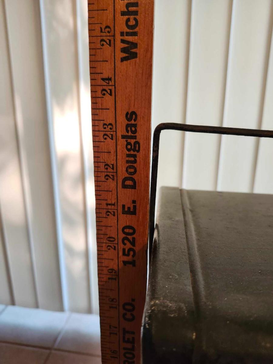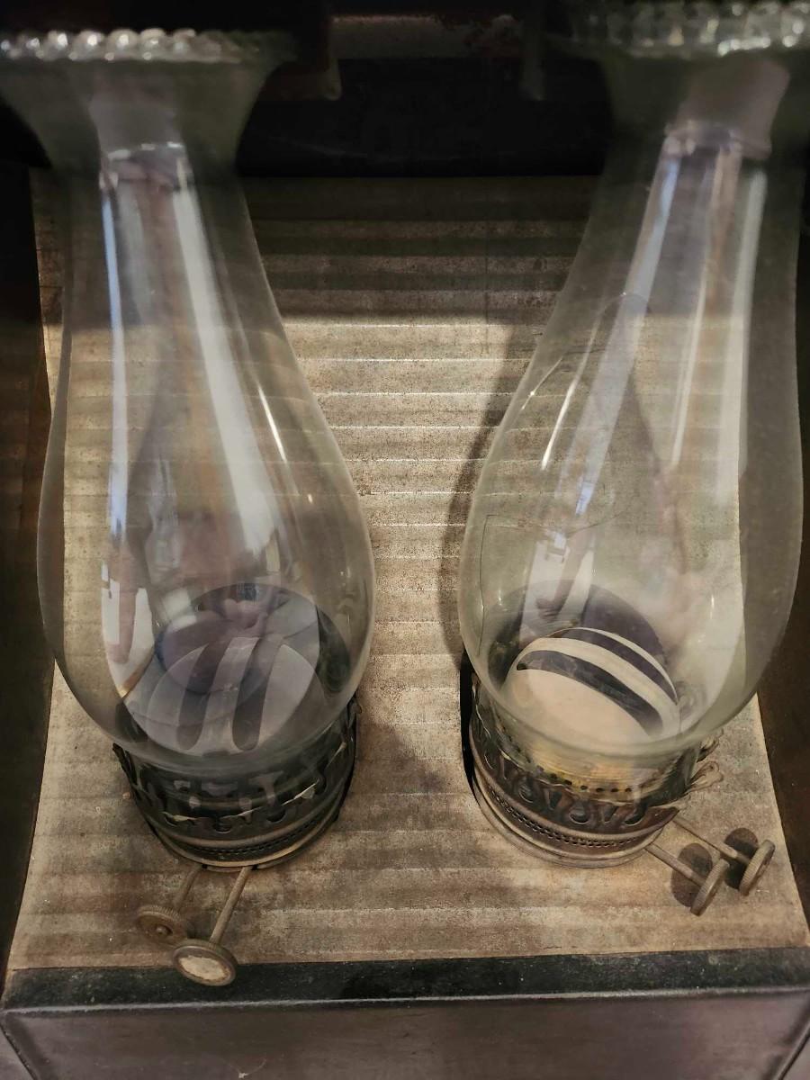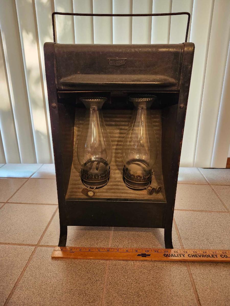 Unusual Antique Kerosene Lamp Heater. . A very nice early example! The outside is tin painted black. It shows use with some loss of paint on top. Each lamp has a double wick burner which is unusual. The unit measures 13 1/2" wide by 11" deep by 22" high. Has not been tested.