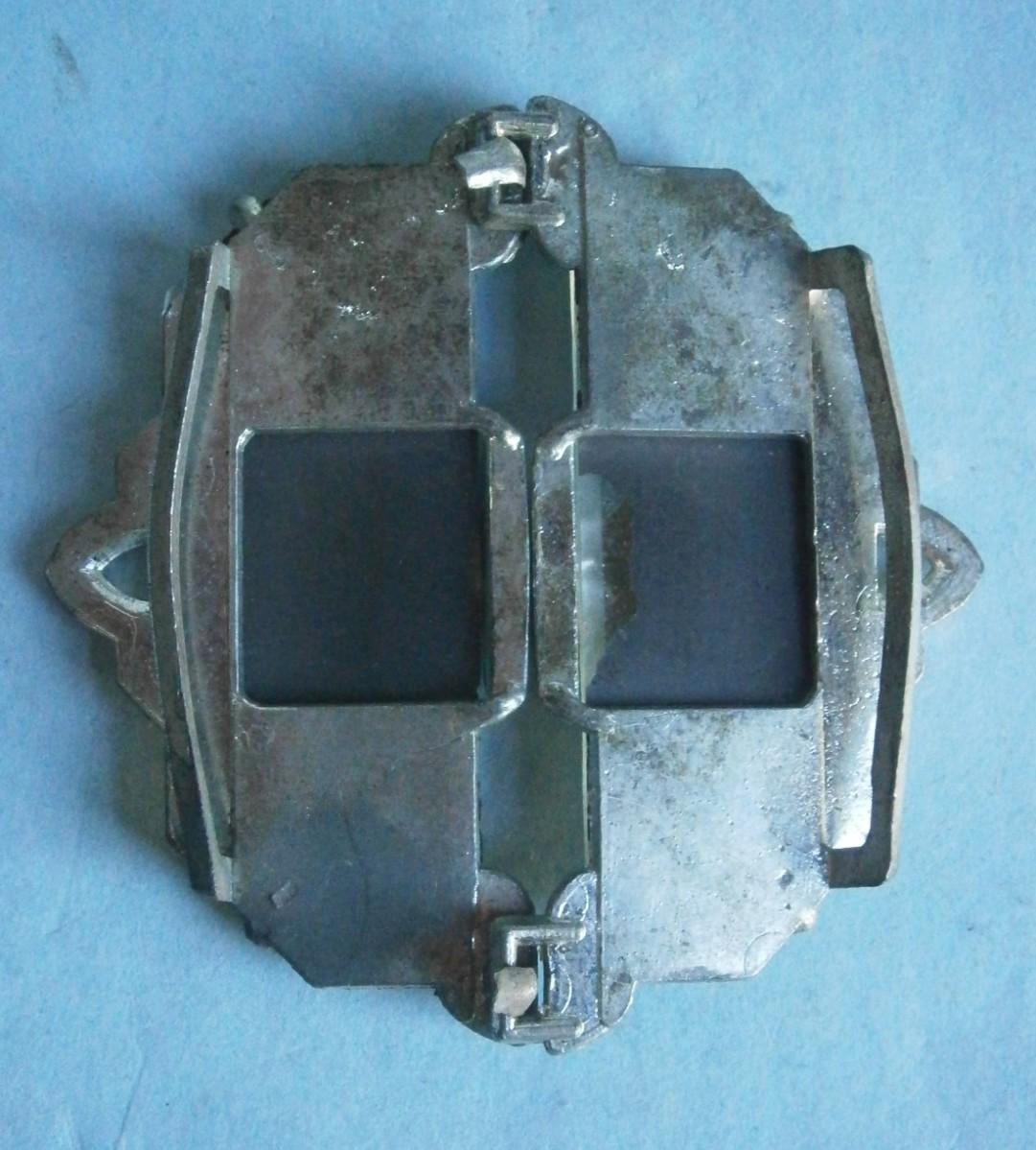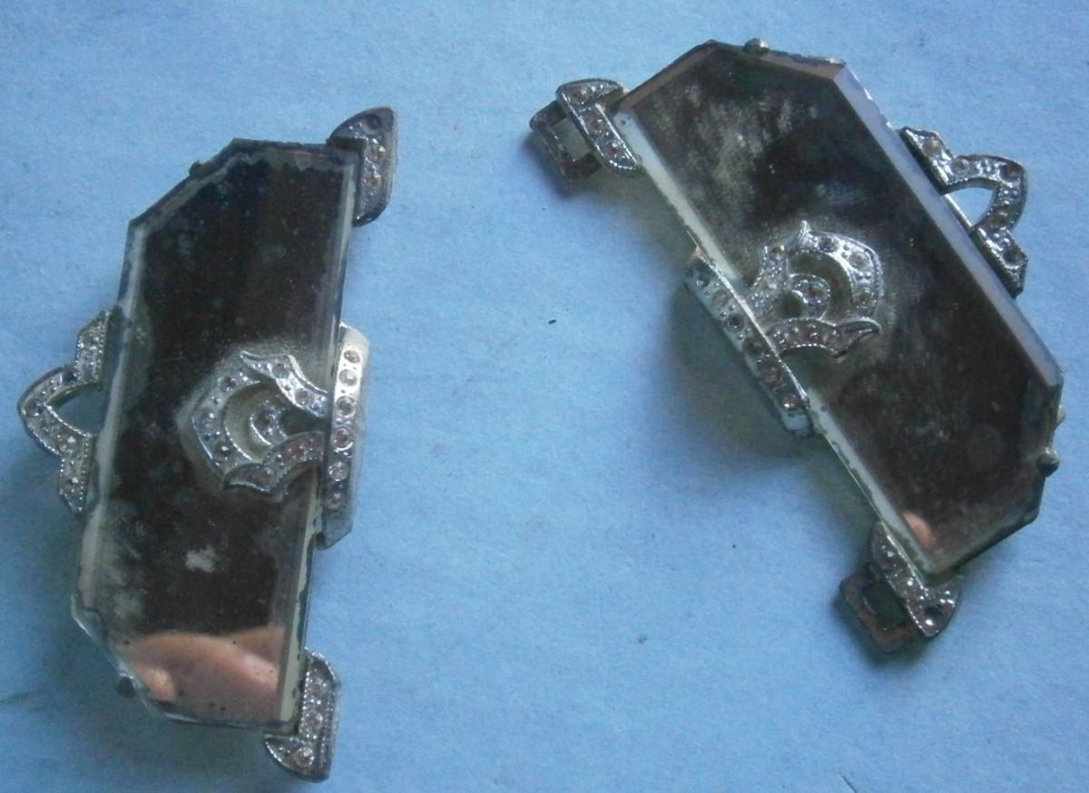 Unusual Art Deco Glass & Rhinestone Belt Buckle from the 1930's, 2 3/4 in. tall, metal with mirror panels decorated with rhinestones. Estimate $10-15