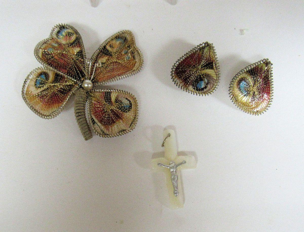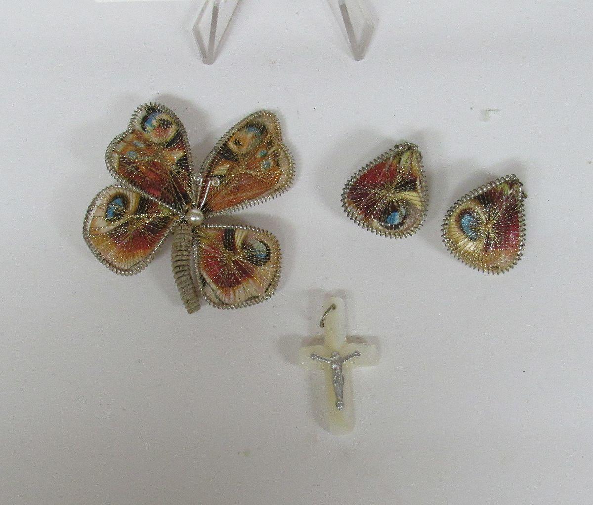Unusual Butterfly Pin and Wings Earrings Set and Mother of Pearl Cross Pendant