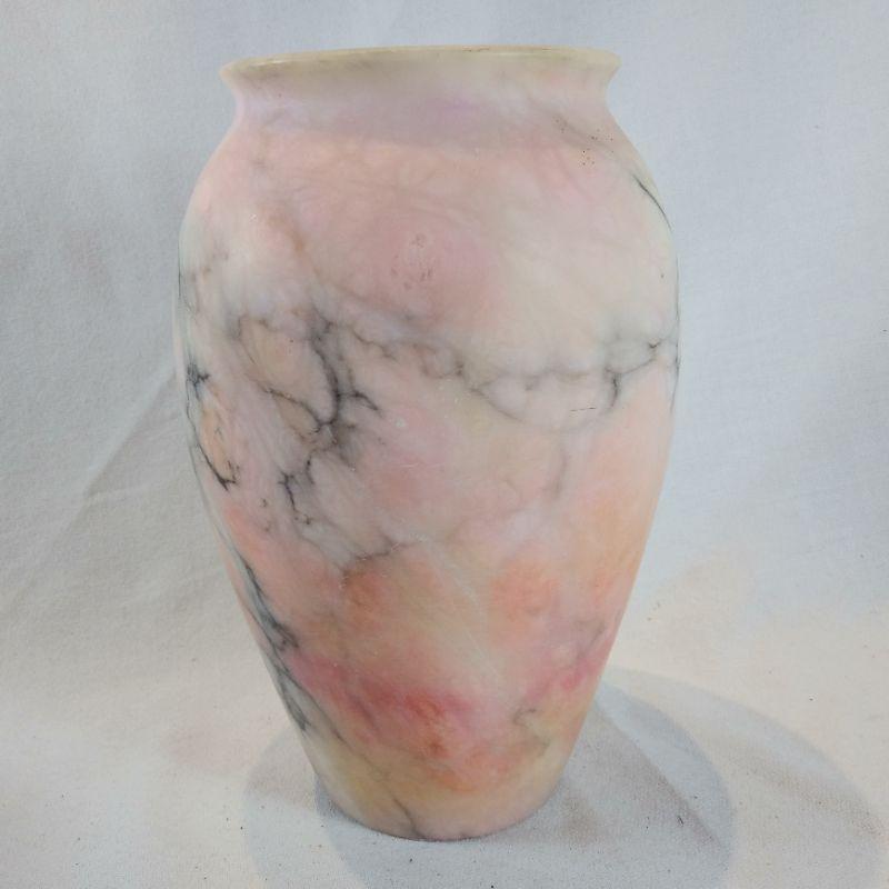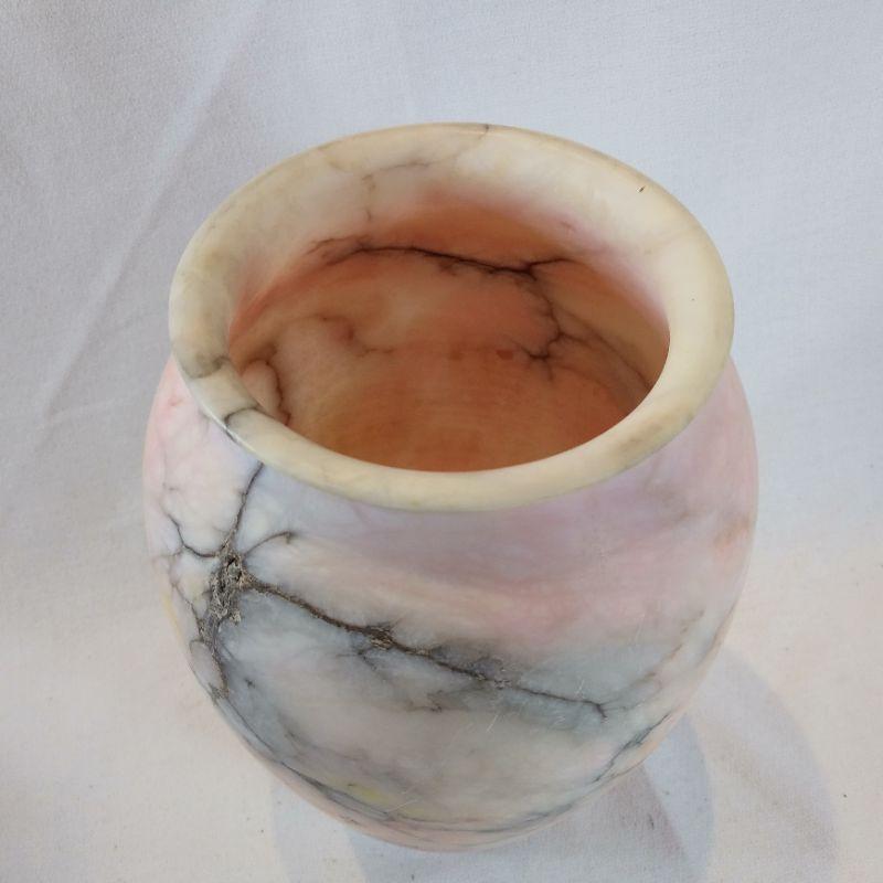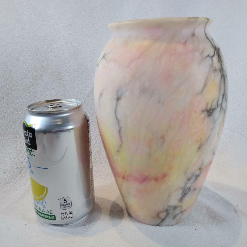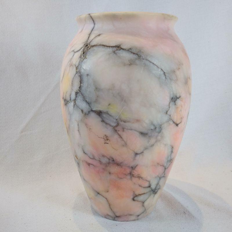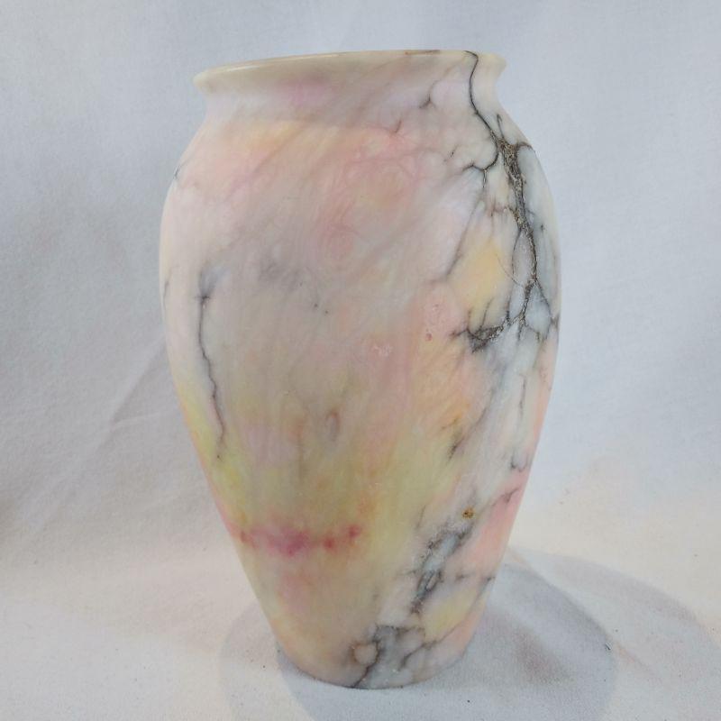 This is a colorful alabaster vase brought back from one of our clients many travels - Italy or Turkey? It's colors range from pink, yellow and ivory with black to grey veining. It's a heavy piece in very good condition. 8-inches tall X 5-inches in diameter. Will hold many flowers and/or good memories.