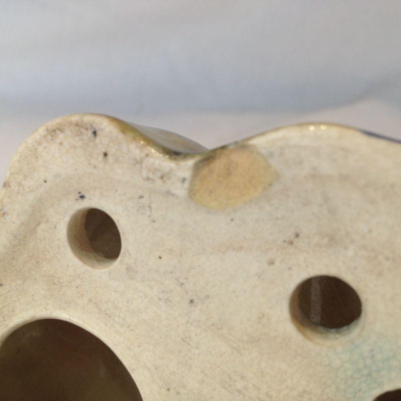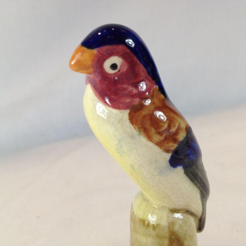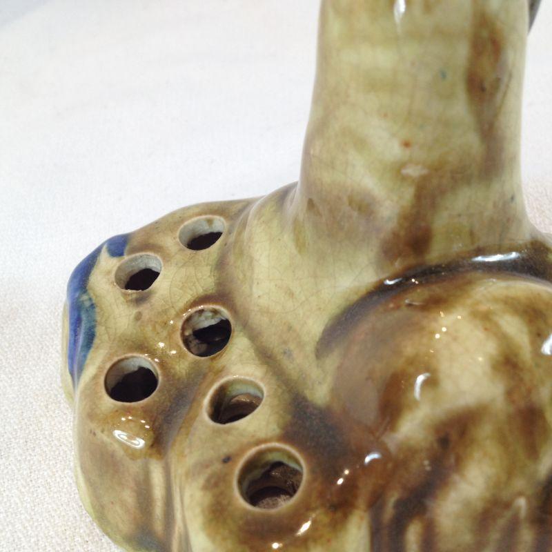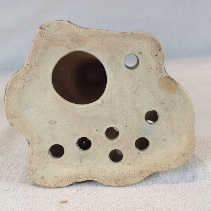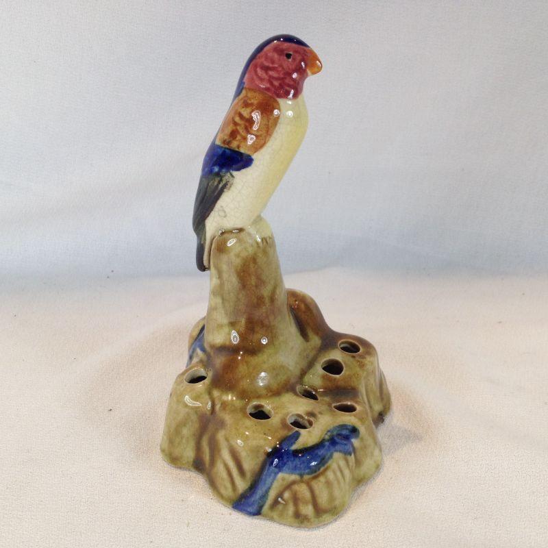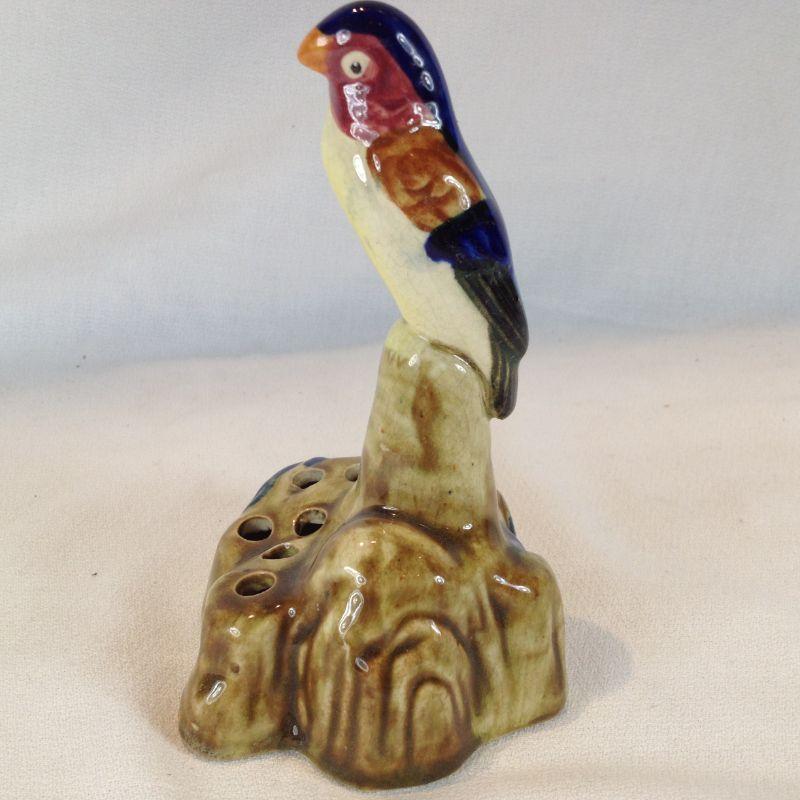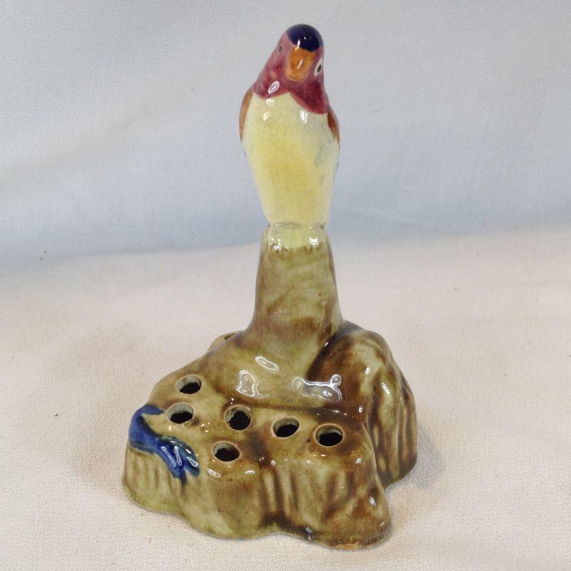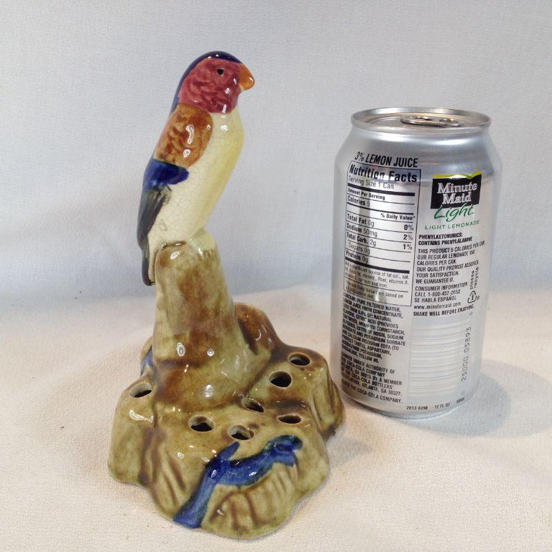 This is a very unique ceramic Parrot Flower Frog. So unusual and a great addition to a flower frog collection. It measures 6-inches tall X 4-inches wide X 3 1/2-inches deep. It has a very small chip that is only seen on the bottom - see last photo. Overall in very good condition for age and use.