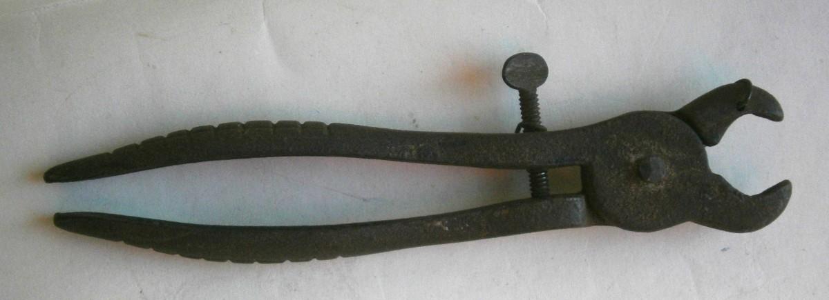 Unusual Patented Antique Locking Hog Ring Plyers, signed DE NEUI, cast iron with steel spring, 7 in. long.