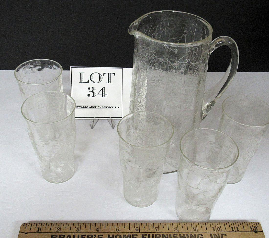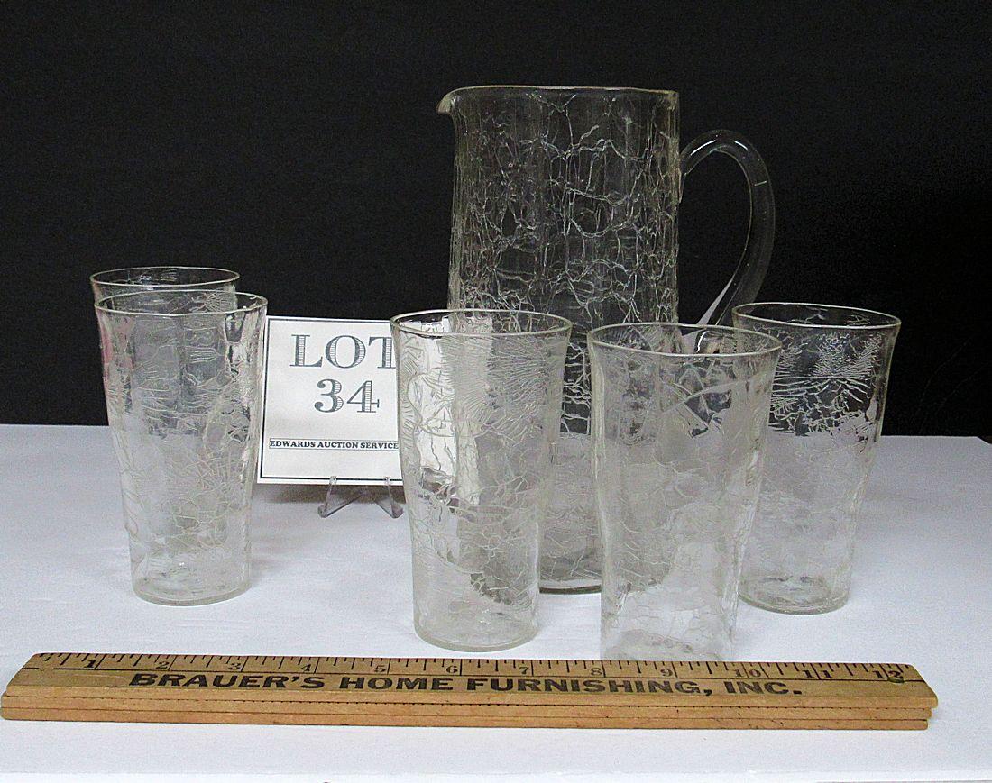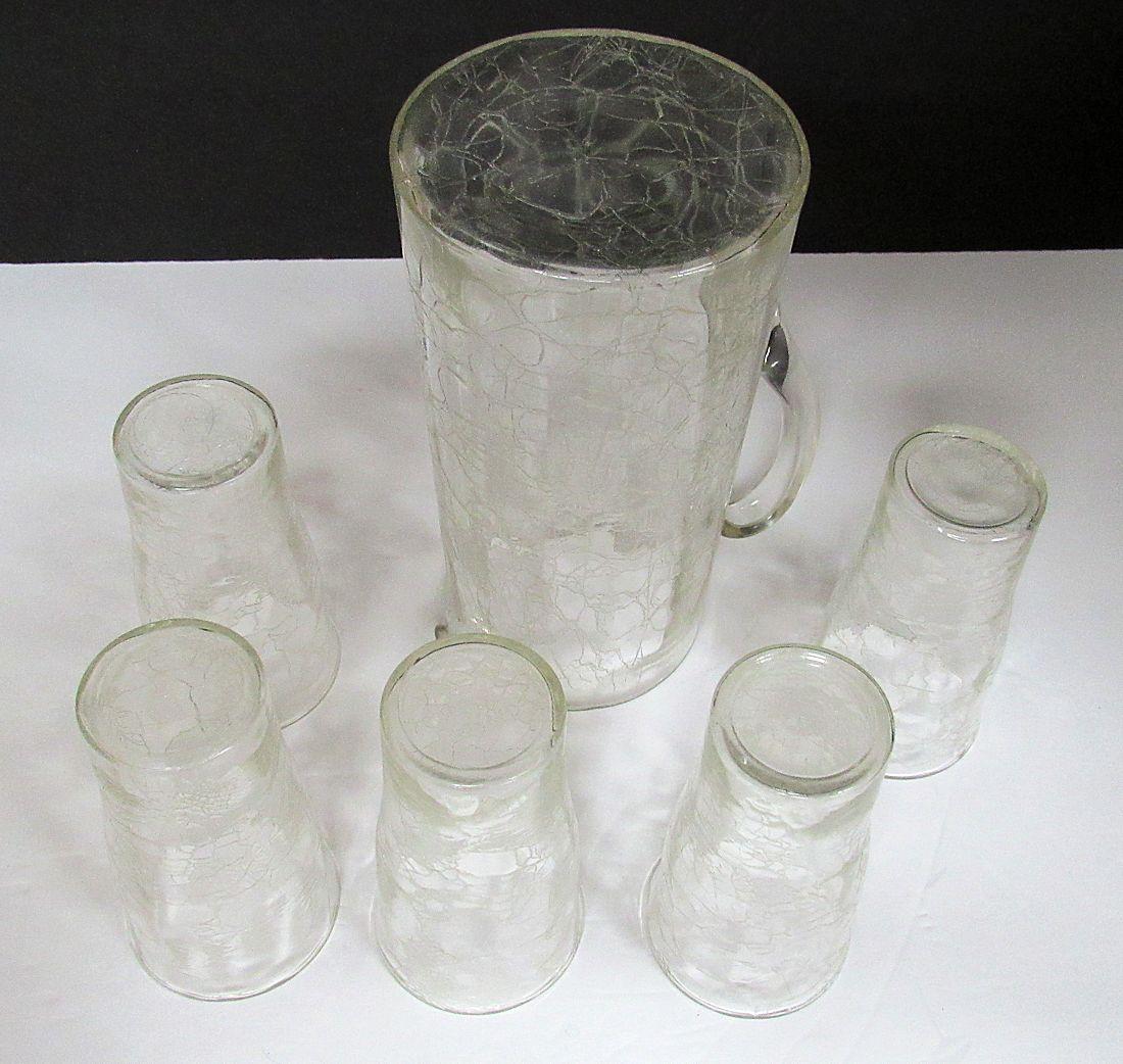 Unusual Style Vintage Crackle Glass Pitcher and Tumblers